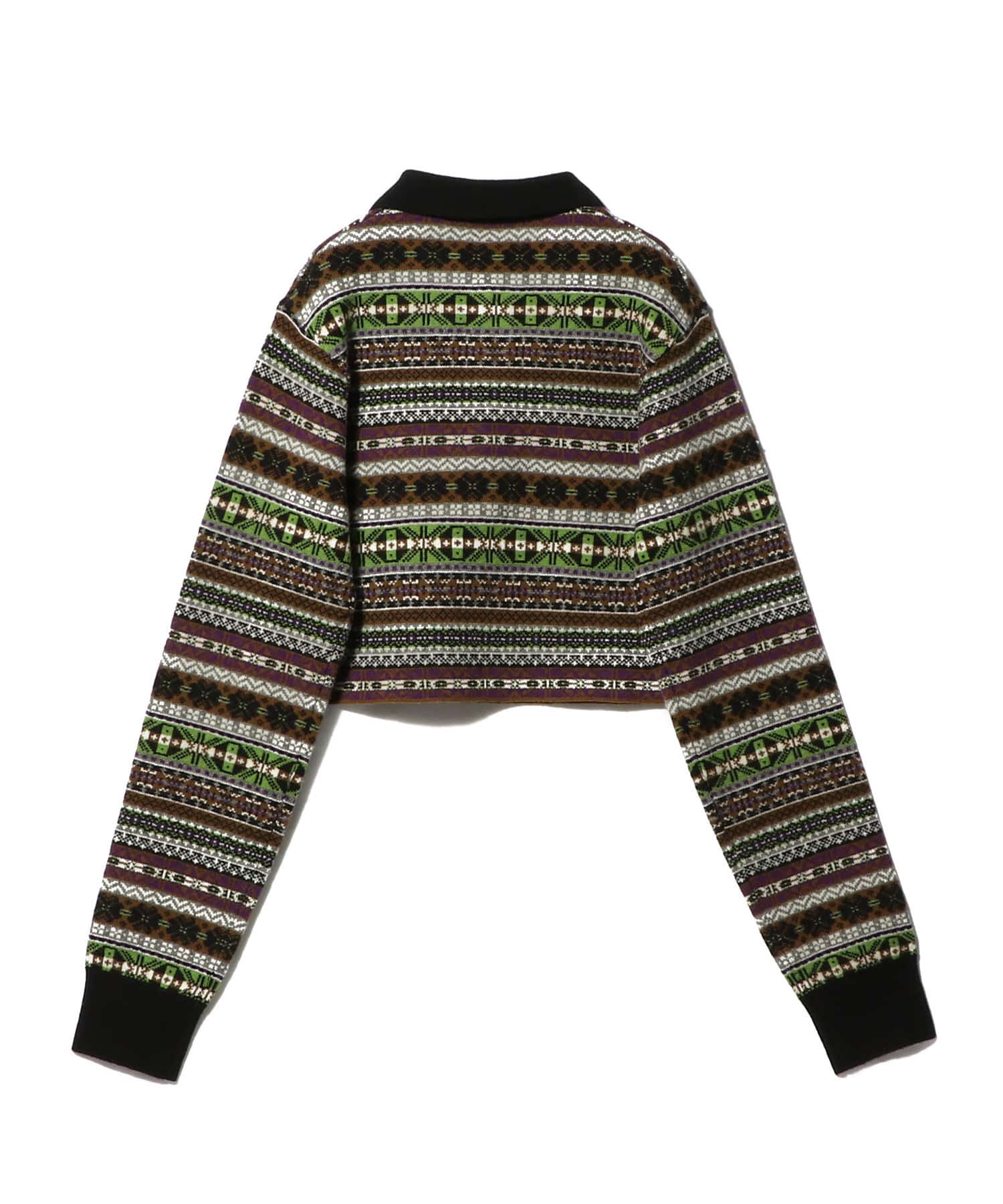 お祖父さんから引き継いだニットを、着丈を短くアレンジしたようなデザイン。ボトムも合わせやすく、シャツやタートルなどをレイヤードしたり、インパクトのある柄なのでストールのように肩にかけたりとスタイリングを楽しめる1着です。