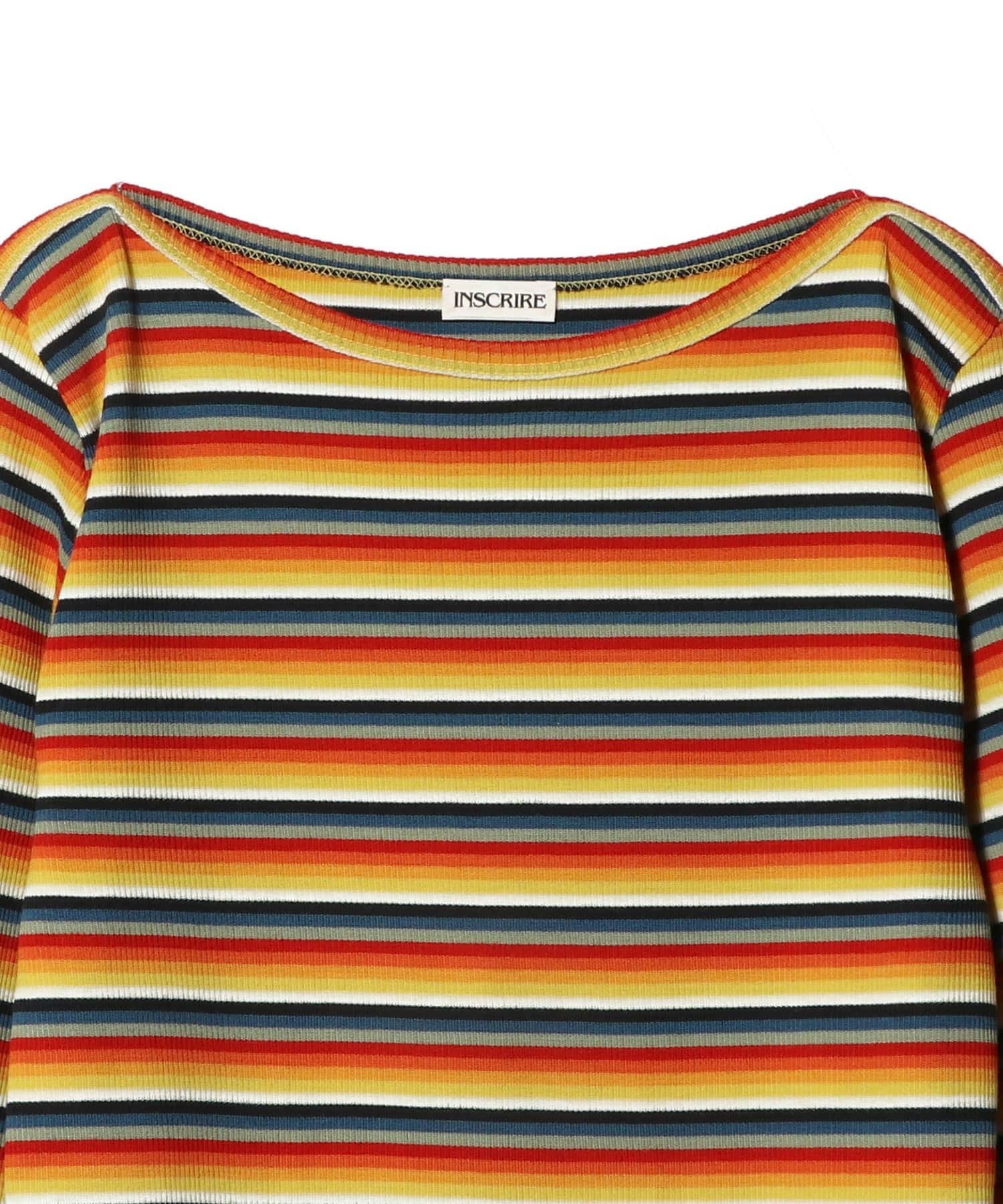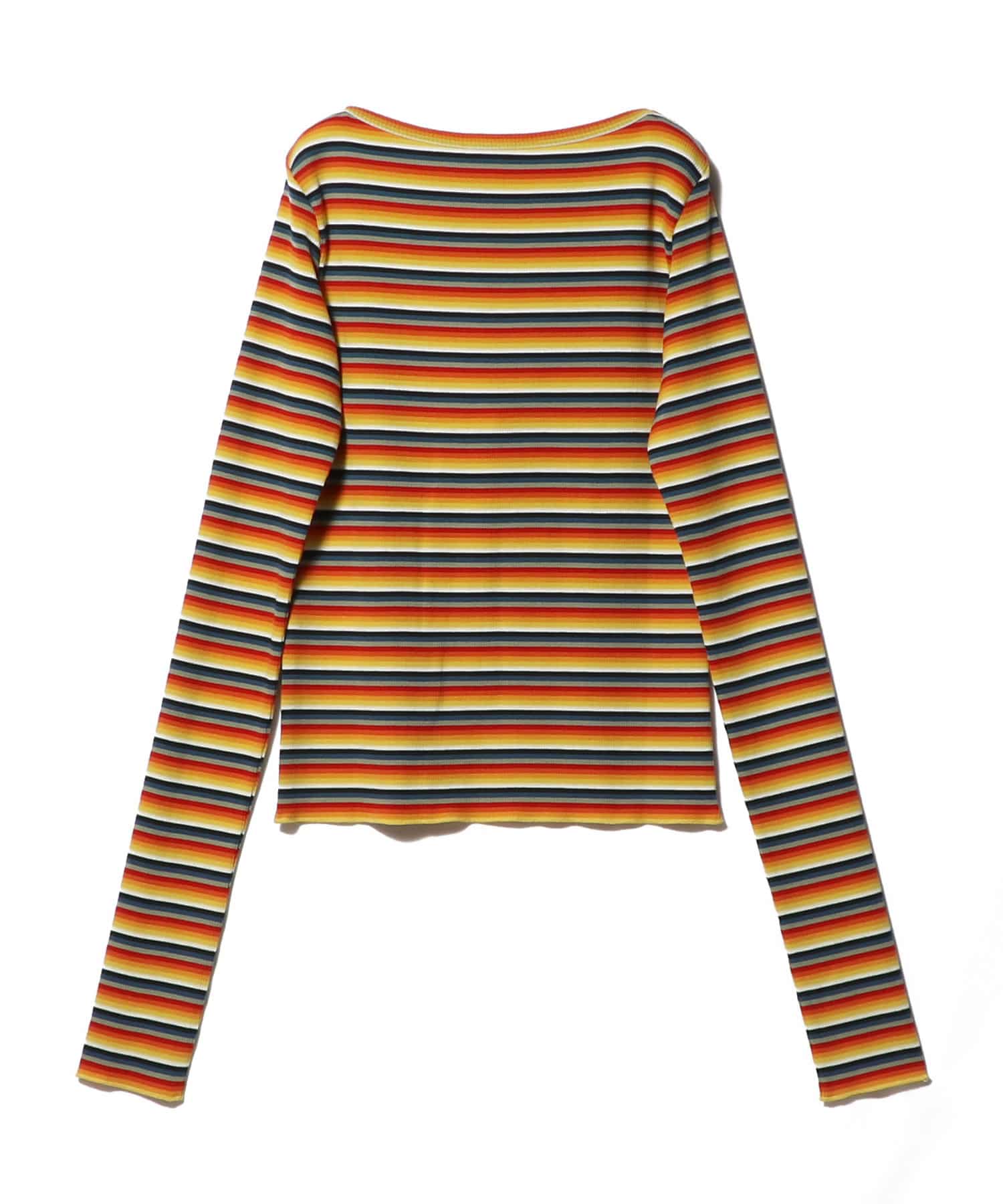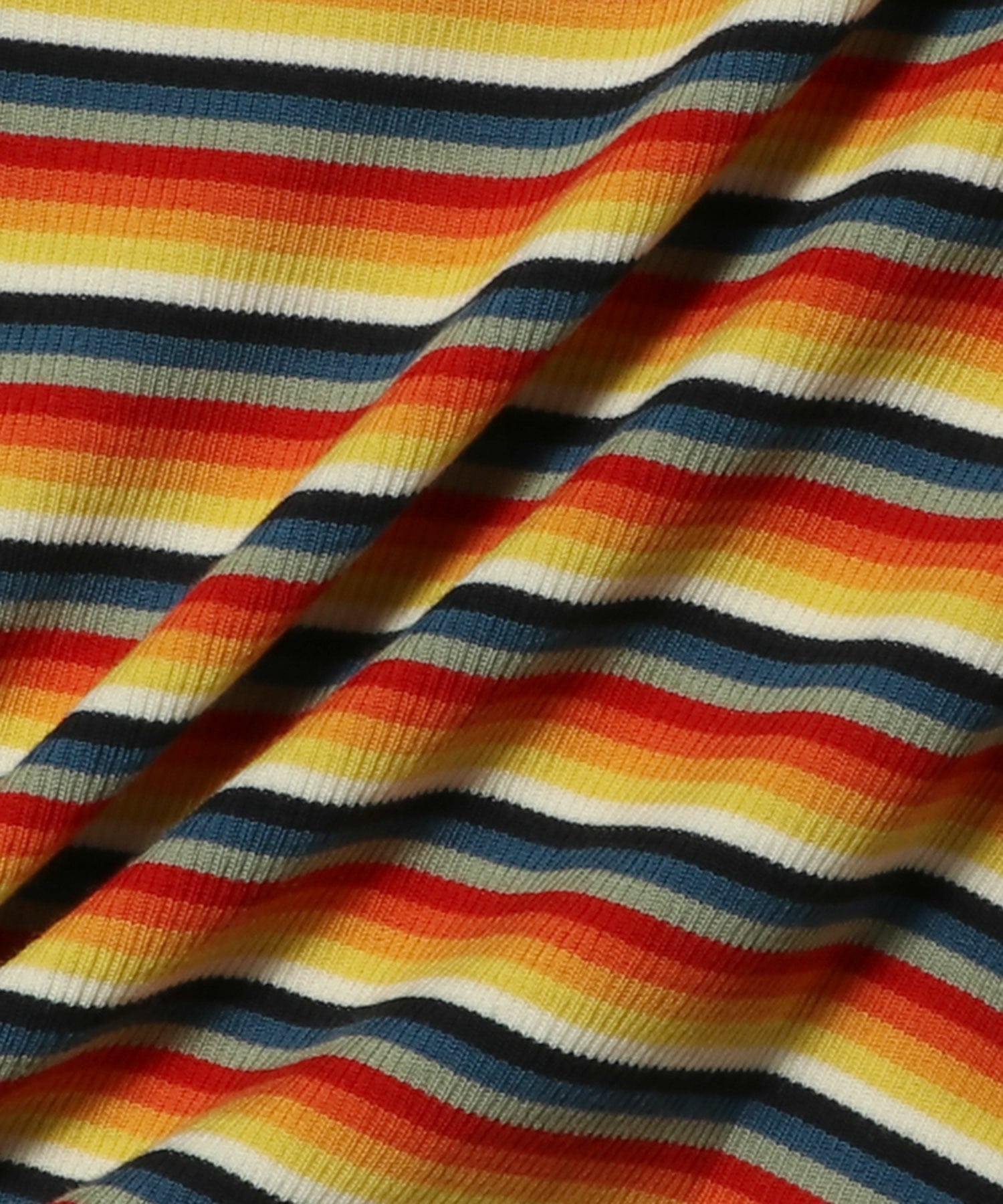 鮮やかなカラーリングが映えるマルチボーダー柄のニット。