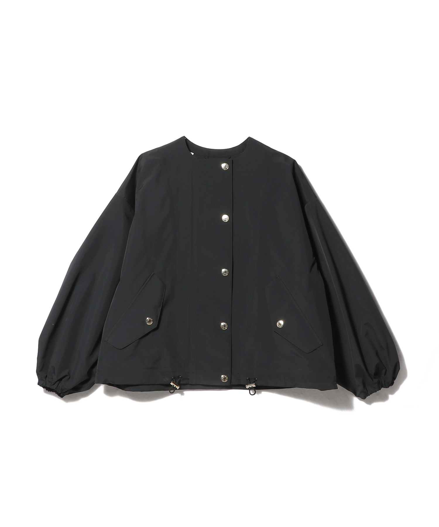 ドロップショルダーとパフスリーブが特徴のAラインノーカラーショートブルゾン。