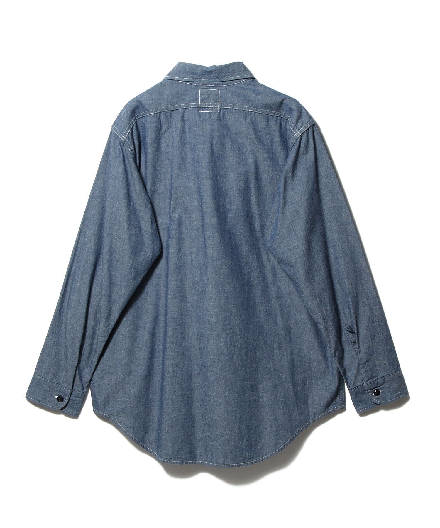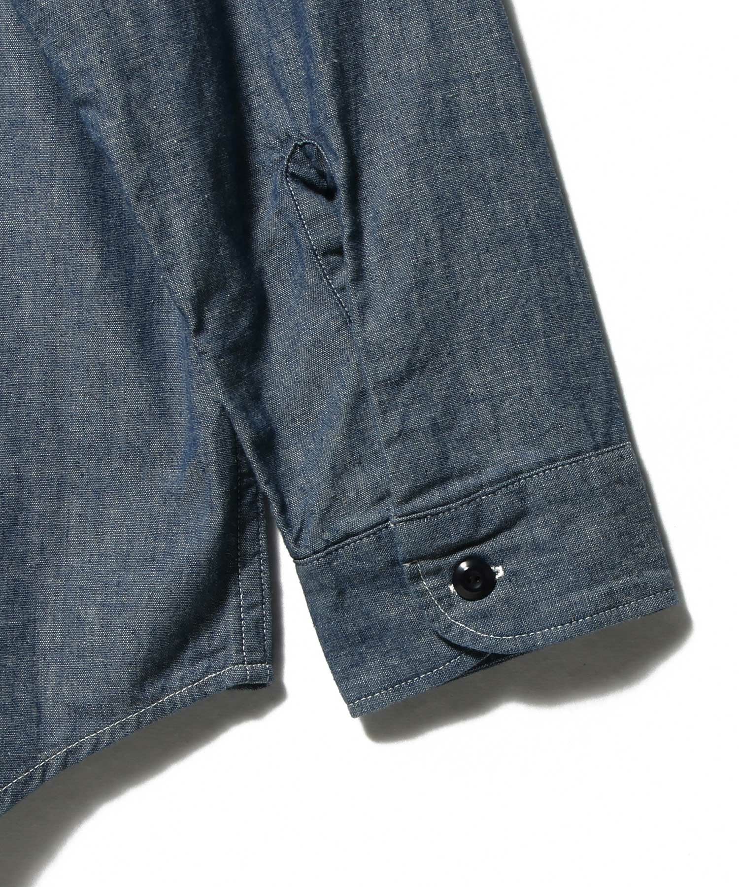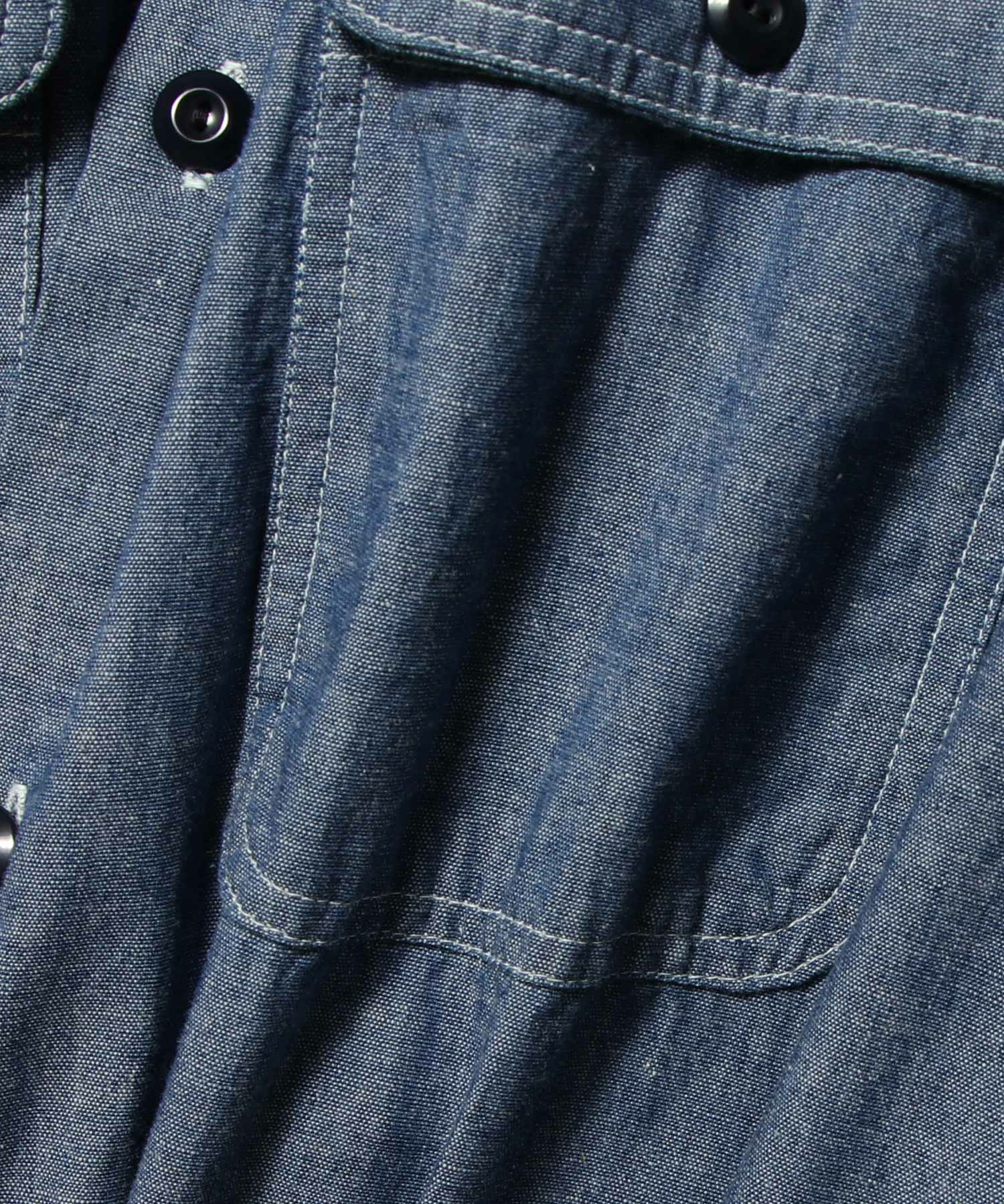 ワークウェアのディテールを踏襲し、パッチ&フラップポケットやペン挿し付きの左胸、5mm幅のダブルステッチ脇線、剣ボロのいってこい始末など、こだわりが詰まった一着。