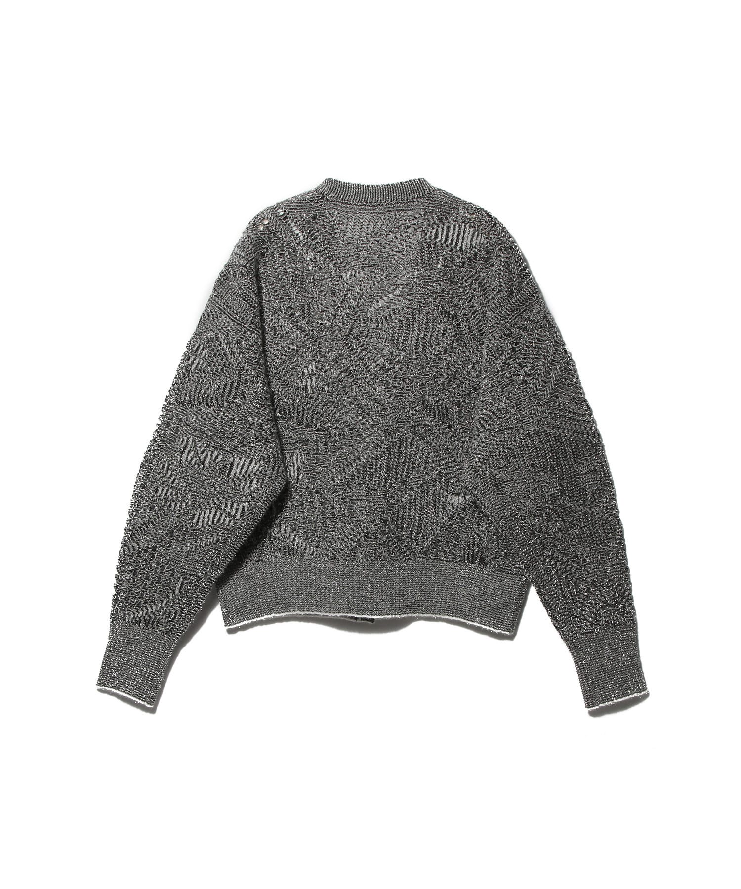 構築的な柄の中に、やわらかく儚げな印象を宿し、センシュアルなローゲージの透け感が装いに軽やかさをプラス。