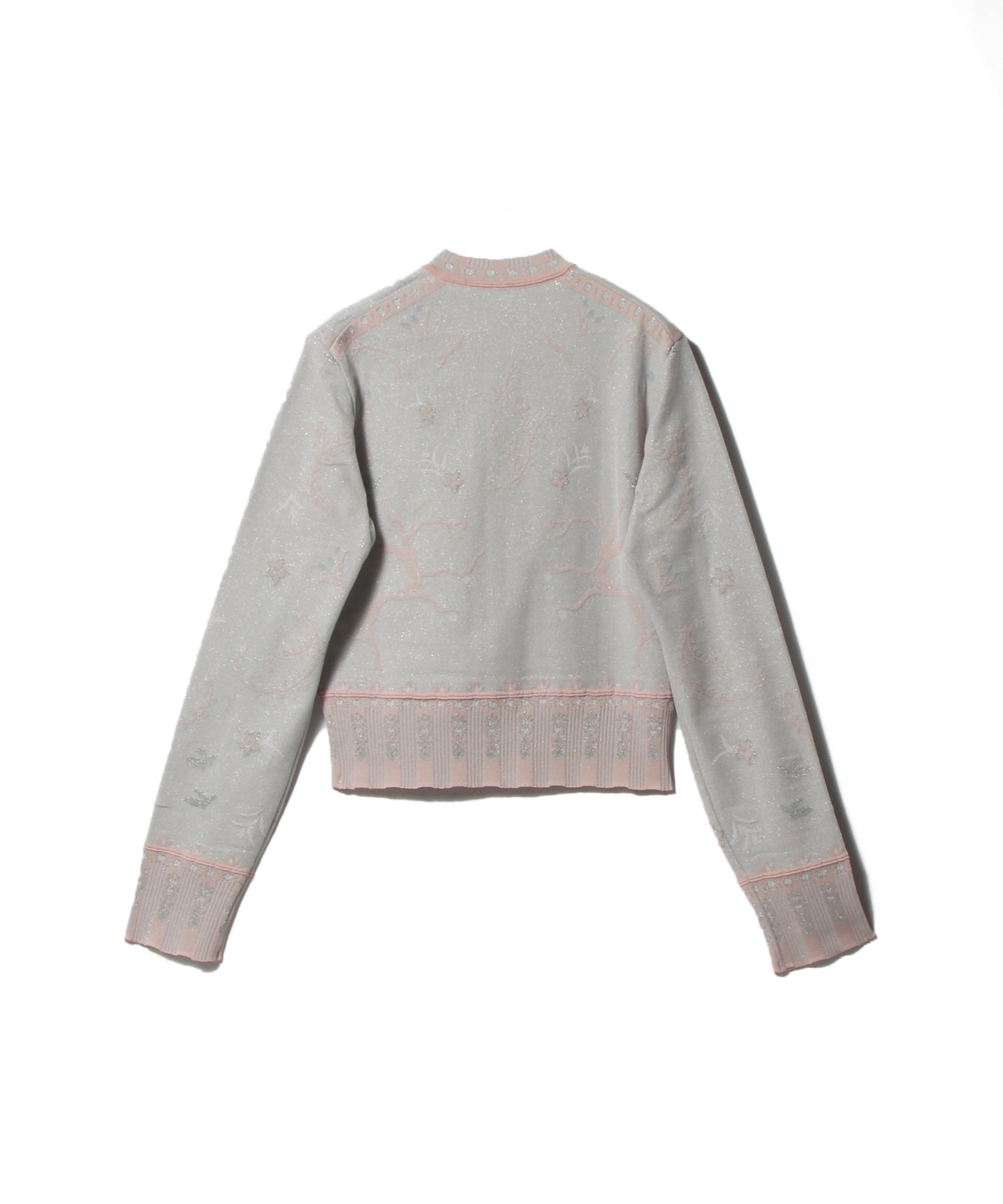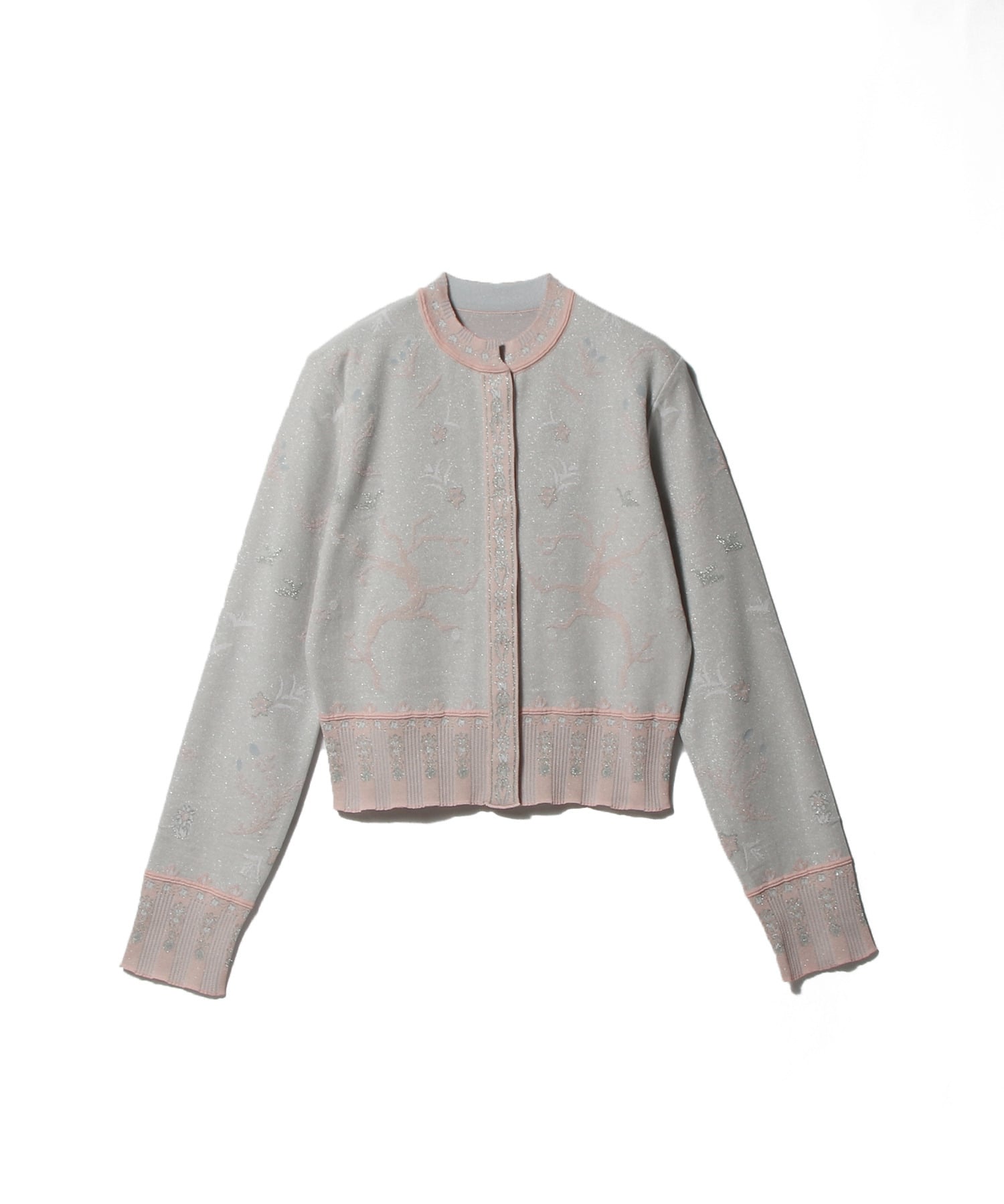 ガラスに絵付けを施したような繊細な柄と透け感が美しいニットカーディガン。