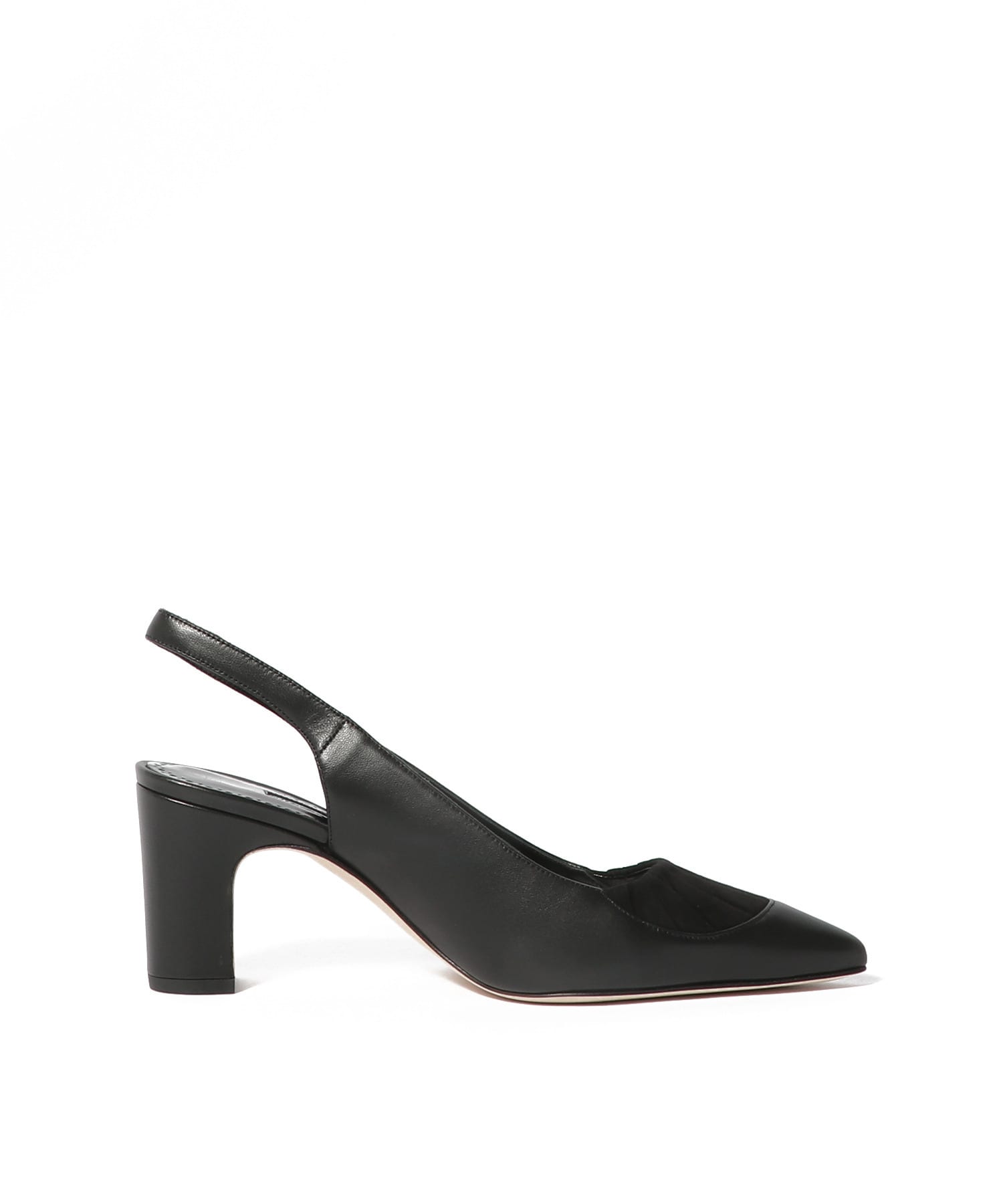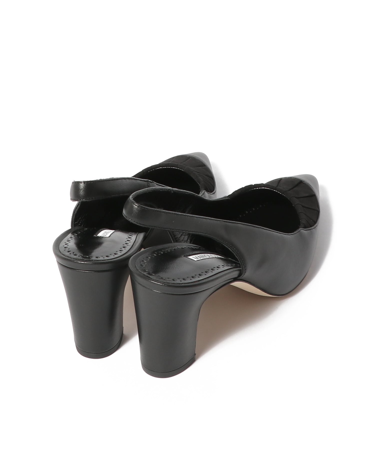 プリーツスエードのディテールとスリングバックデザインが特徴です。ブロックミッドヒールで仕上げられています。