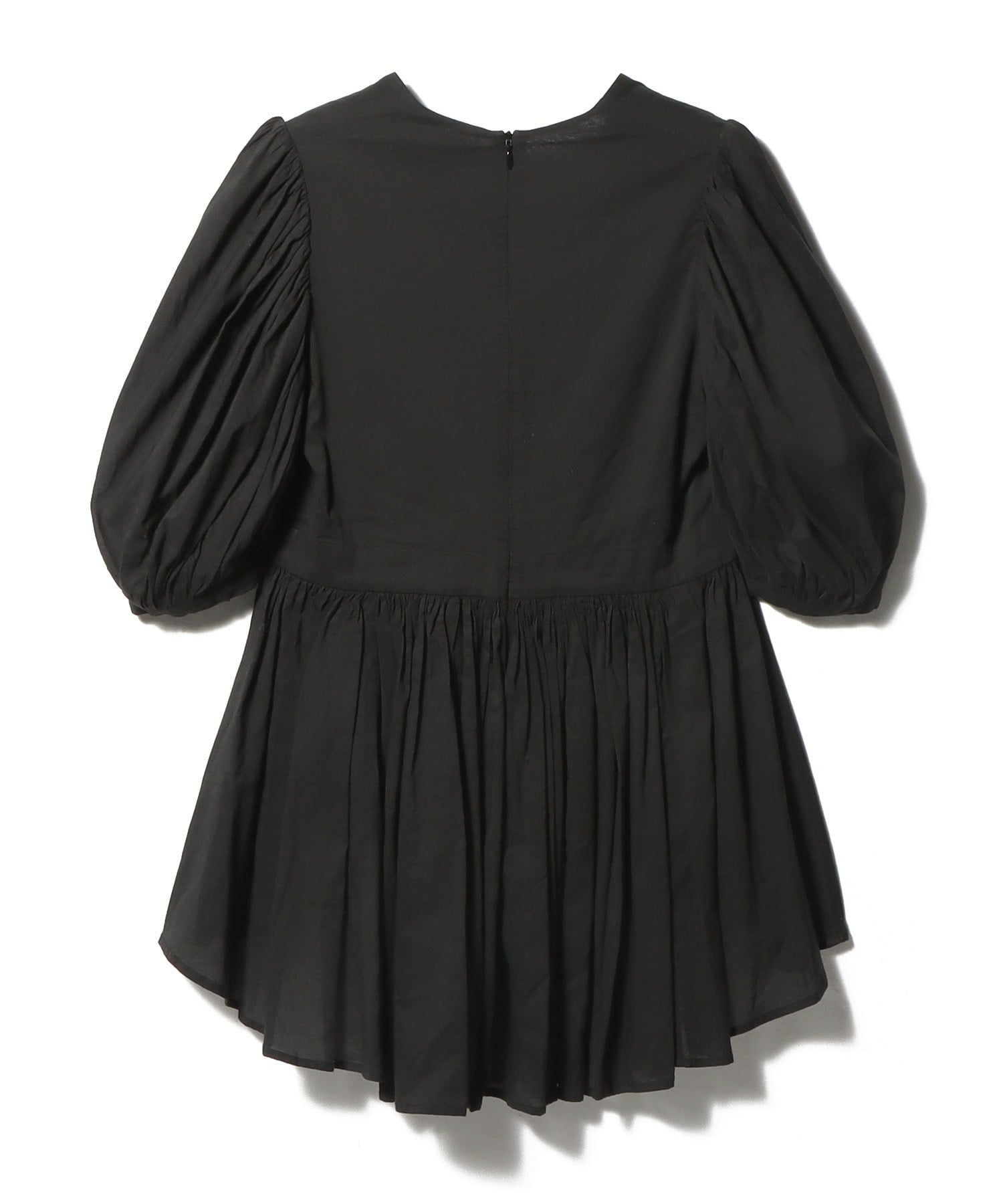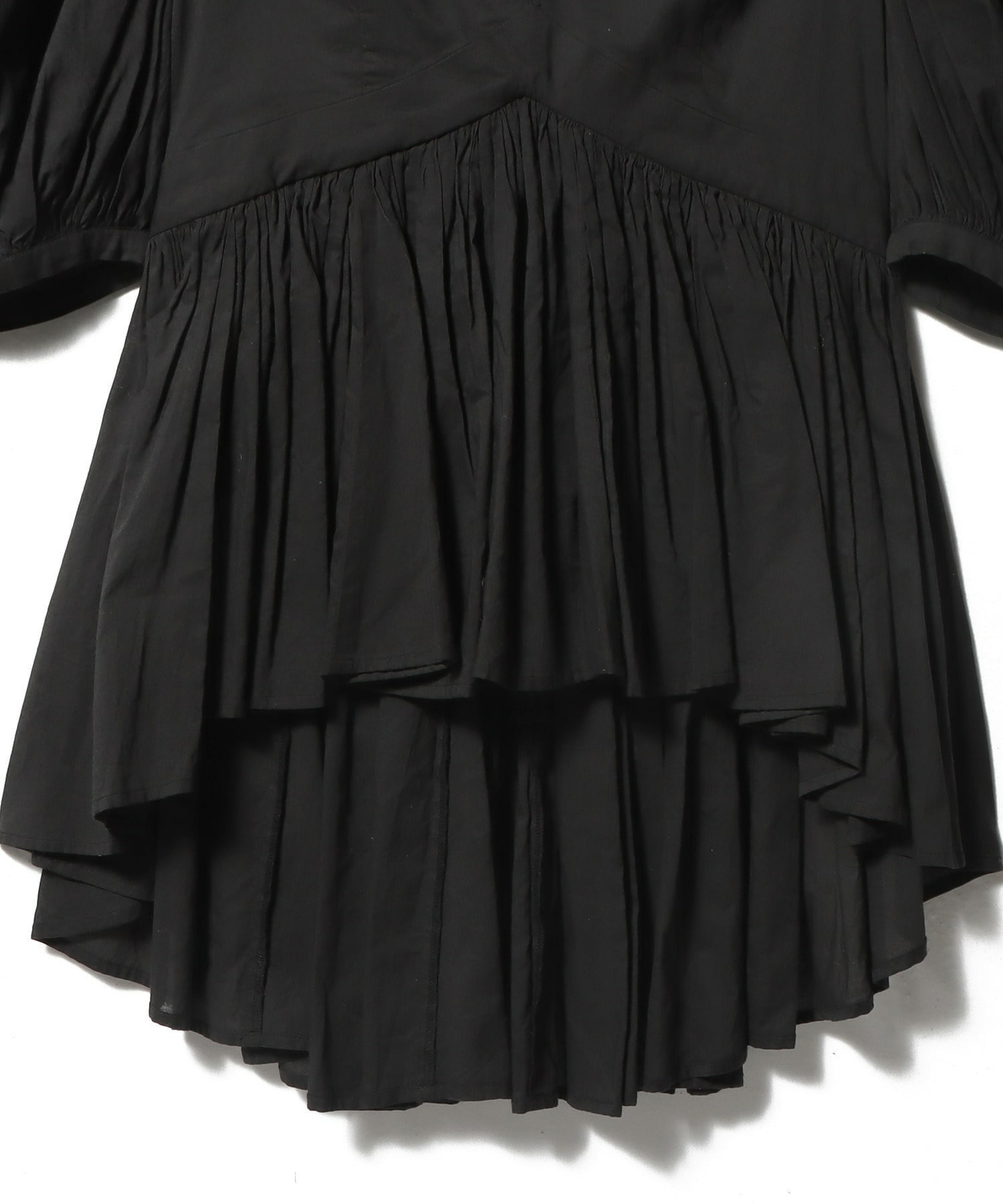 ウエストやヒップ周りが隠れるようにふんわりと広がる前後アシメトリーの裾や、ウエストを細く見せる切り替えのデザインブラウス。