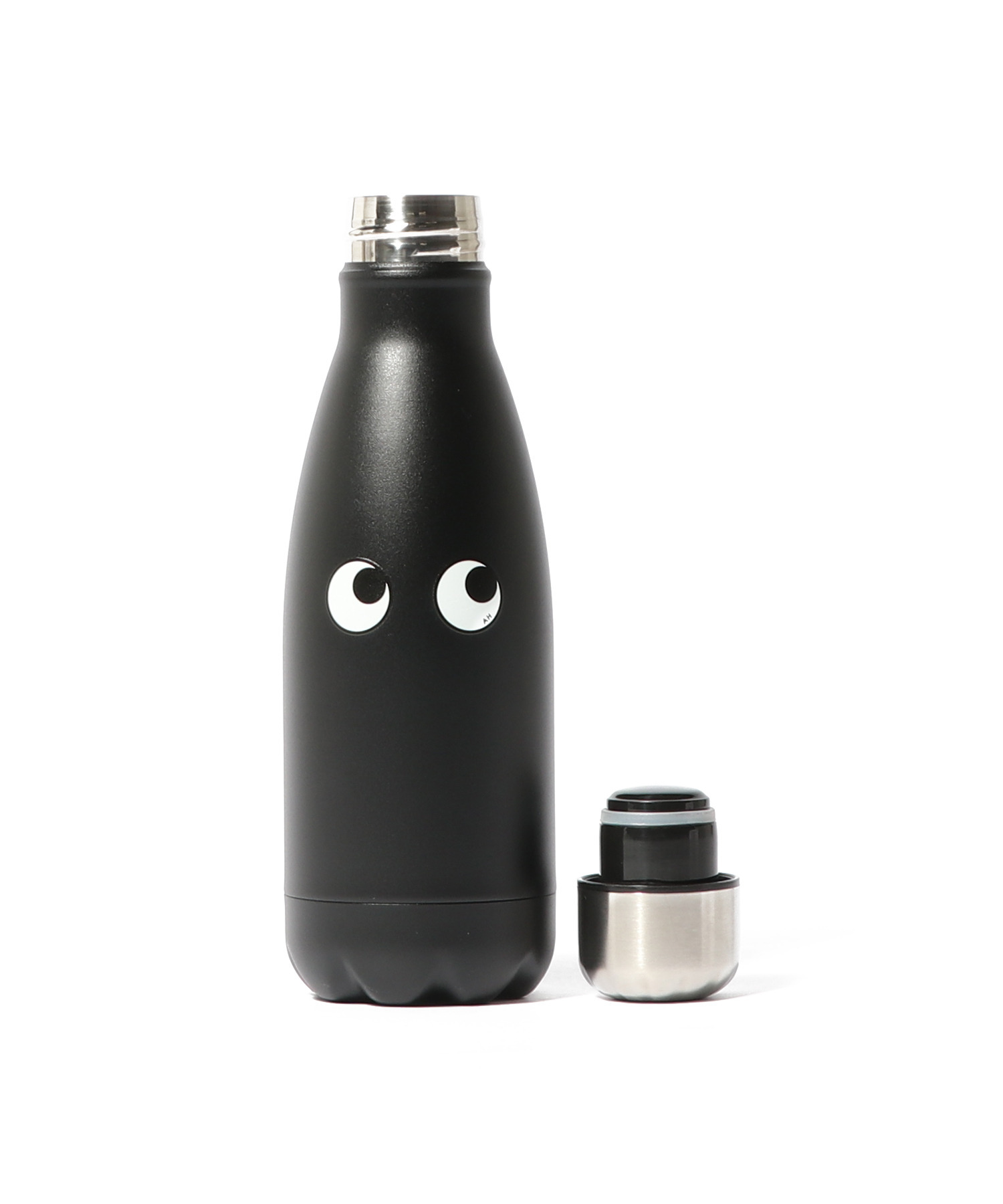 マットな黒地にアイコニックなアイデザインを施したスモールウォーターボトル。
