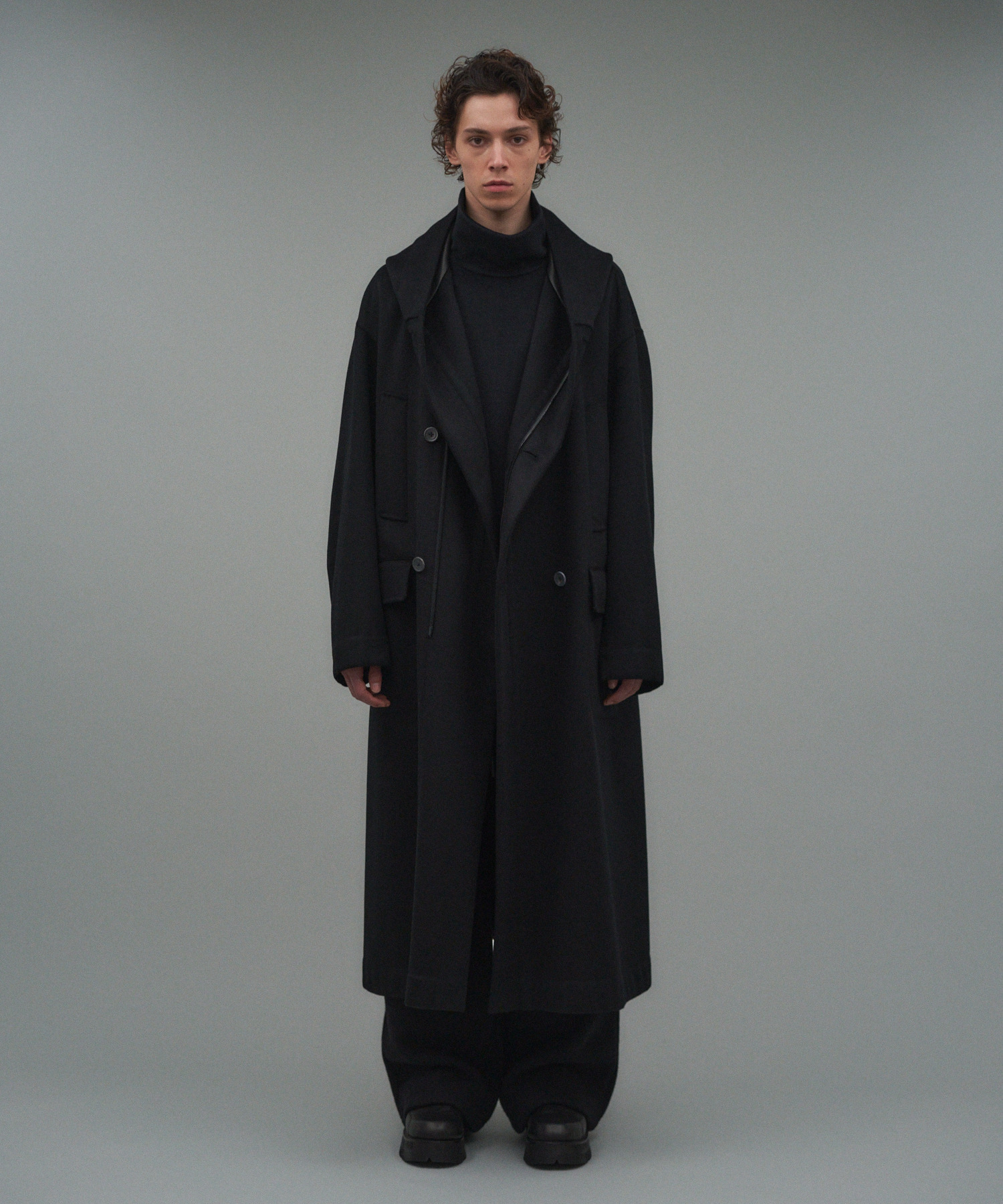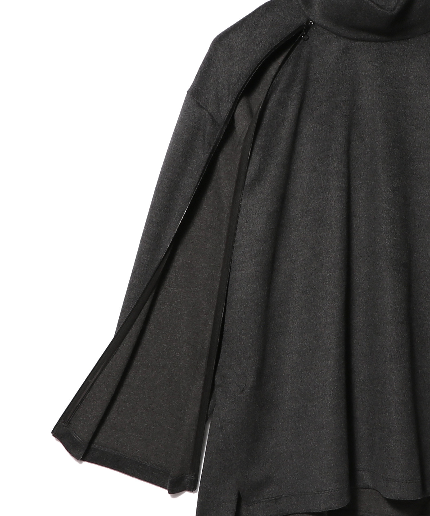 袖先が開くデザインが特徴で、開くとケープのような見え方にもなるユニークな一着。