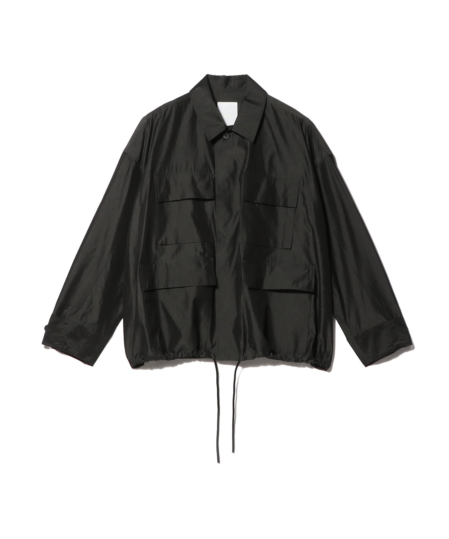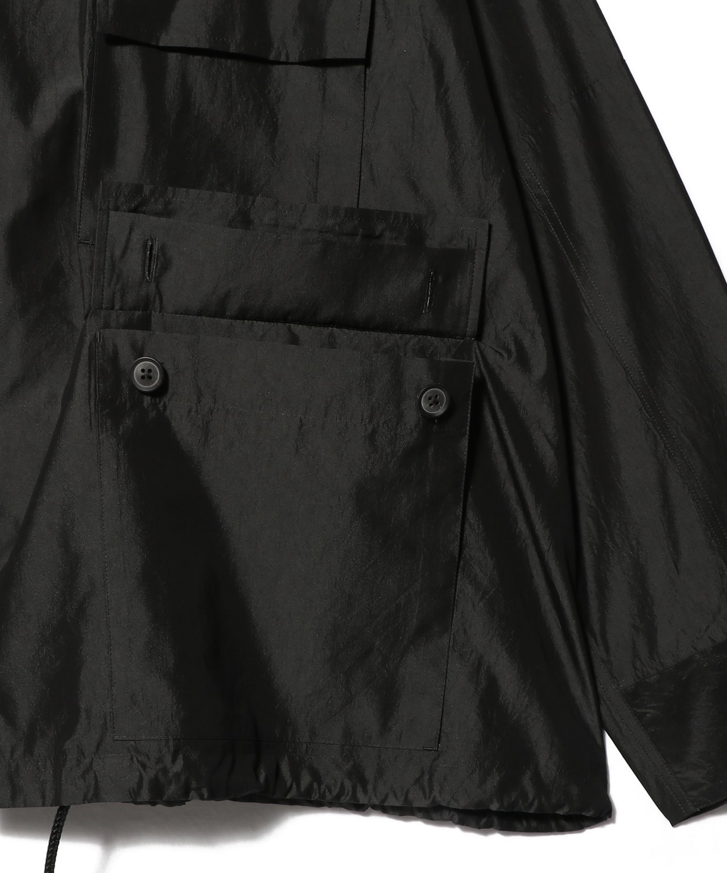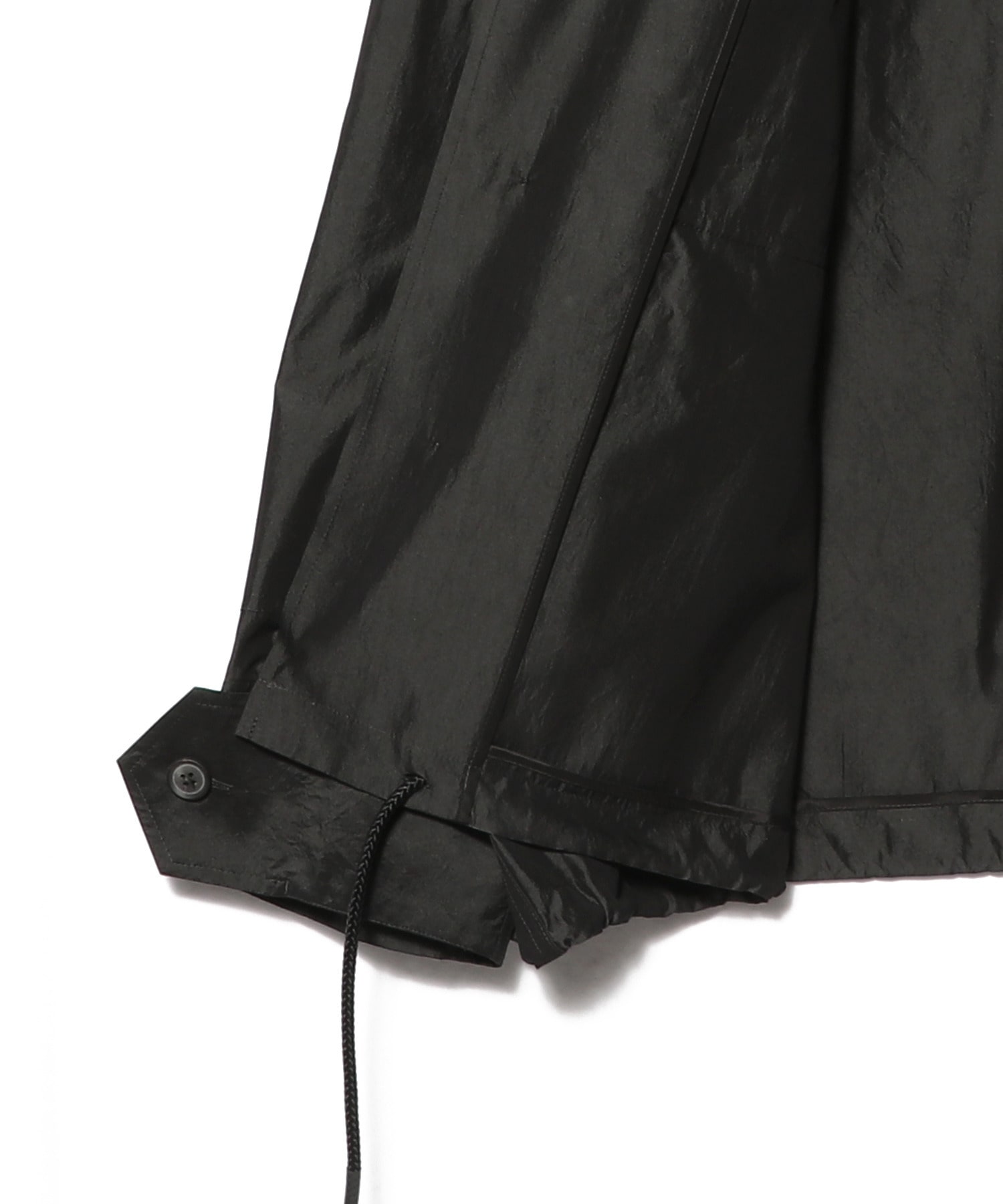 使用している生地は光沢感と繊細な透け感があり、シャリ感が肌触りのよさと清涼感を引き立てます。通気性に優れているため夏でも快適に着用でき、独特のシワ感がこなれた印象をプラスします。フロントに配したポケットや裾のドローコードがデザインのアクセントに。