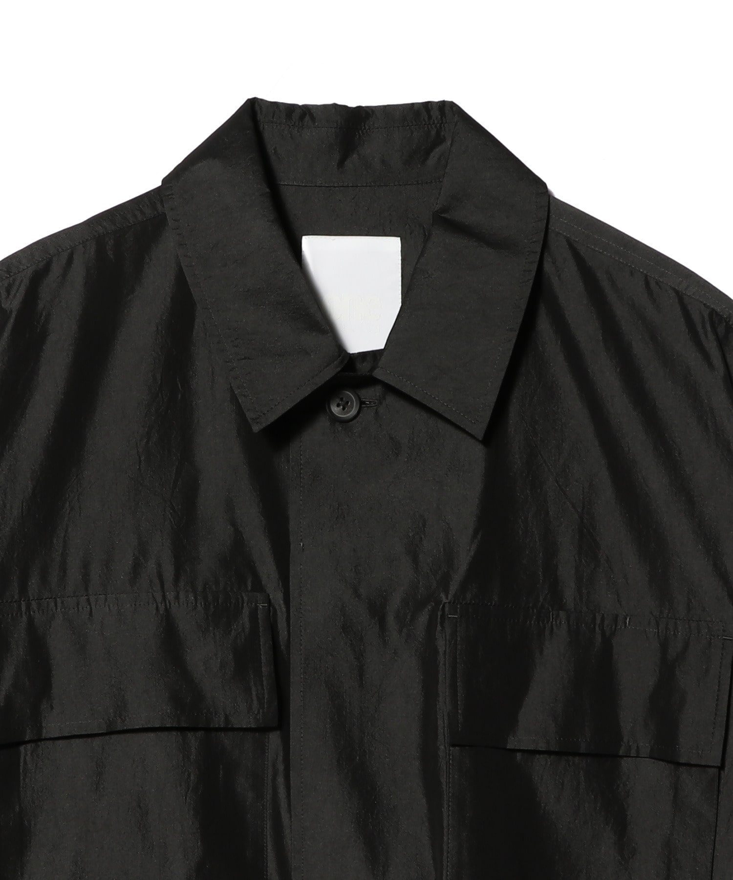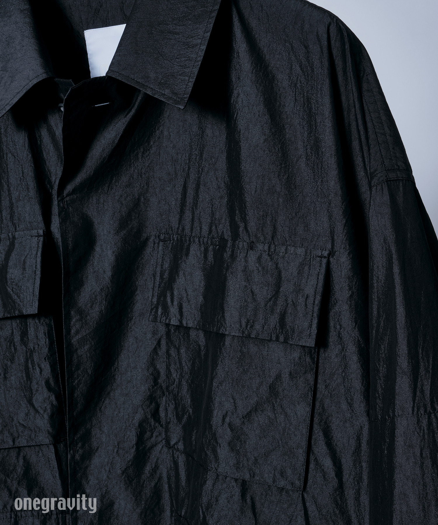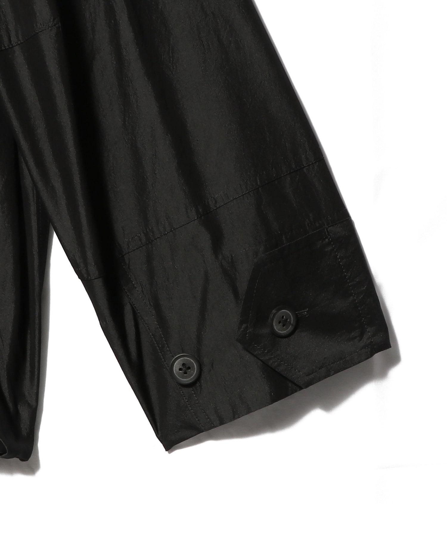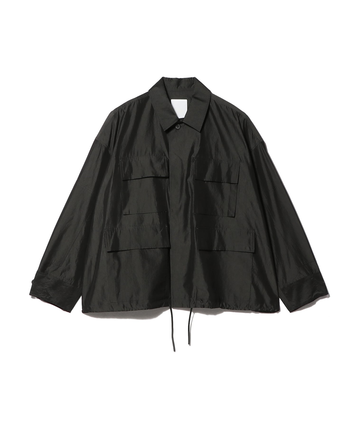 使用している生地は光沢感と繊細な透け感があり、シャリ感が肌触りのよさと清涼感を引き立てます。通気性に優れているため夏でも快適に着用でき、独特のシワ感がこなれた印象をプラスします。フロントに配したポケットや裾のドローコードがデザインのアクセントに。