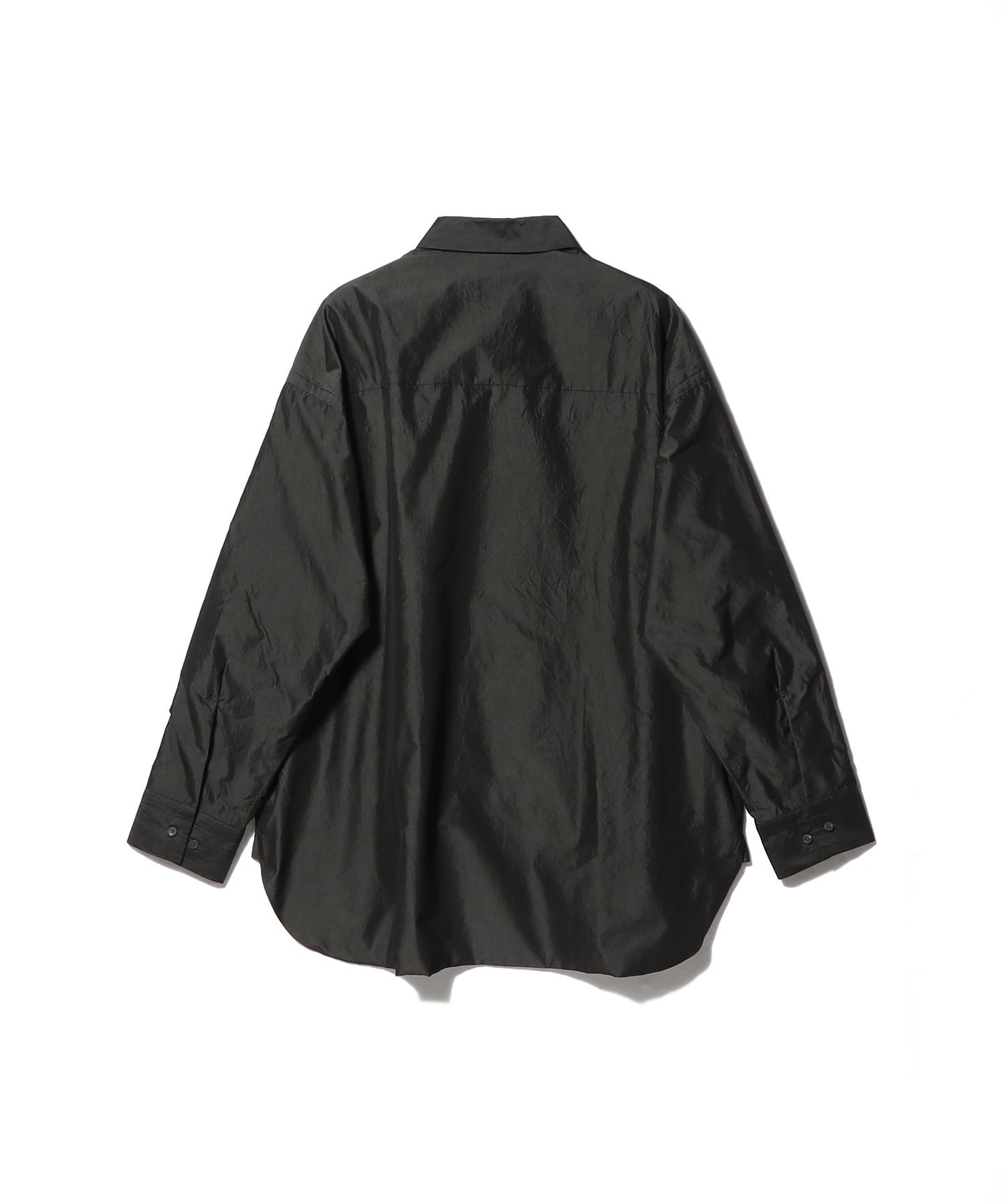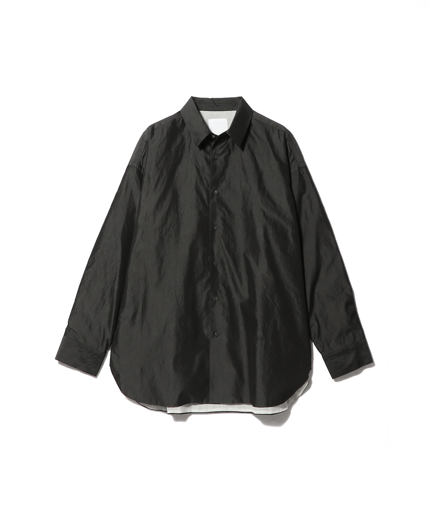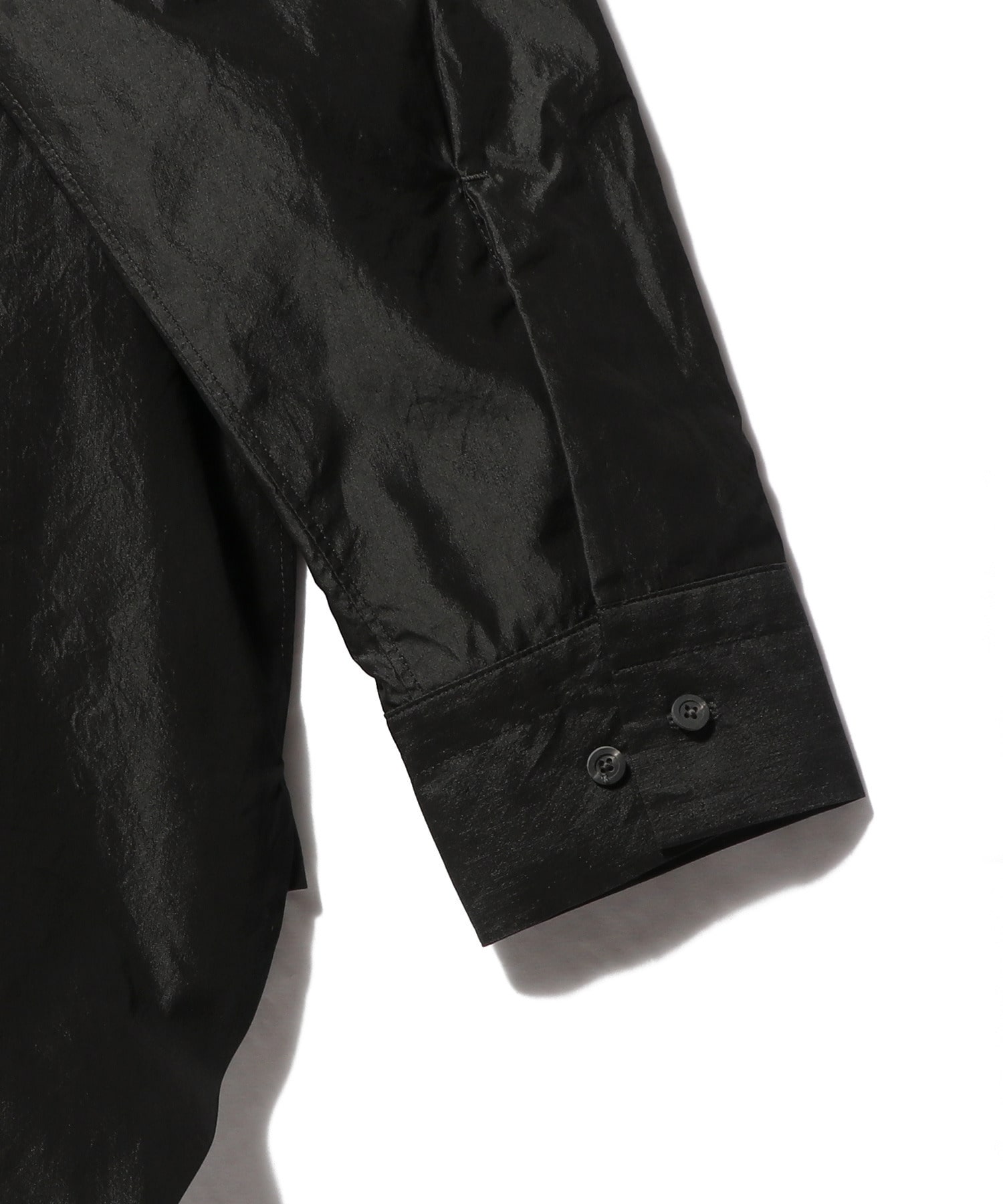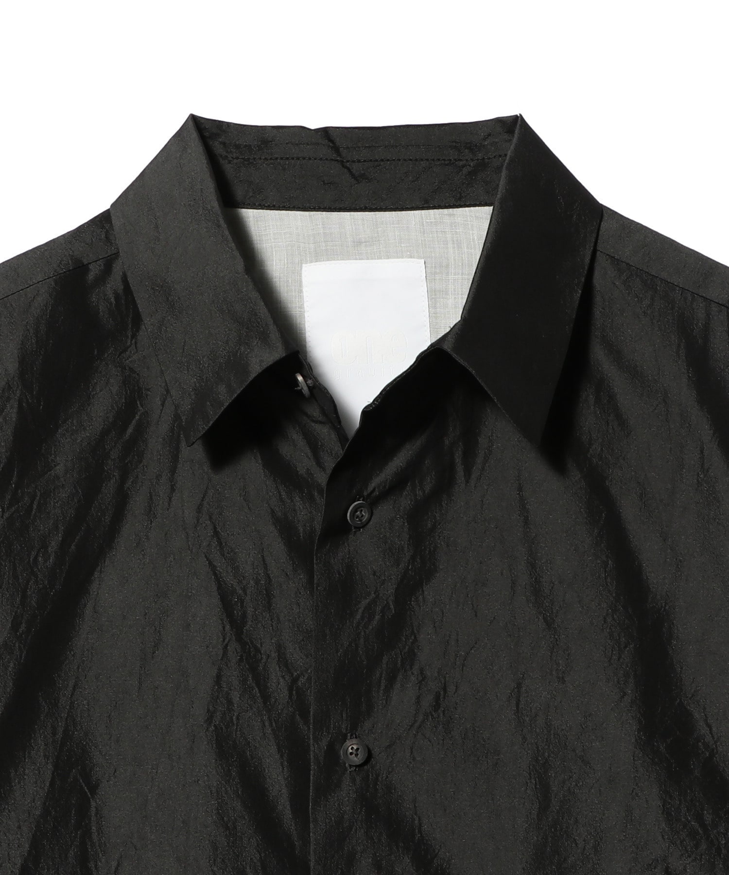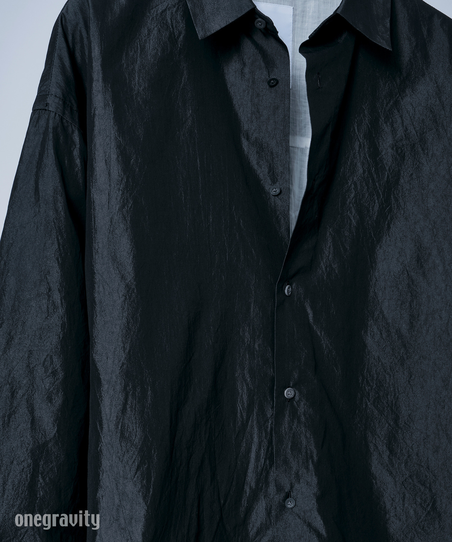 使用している生地は光沢感と繊細な透け感があり、シャリ感が肌触りのよさと清涼感を引き立てます。通気性に優れているため夏でも快適に着用でき、独特のシワ感がこなれた印象をプラスします。裏地には白のリネン素材を使用しており、表地とのコントラストが映えるデザイン。