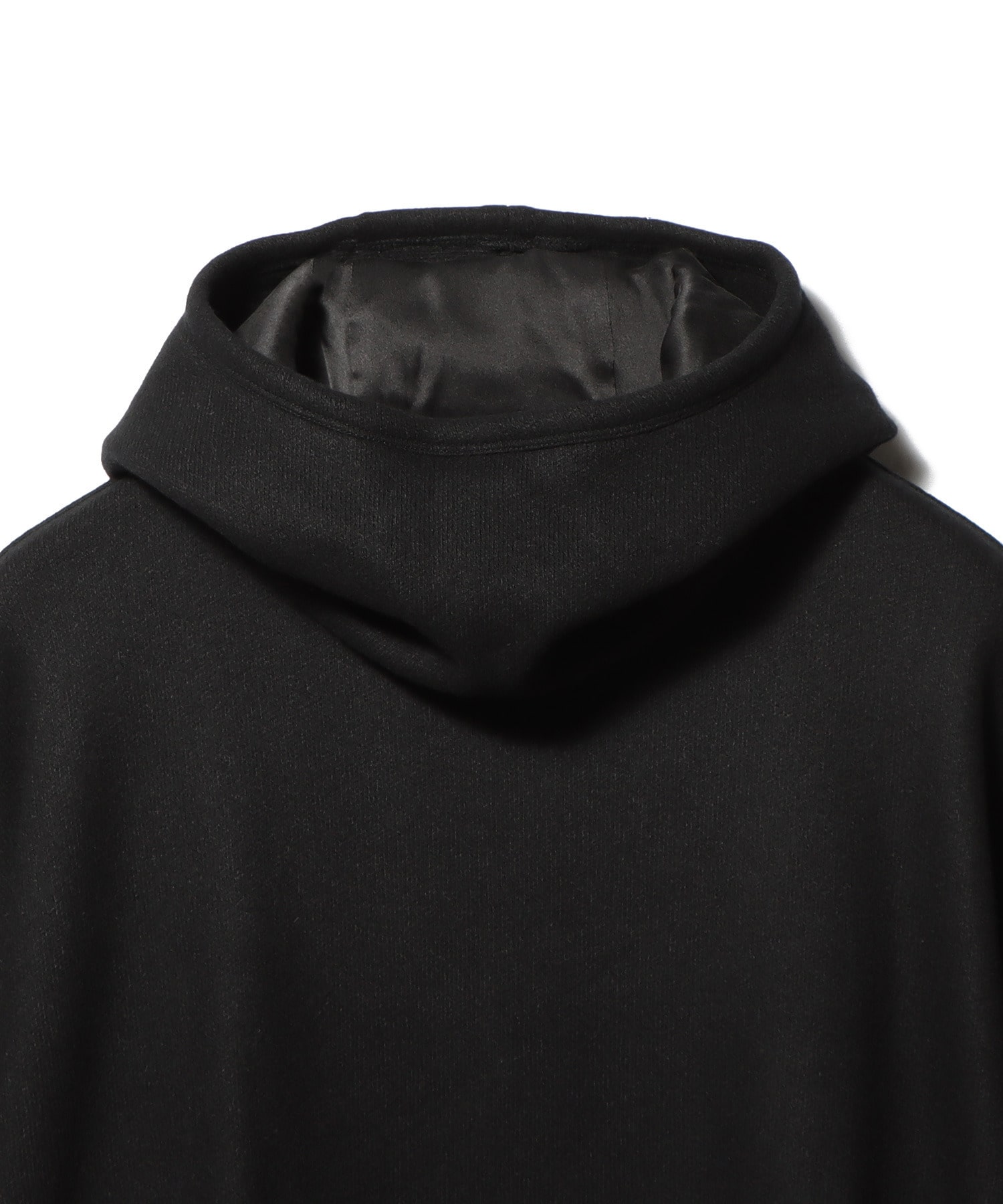ニット素材では表現が難しいとされる柔らかさと構築的な強さを両立したスムース編みを採用。 これにより、フーディーの命とも言えるフード部分がくたっとならず、顔周りに立体的に立ち上がります。 シルク混ならではの滑らかなタッチで、素肌に触れてもチクチクしない極上の着心地です。