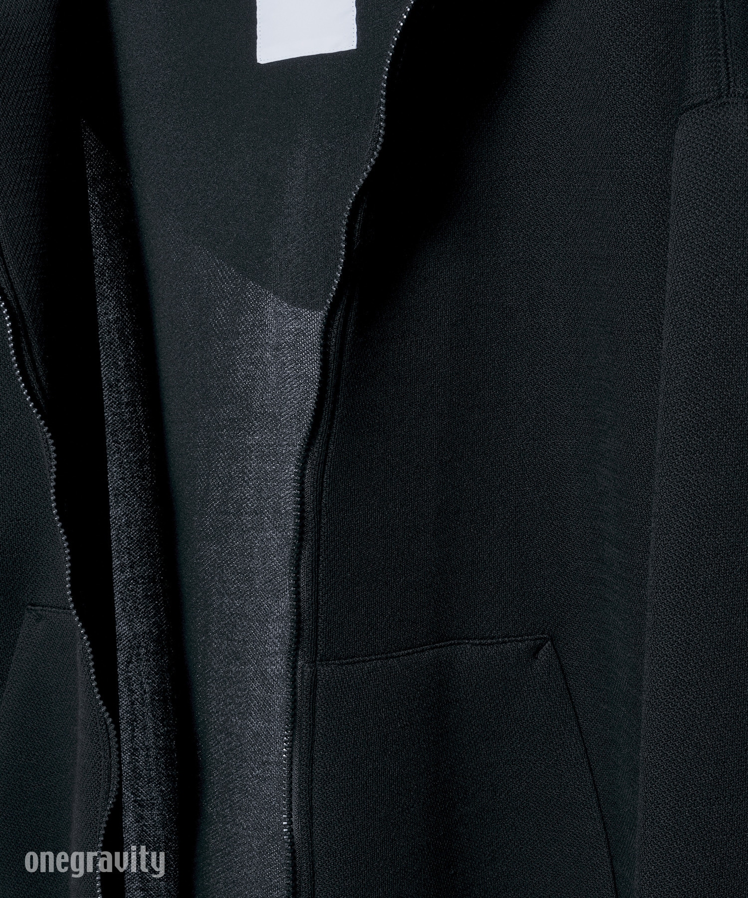 光の角度によってシアーな表情を見せる独特なテキスタイルを使用したフーディーです。