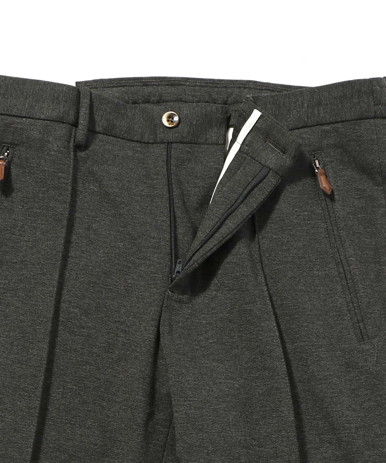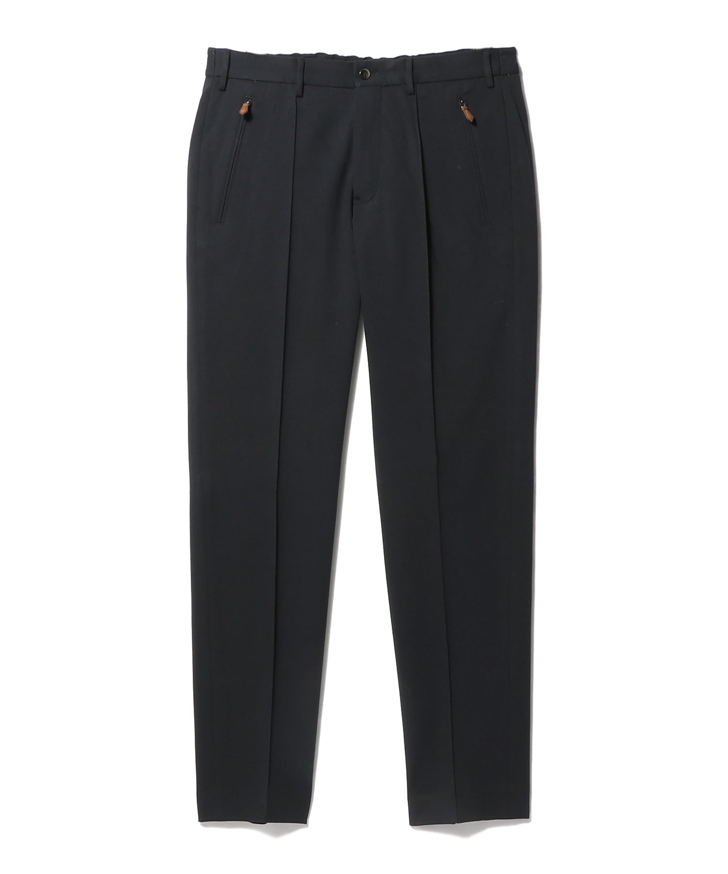 ノープリーツのフロントをピンタックにしたデザインと、裾の仕様をシングルにしヒップポケットをフラップ仕様に別注。