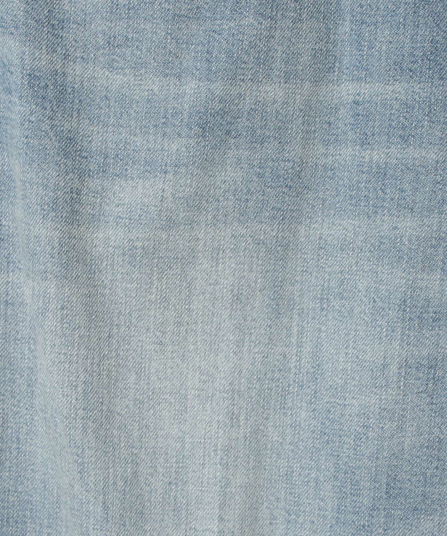 経糸にはスラブの短いムラ糸を用い、インディゴのみでロープ染色。澄んだ青味が印象的な中濃カラーが、クリーンで奥行きのある表情を生み出します。洗いをかけることで自然なシボ感が現れ、ほどよくラフでカジュアルなニュアンスに。