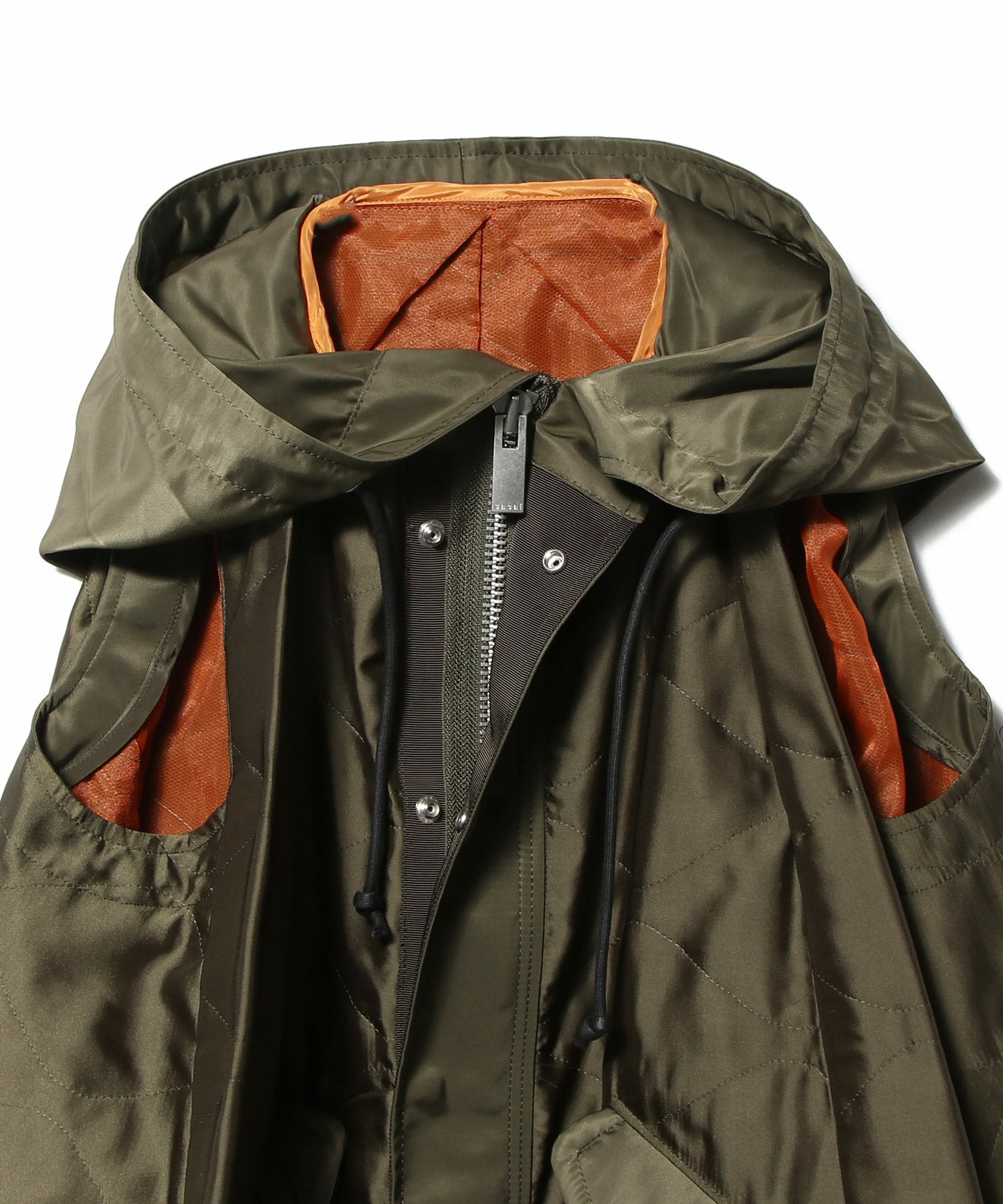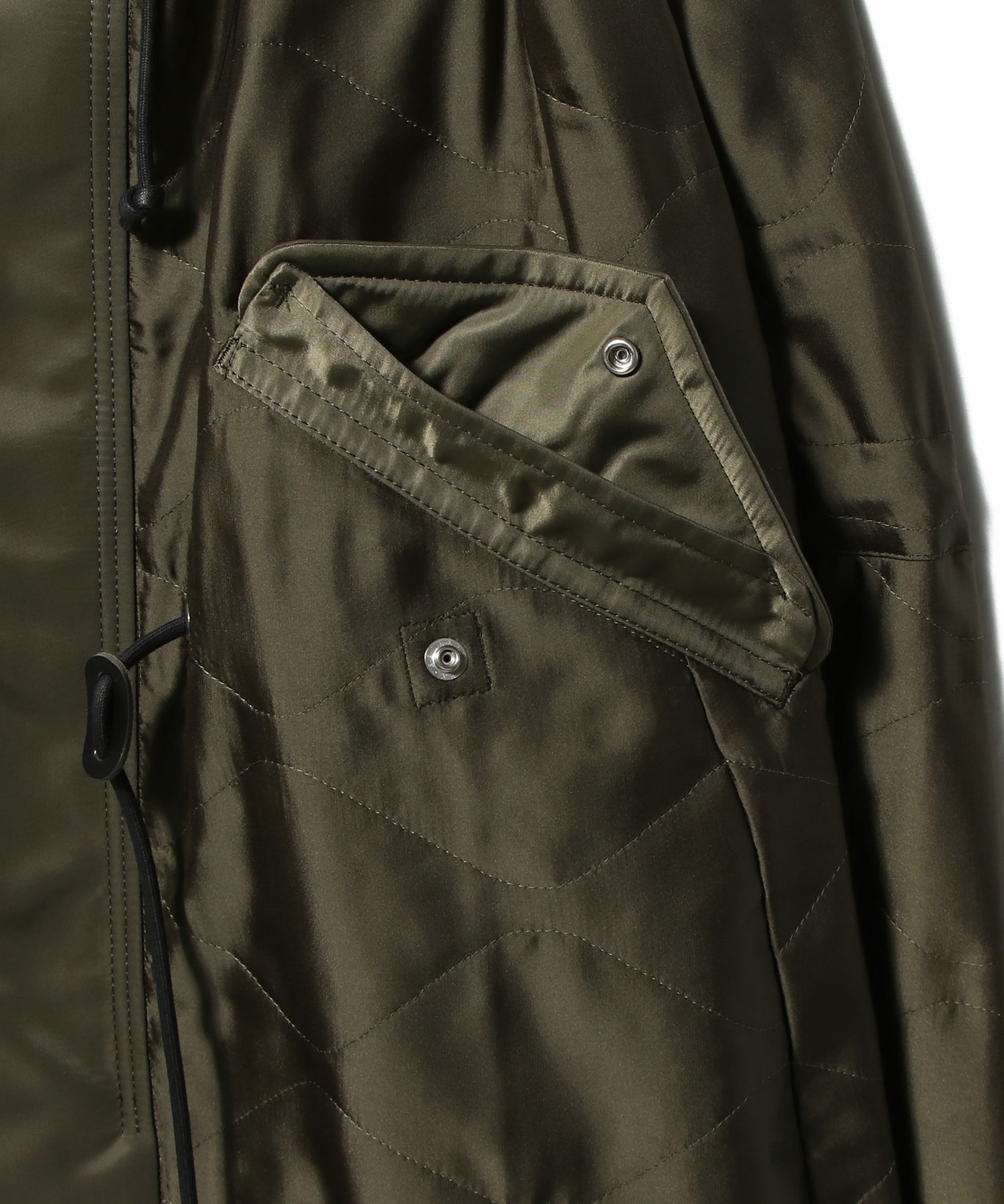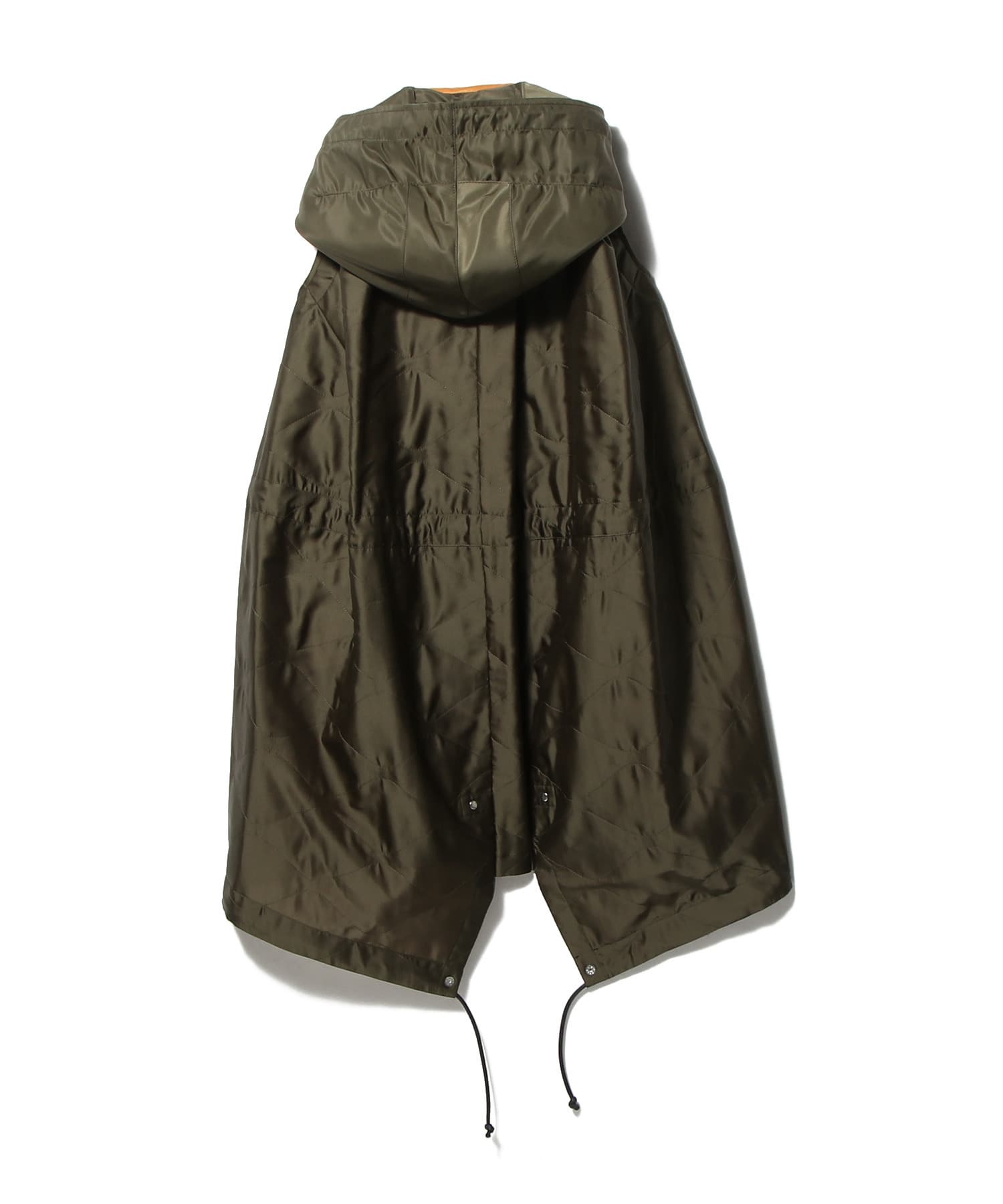 フロントのフラップポケットやドローストリング、後ろ下がりのフィッシュテールデザインが、ミリタリールーツを感じさせつつも都会的な印象に。