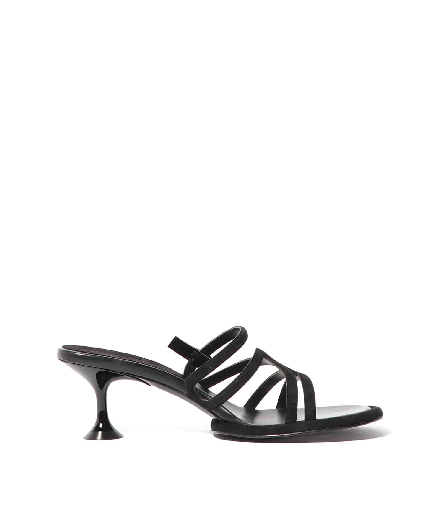 オープントゥデザインの彫刻的なキトゥンヒールが特徴のサンダル。