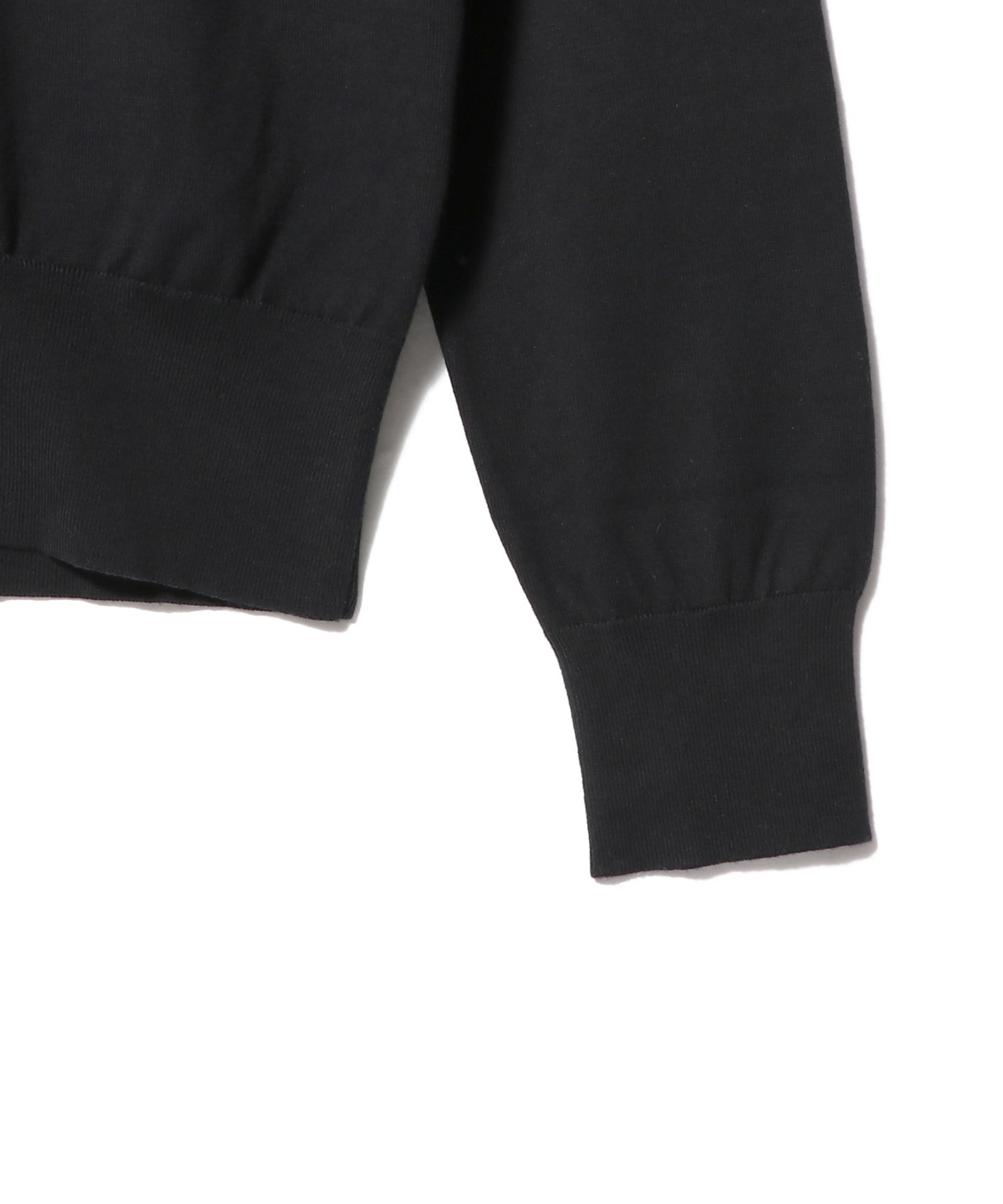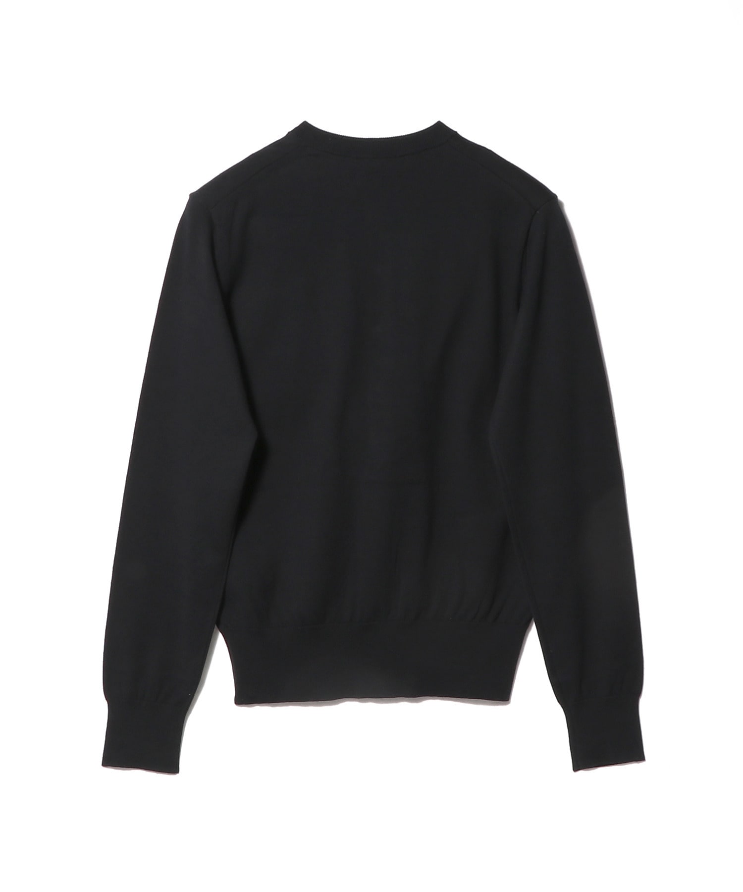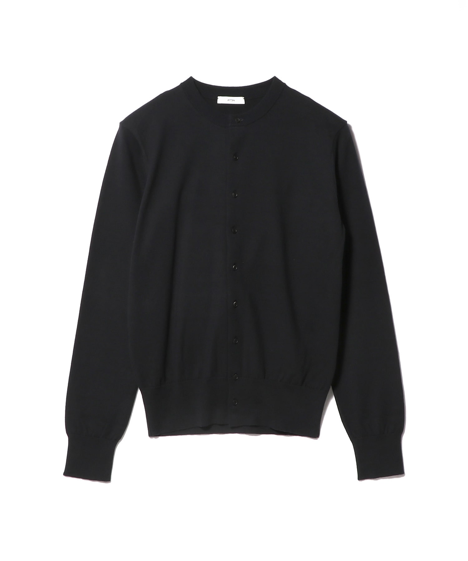 襟ぐりのしっかり詰まったレギュラーフィットのクルーネックカーディガン。