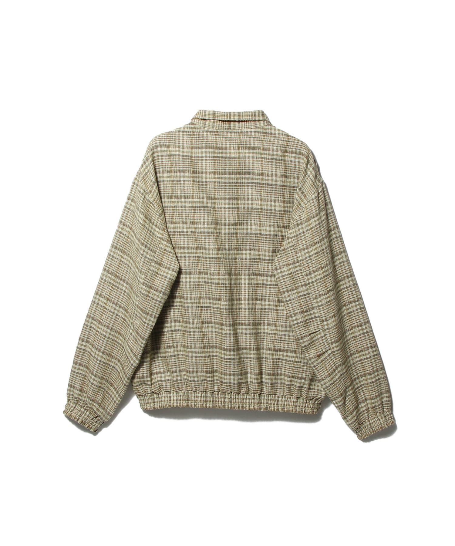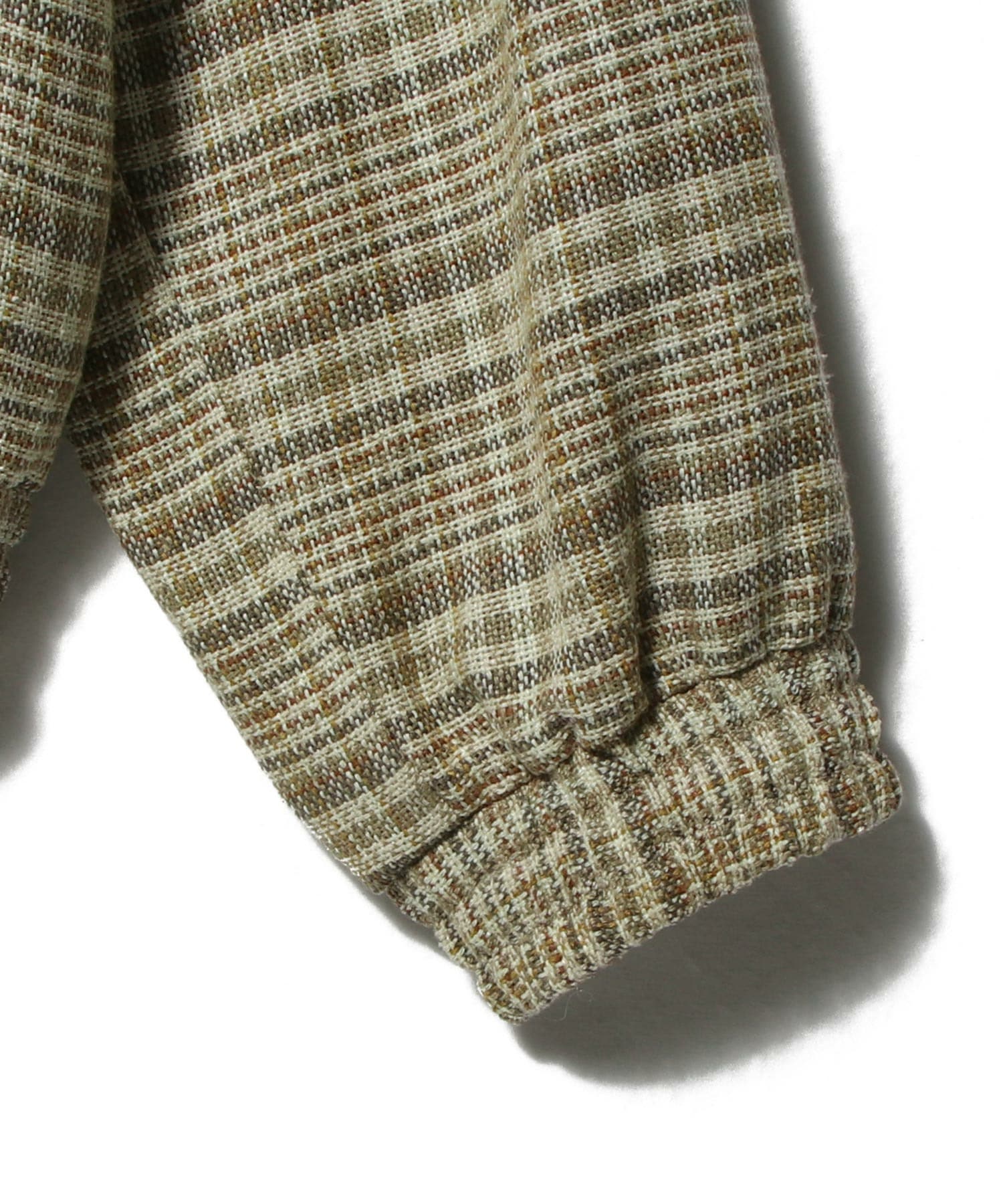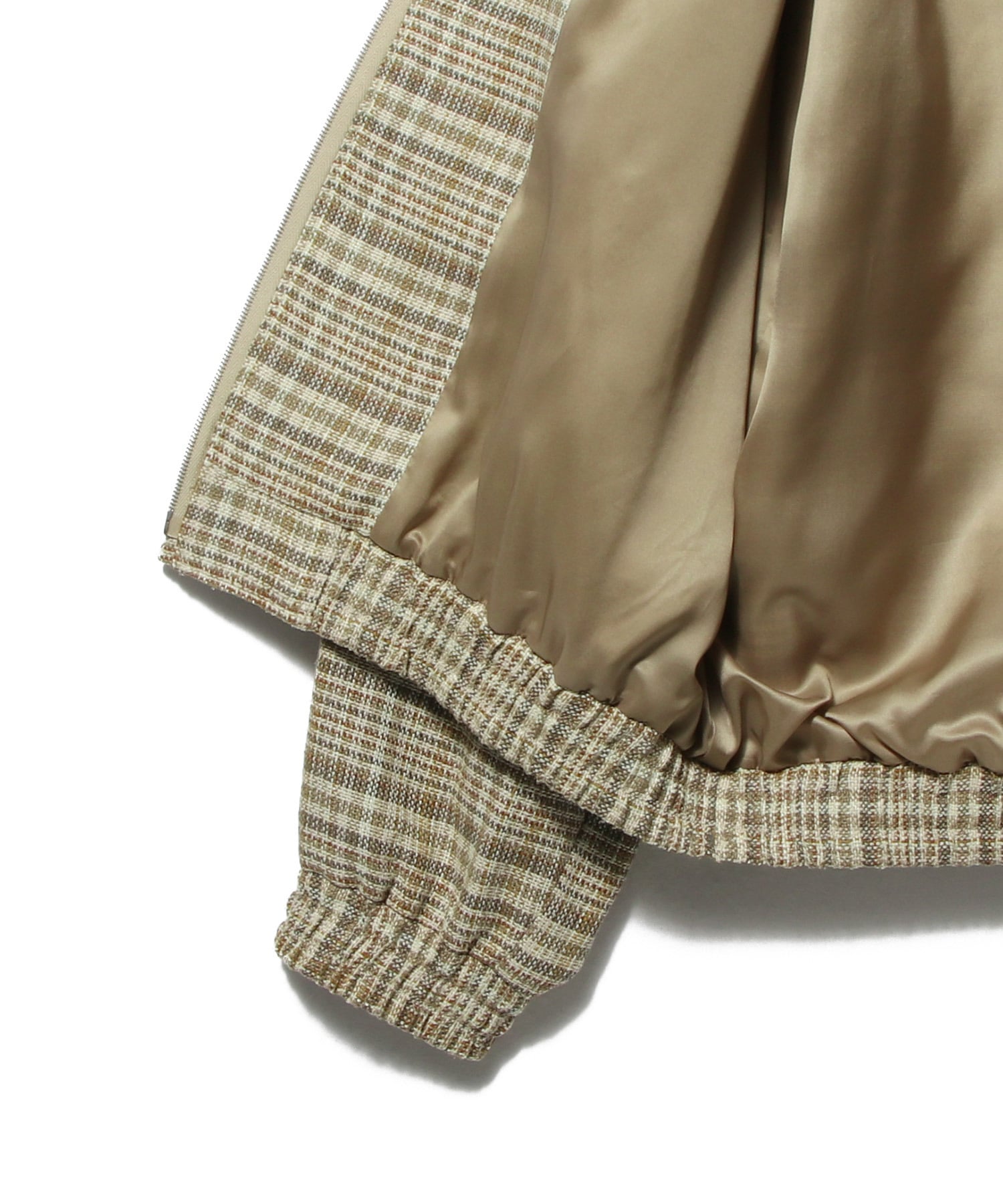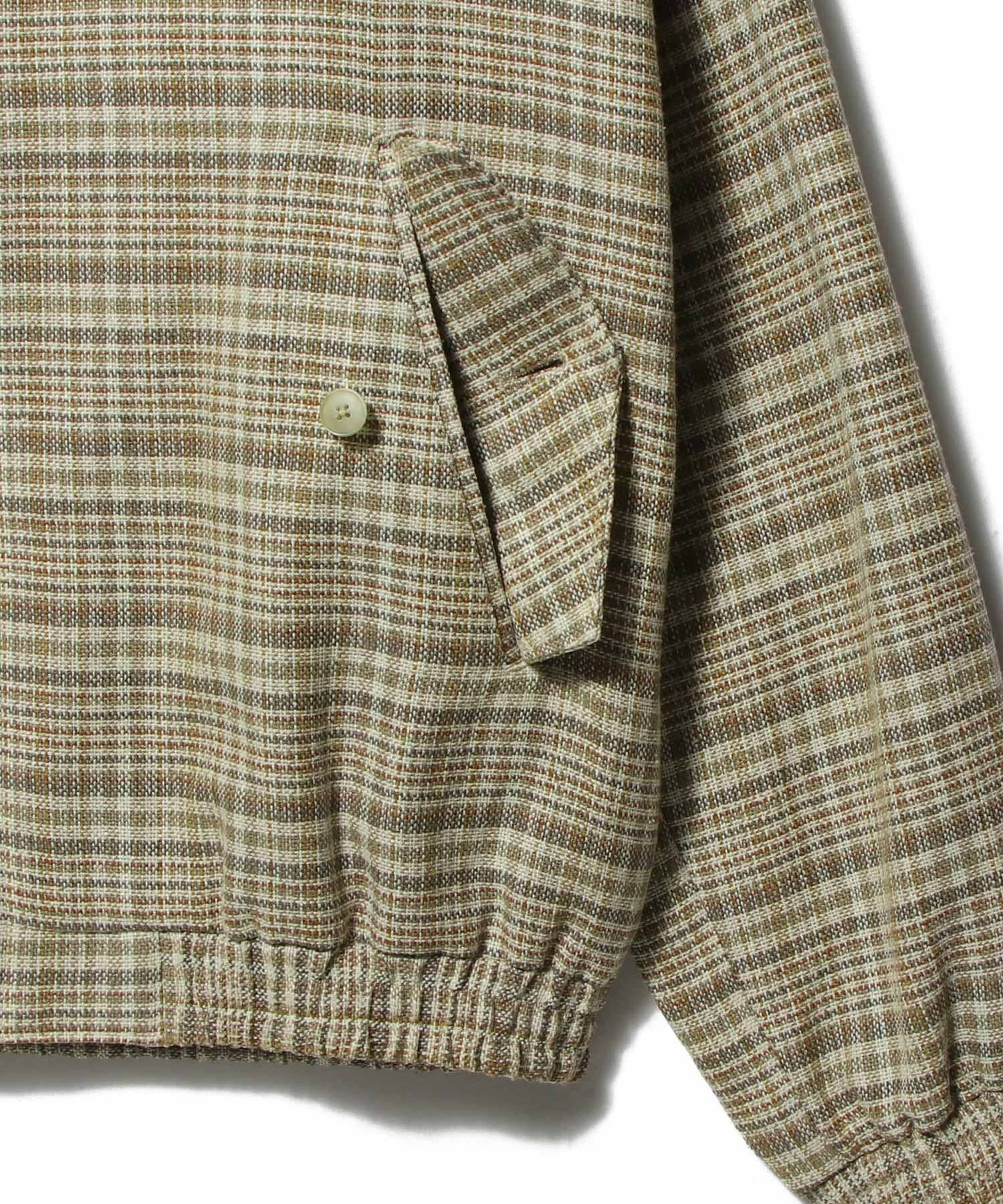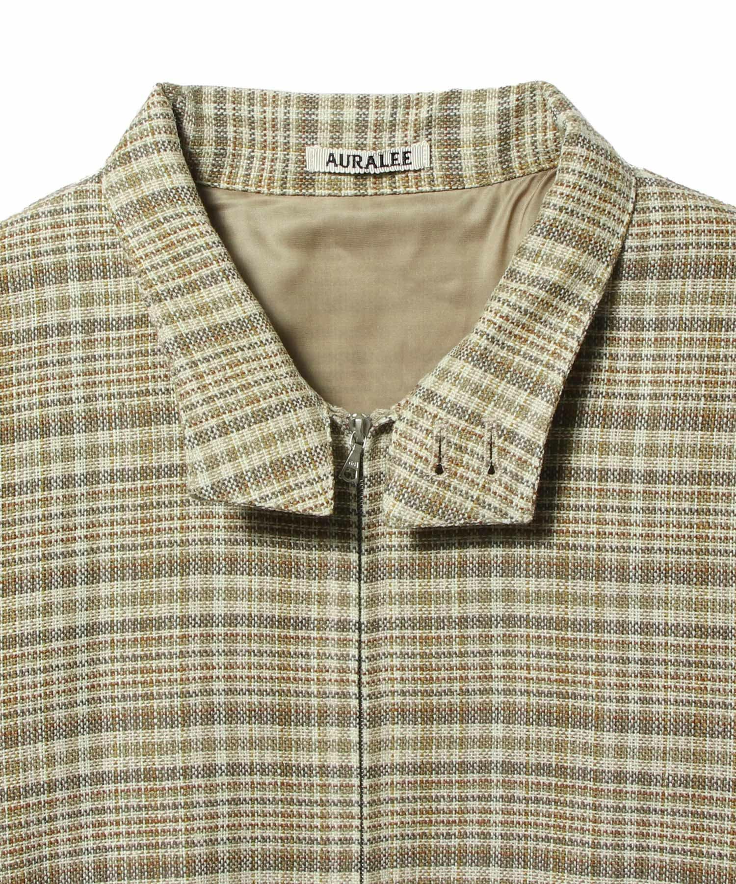 シルクノイルとリネンの三つ杢糸をタテヨコに用いた、奥行きのあるチェック柄サマーツイードのジップブルゾン。