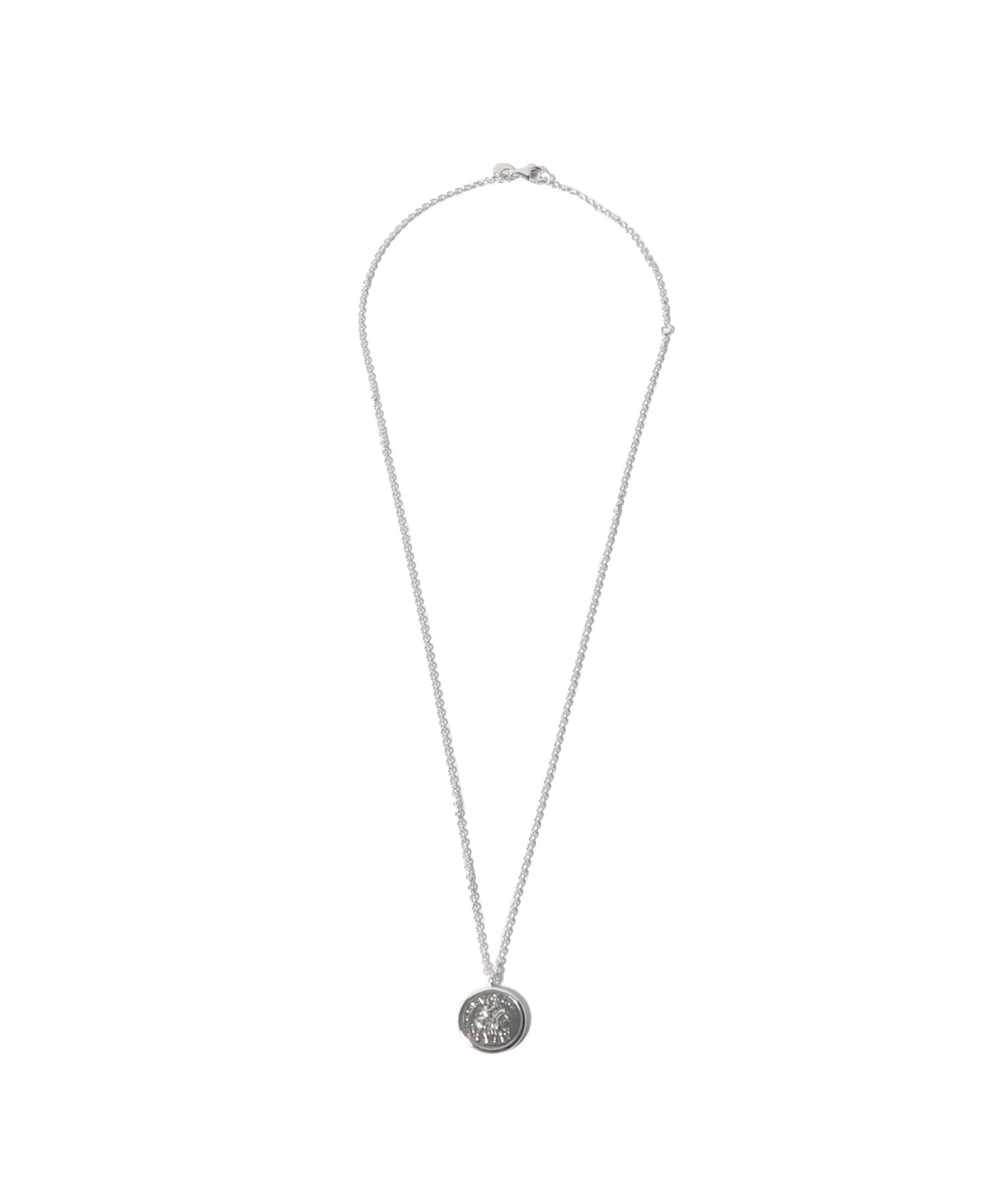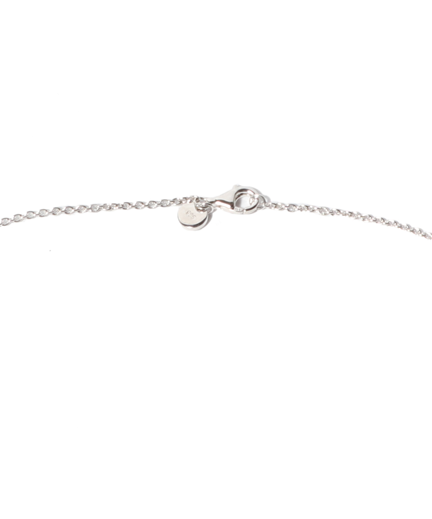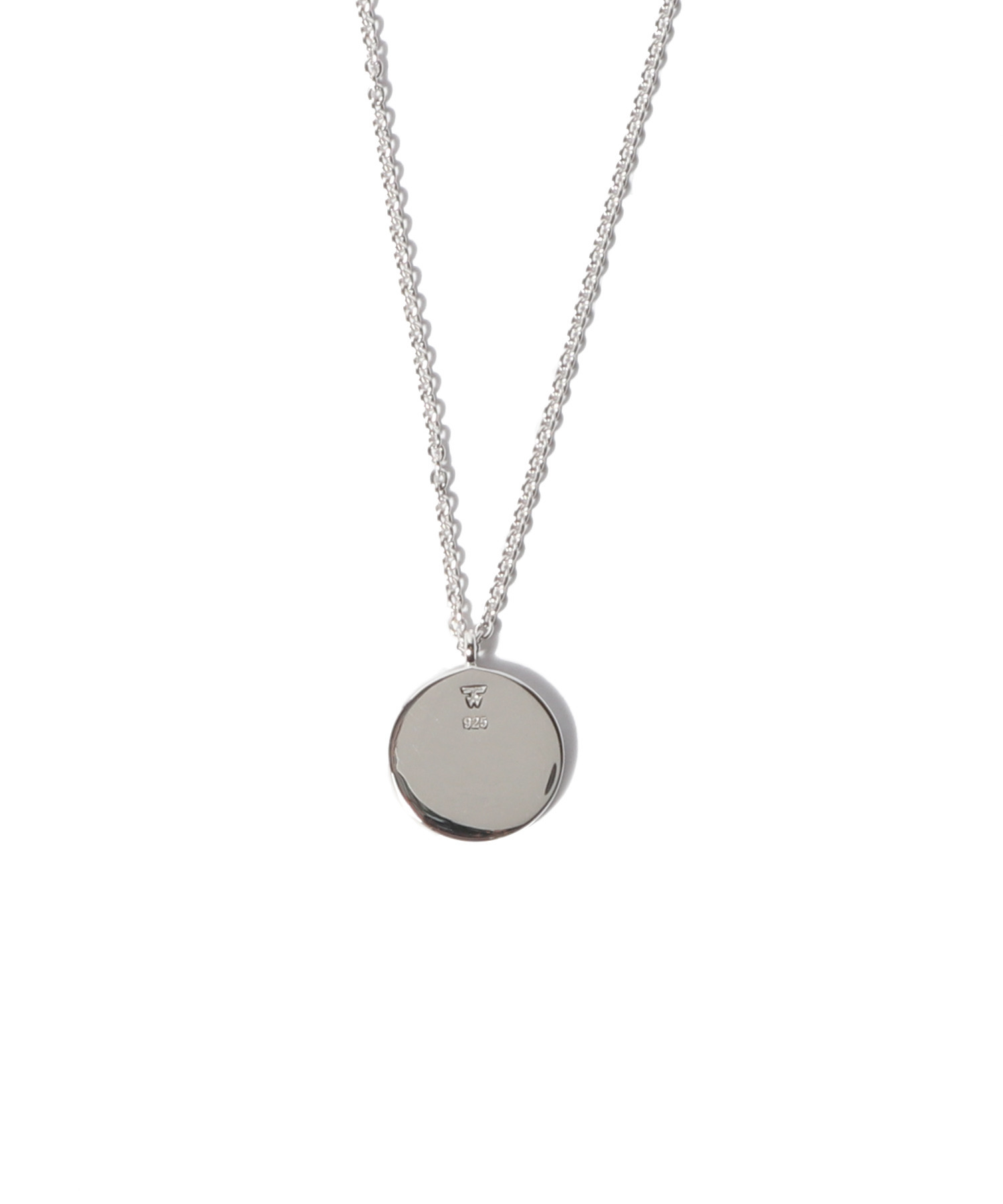 このネックレスはポリッシュ仕上げのスターリングシルバー925製で、表面を強化し変色を防ぐためにホワイトロジウムプレーティングが施されています。