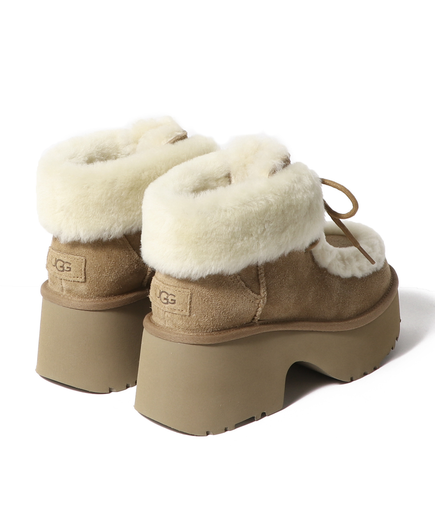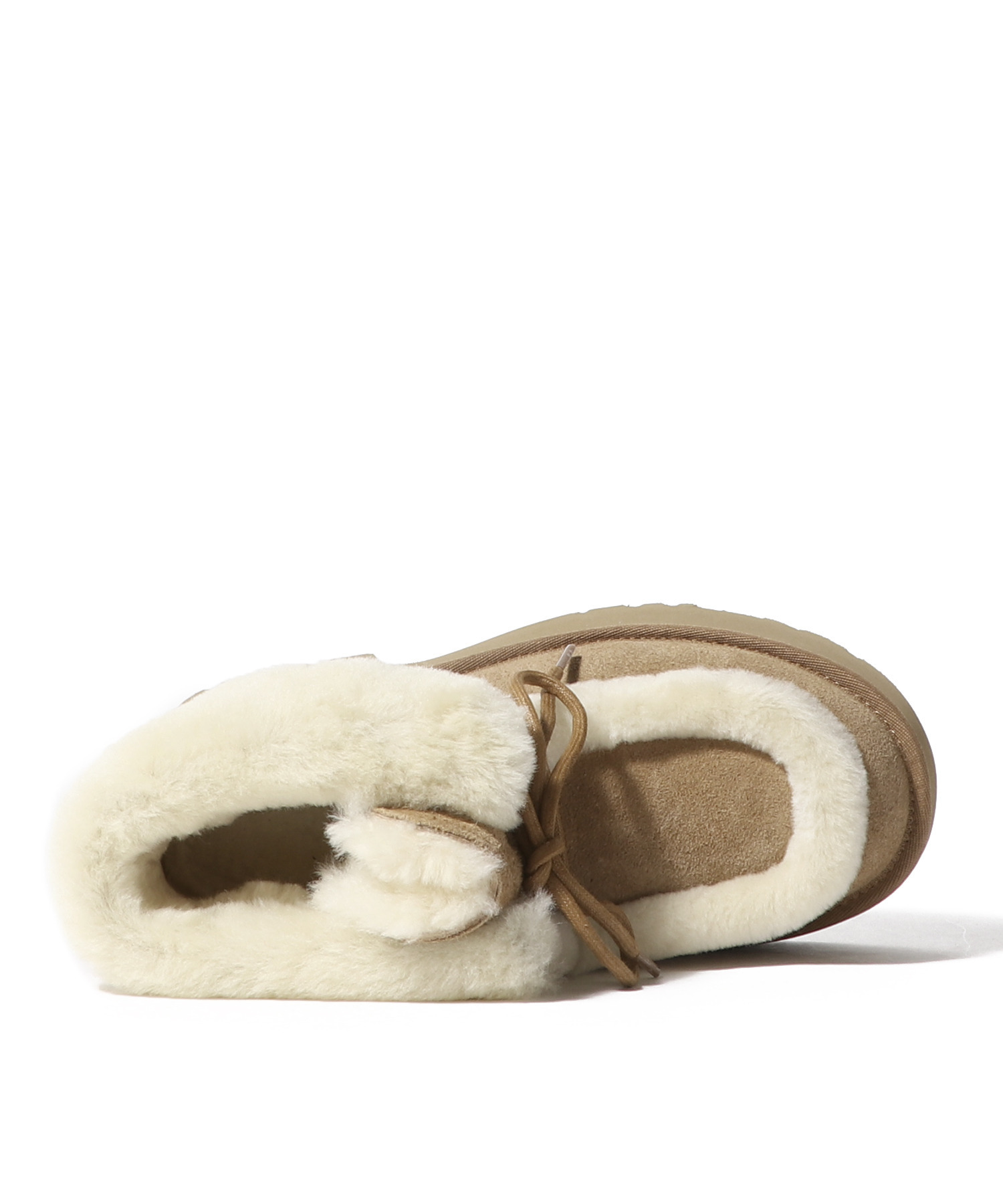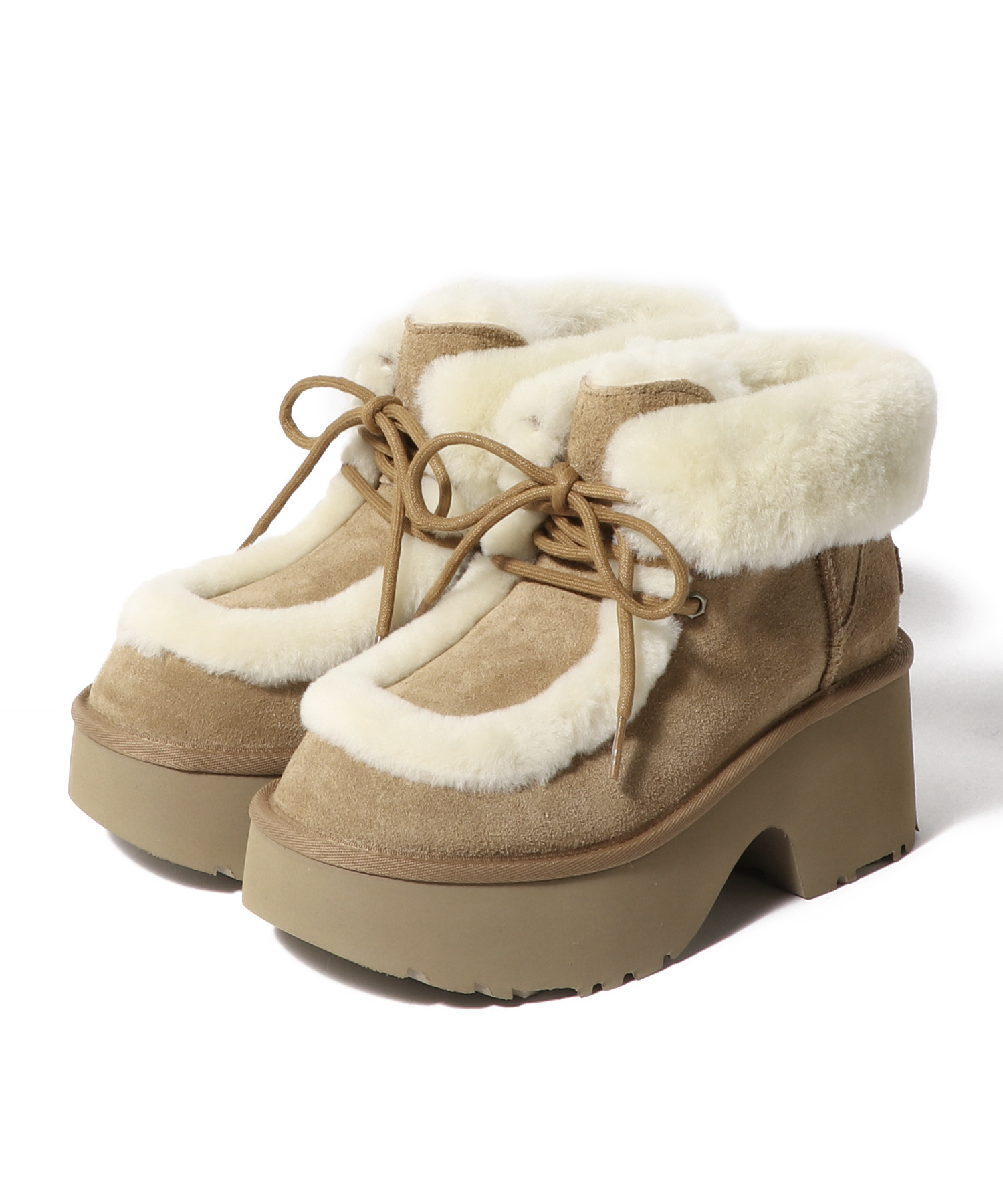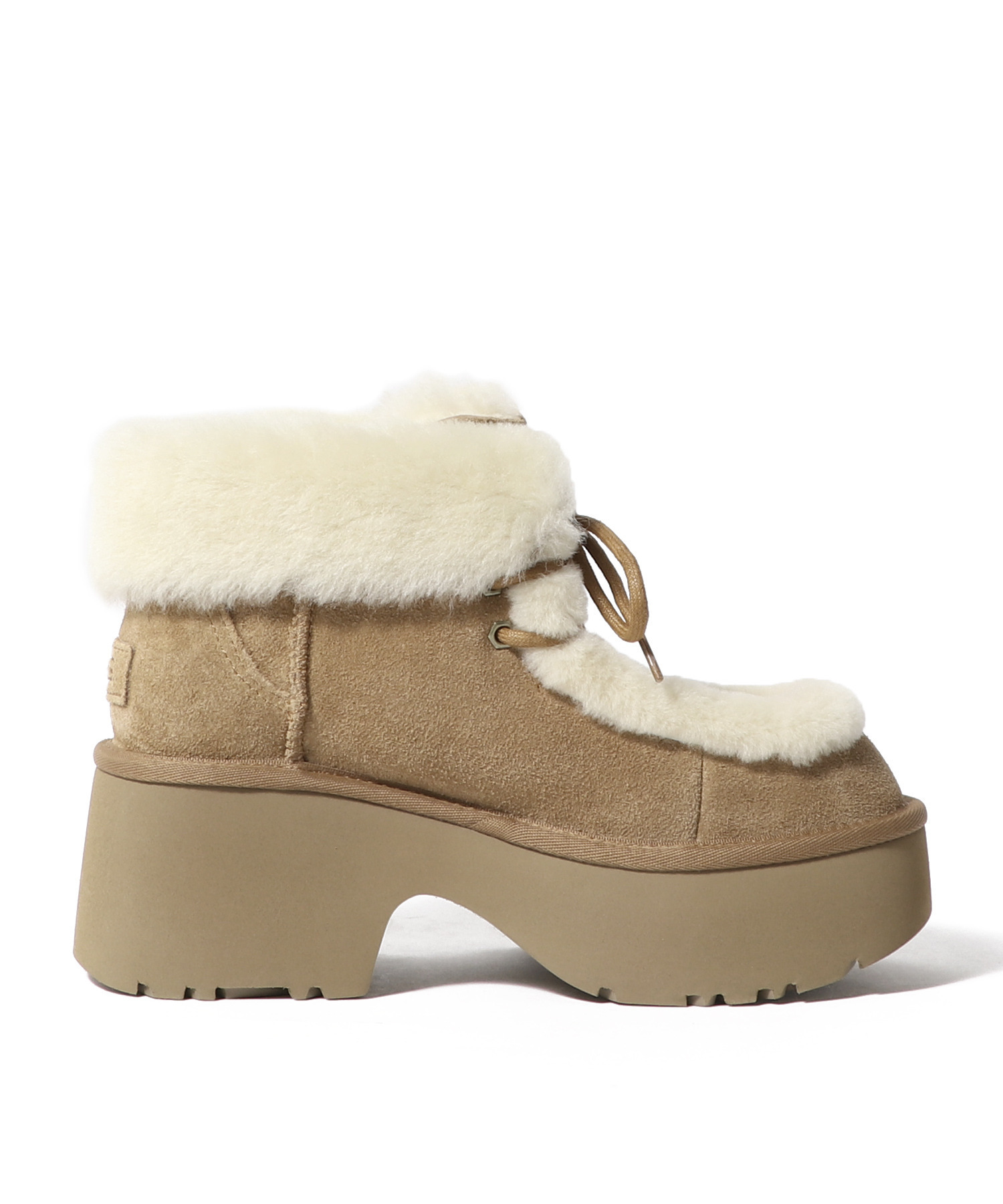 スエードのアッパーと贅沢なシープスキンのスピルシームを採用したブーツの履き口は折り返し可能で、シープスキンをより多く見せることも可能。内側にはソフトなUGGplush™のライニングを施し、サトウキビ由来のEVAを使用した約7cmのプラットフォームアウトソールが軽やかな履き心地をもたらします。