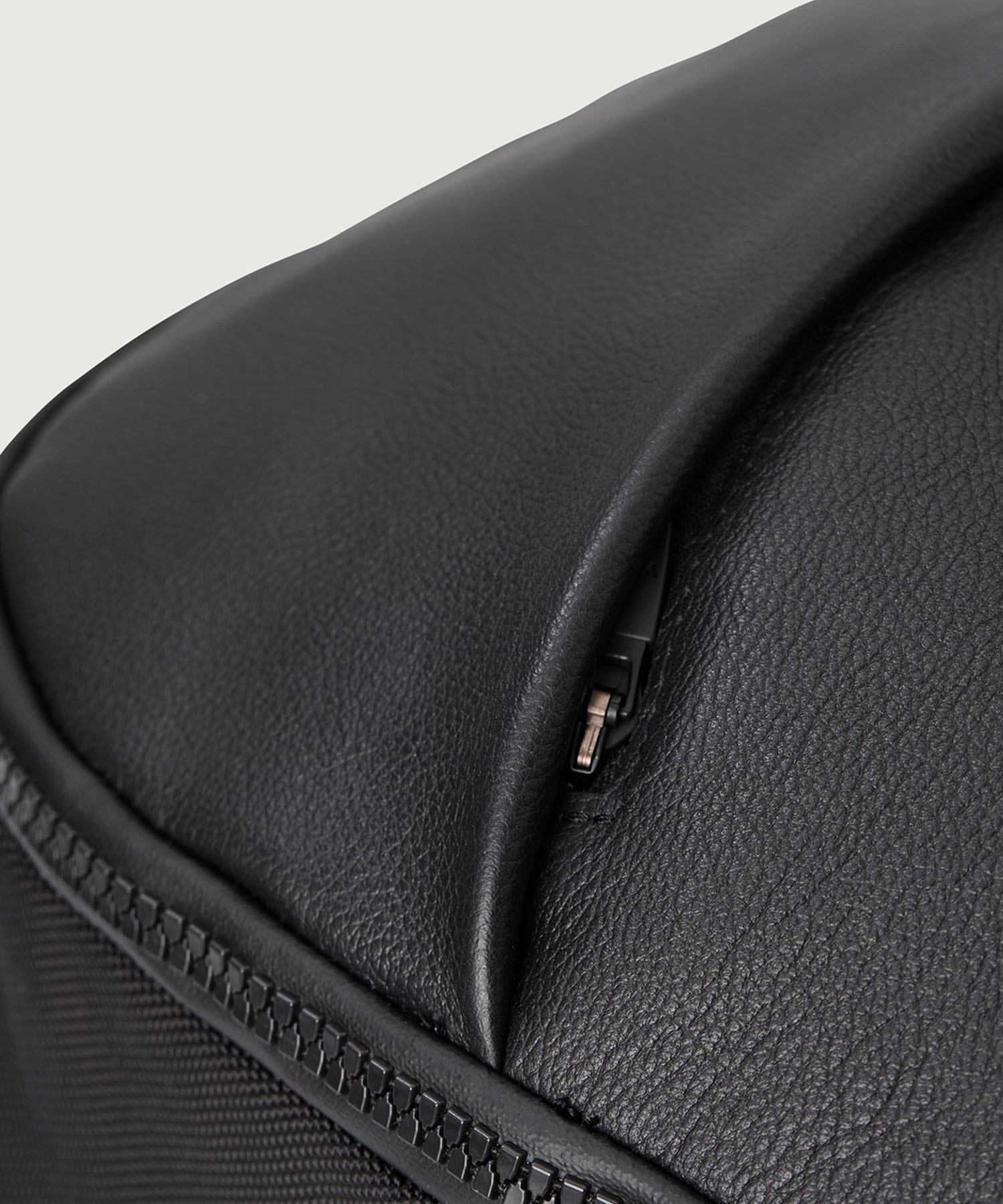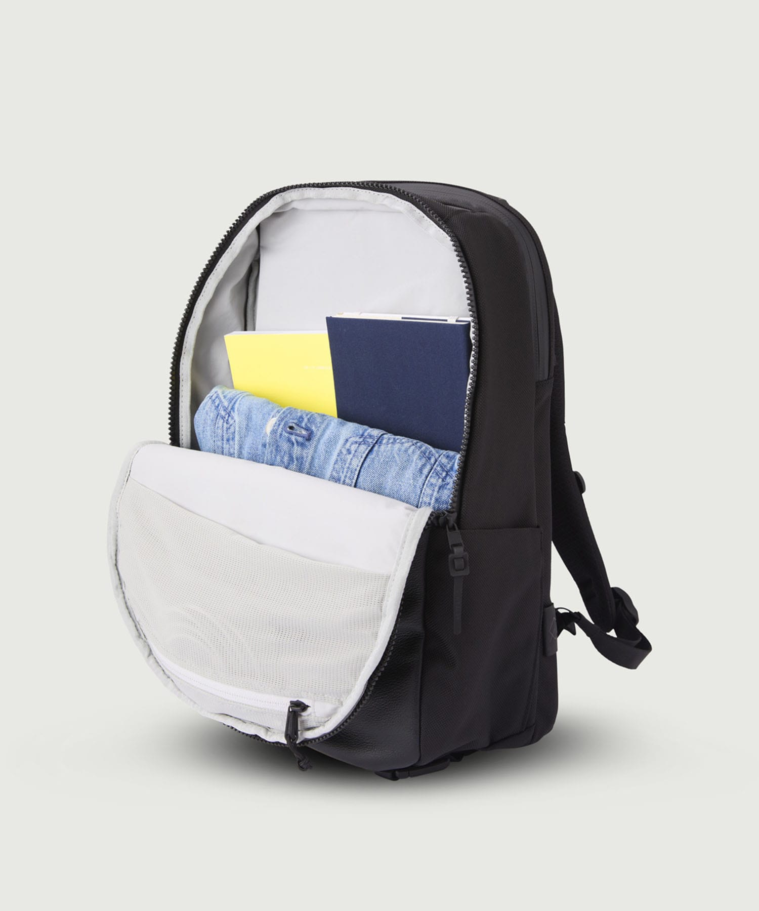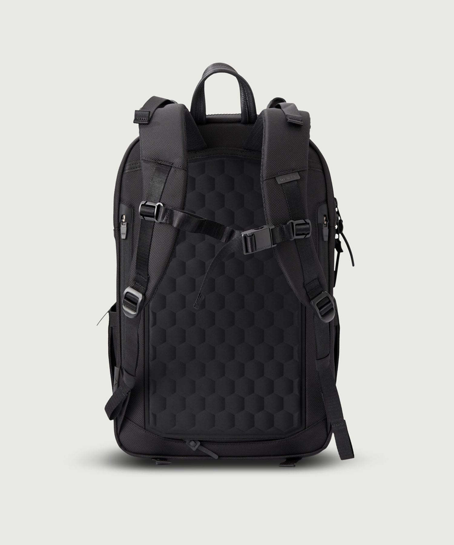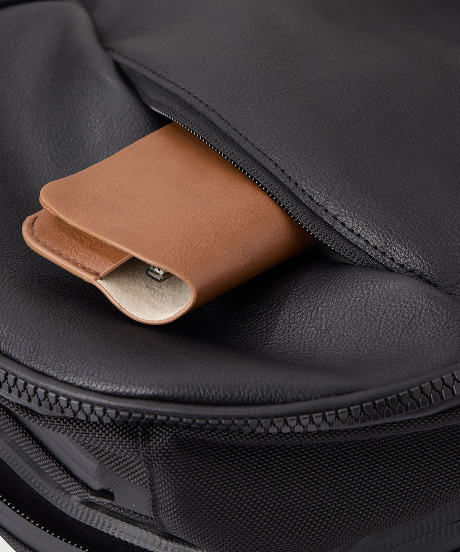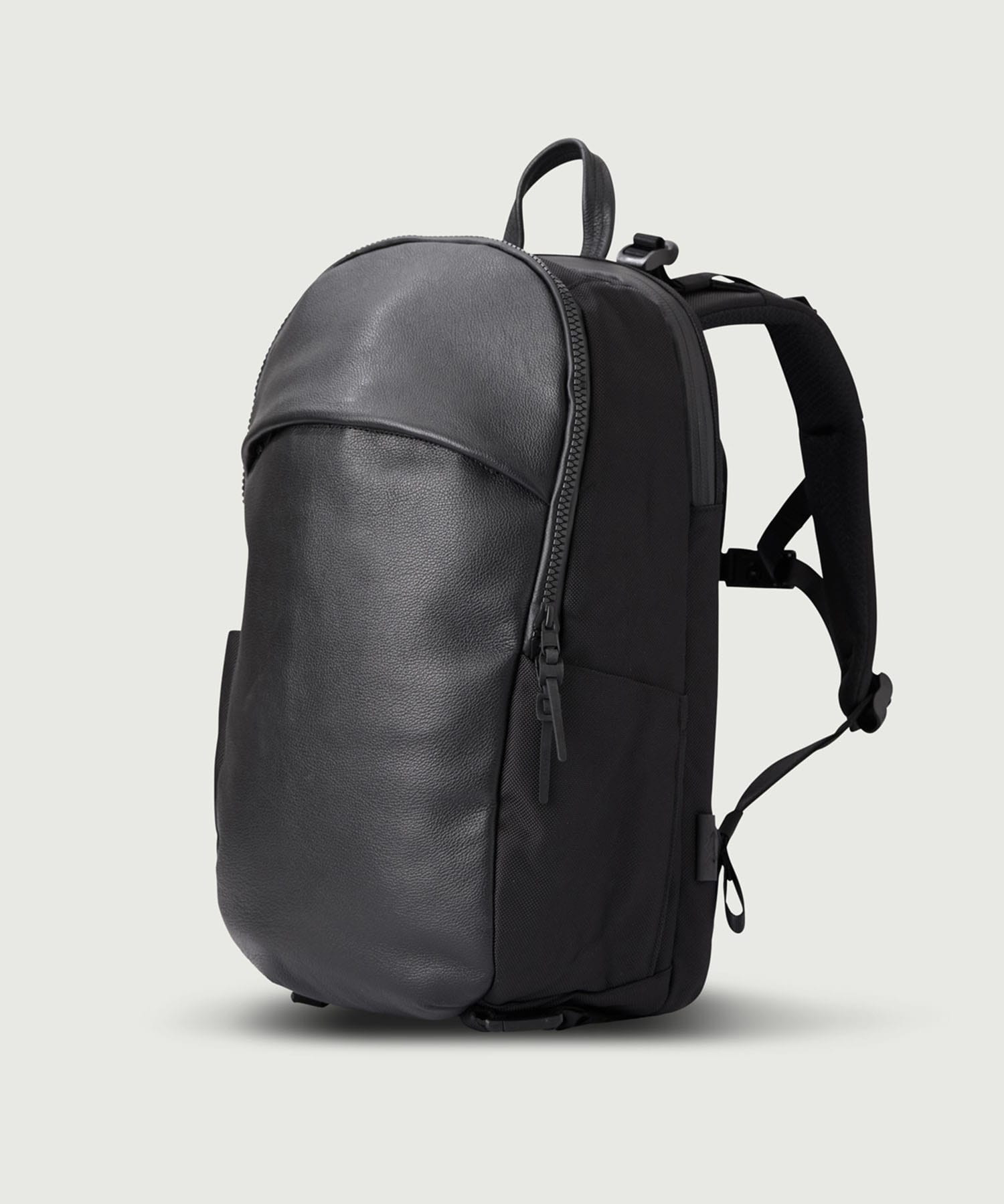 人気モデル「JACOB BACKPACK」のフォルムをベースに、フロントパネルとハンドルには撥⽔グレインレザー、ボディにはCordura®社製のバリスティックナイロンを使⽤。さらにメインコンパートメントのジッパーはYKK社製VISLON® AquaGuard®ジッパーを採⽤し、デザイン性と耐⽔性に優れながらも⽇常からビジネスシーンまで調和する、洗練された仕上がりになっています。付属品の軽量Ripstopナイロン素材のオリジナルエコバッグがすっぽりと収まる専⽤ポケットも完備。
