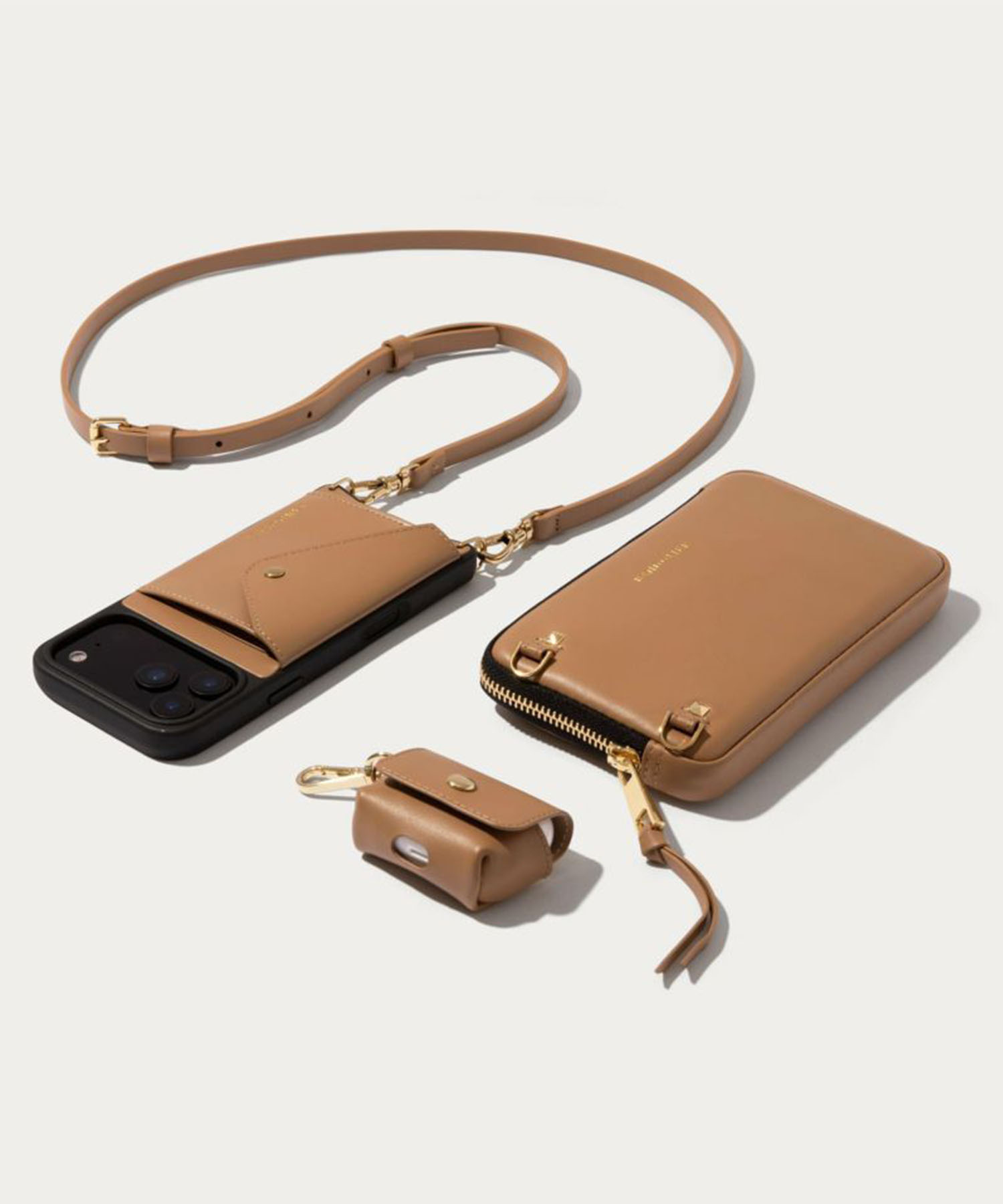 肌馴染みの良いブラウントーンに繊細なゴールドの金具が上品さを演出。 カードを6枚まで収納することができ、ハンズフリーなお出かけを実現します。 クロスボディストラップは長さ調節可能で、肩から斜めがけができ両手が空くので、荷物の多いときや旅行にもおすすめです。