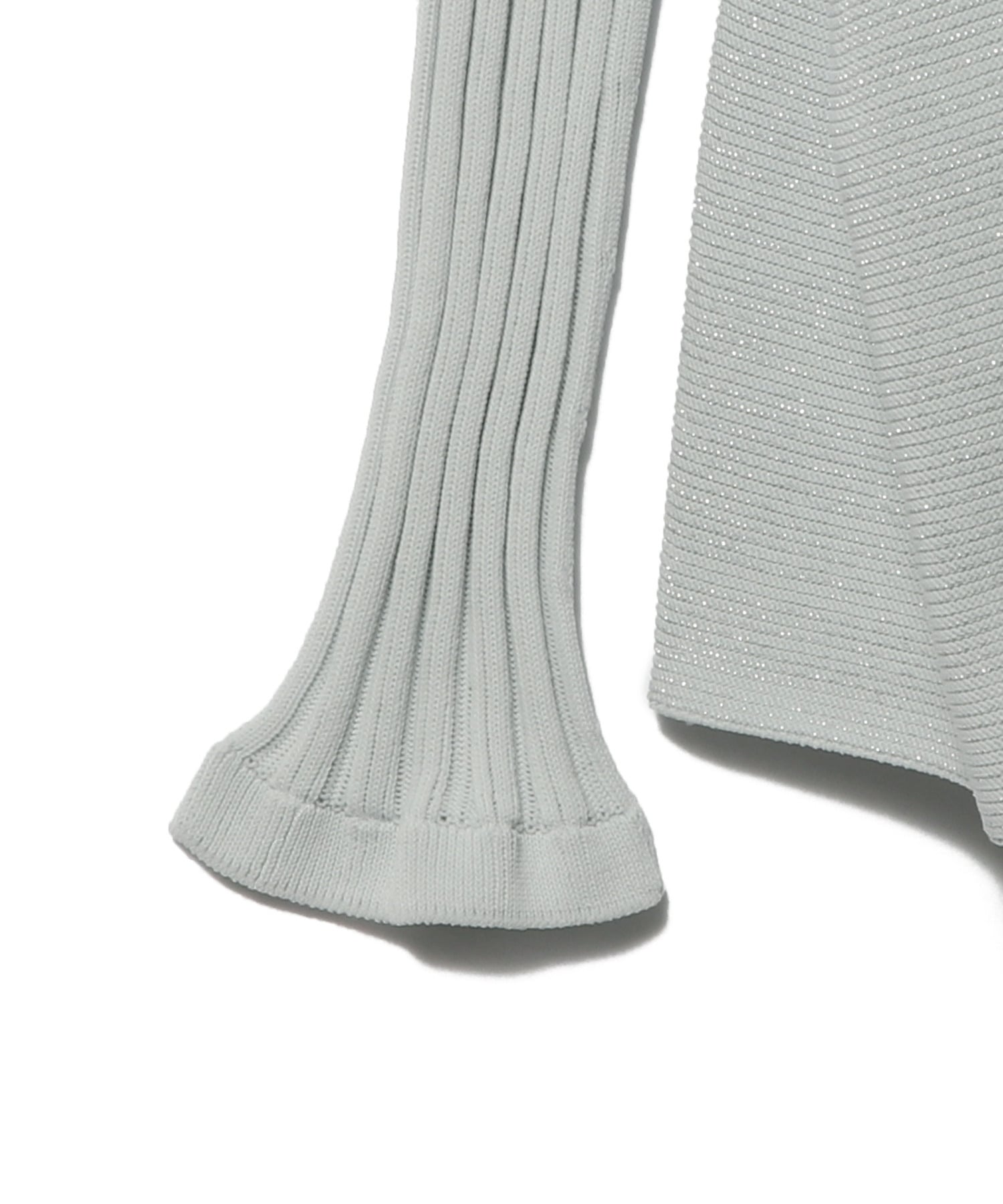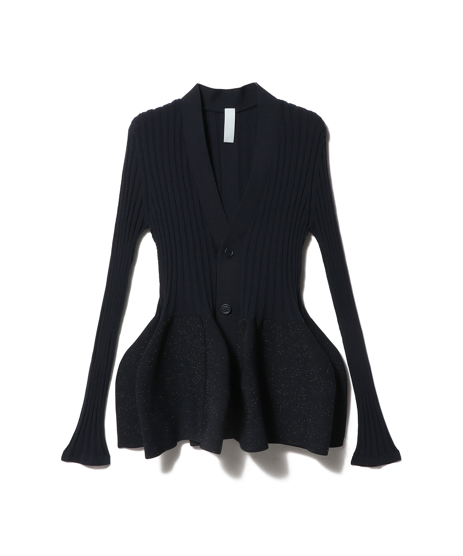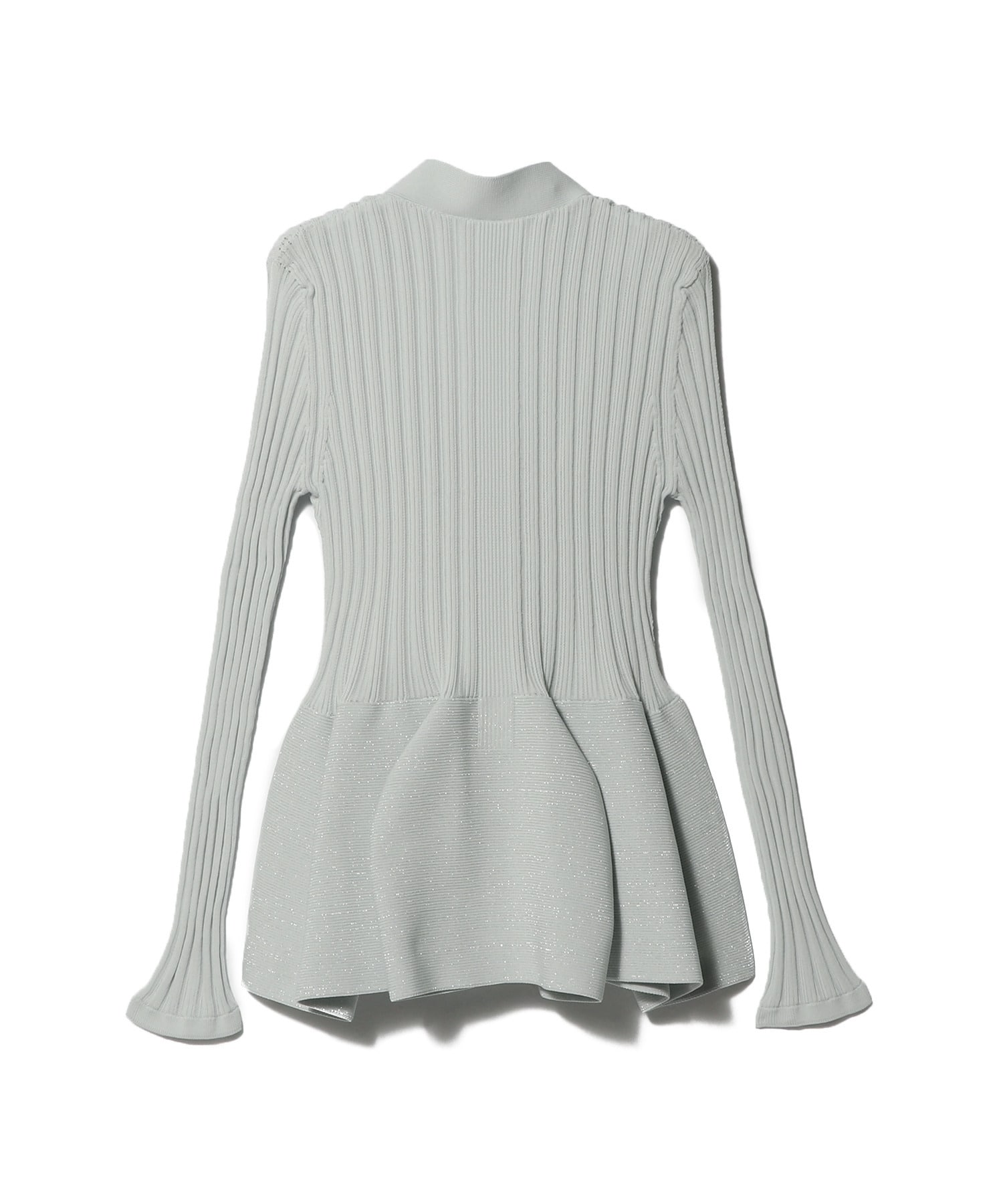 タイトにフィットする身頃と、コンピュータープログラミングによって作られた構築的なシルエットが印象的なデザインです。ペプラムにはラメ糸を編み込み、華やかな雰囲気を演出しています。縫代がなく、ストレッチ性に優れ、快適な着心地です。