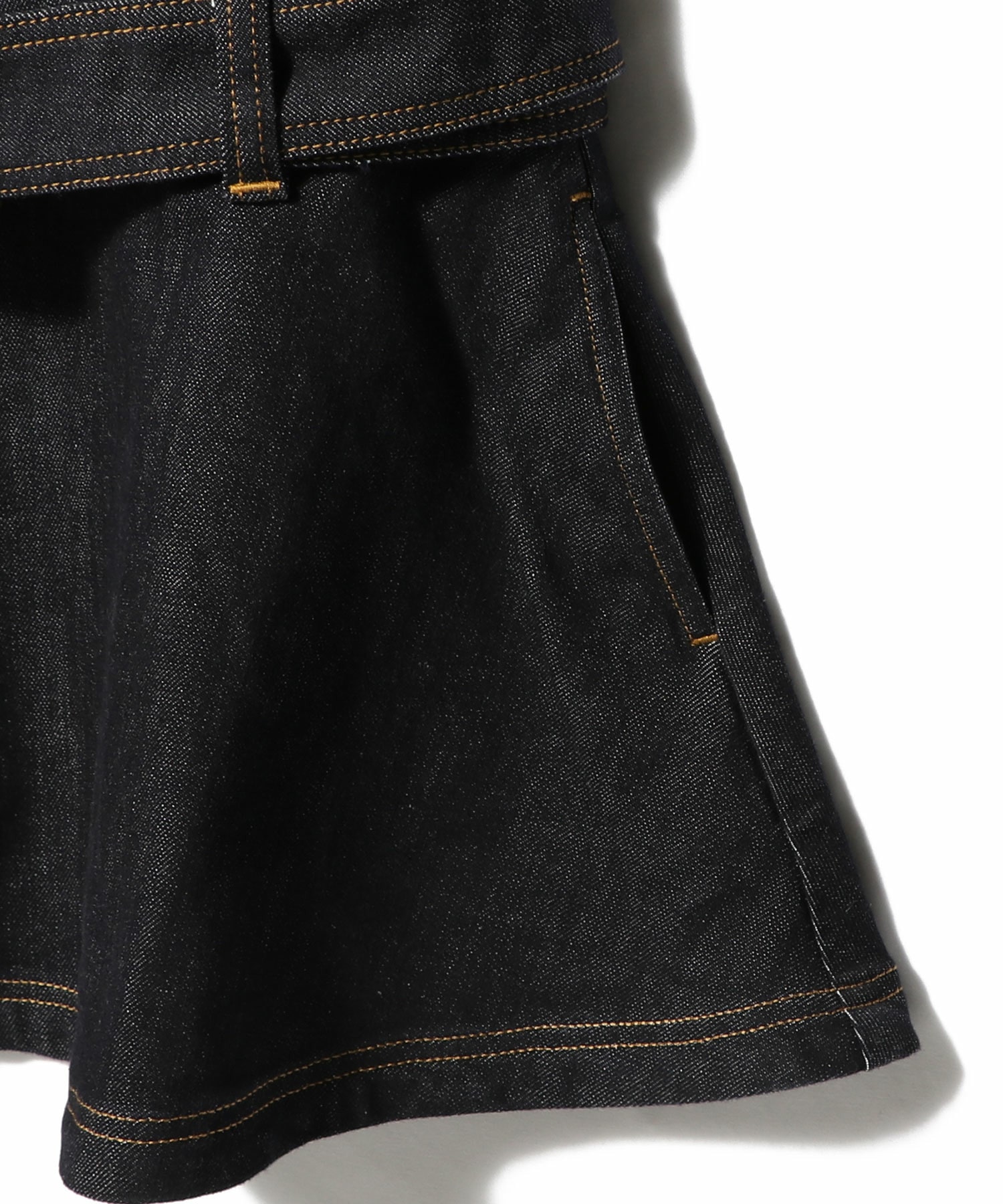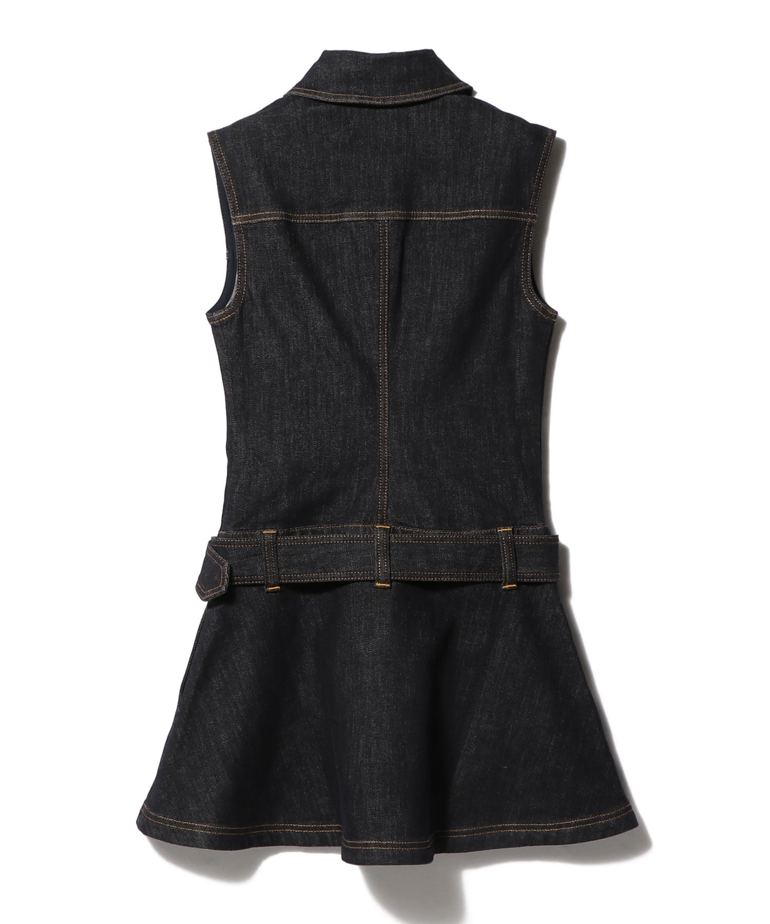 濃紺のデニム地に、コントラストステッチがアクセント。ノースリーブデザインでヘルシーな肌見せも叶います。