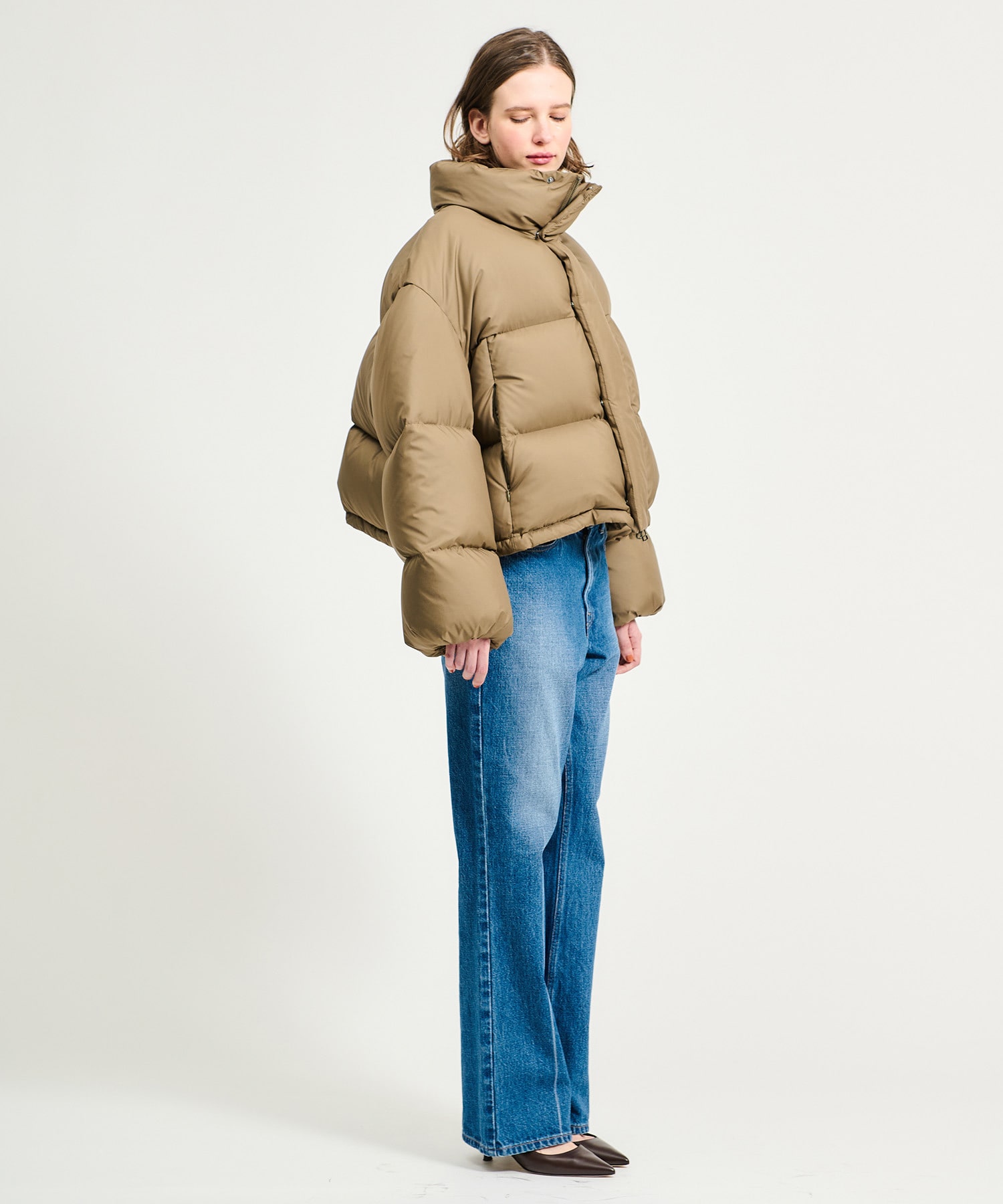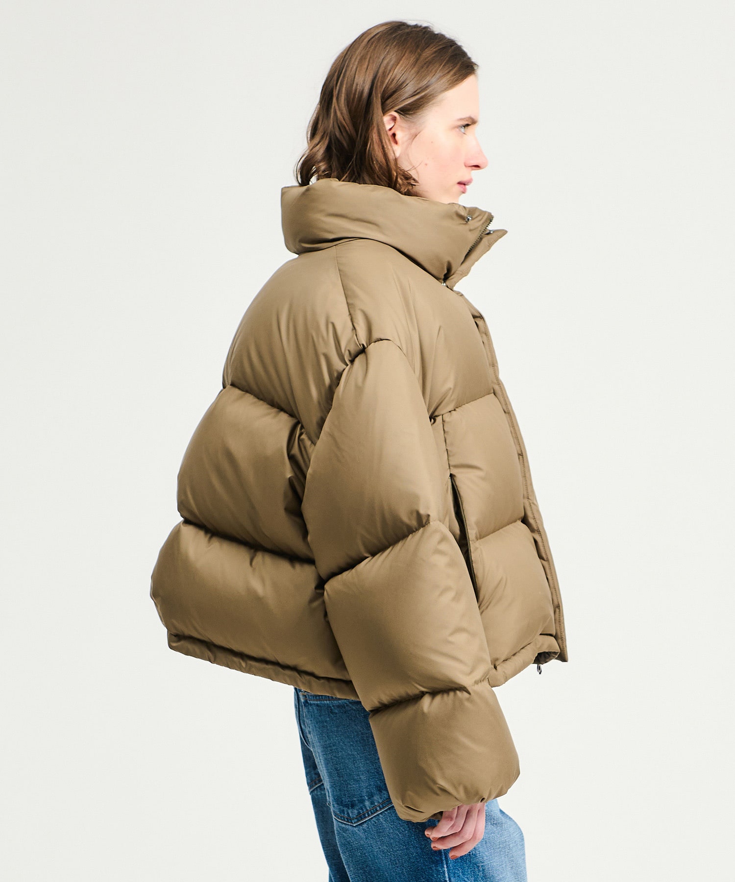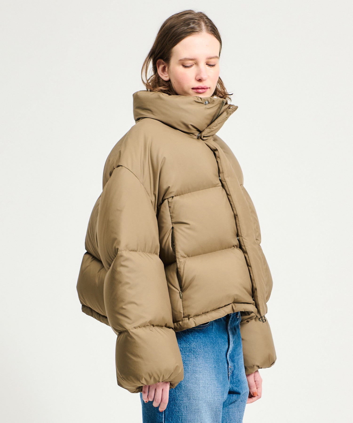 毎年人気のショートダウンは今年はフードレスデザインですっきりとした印象に。