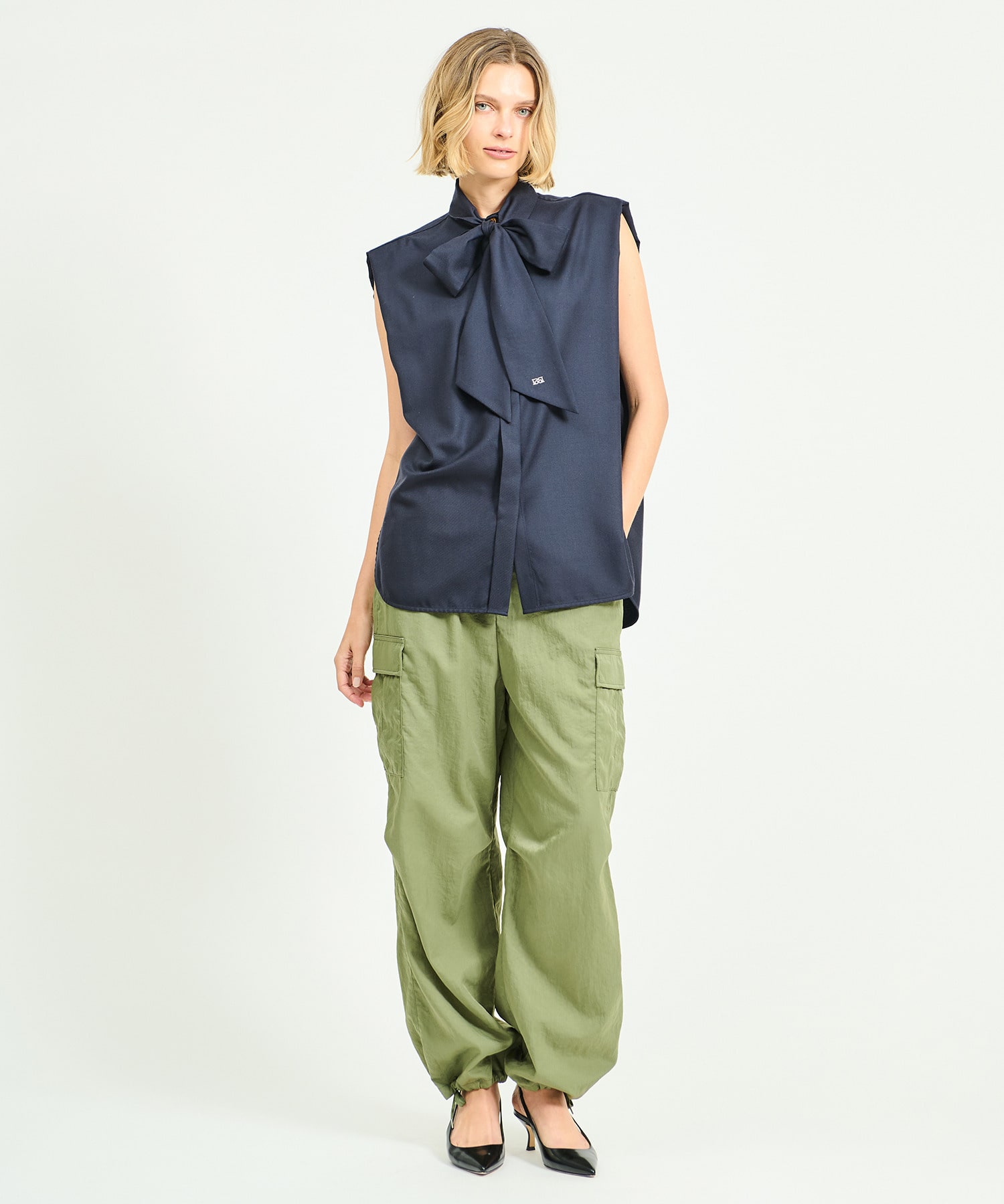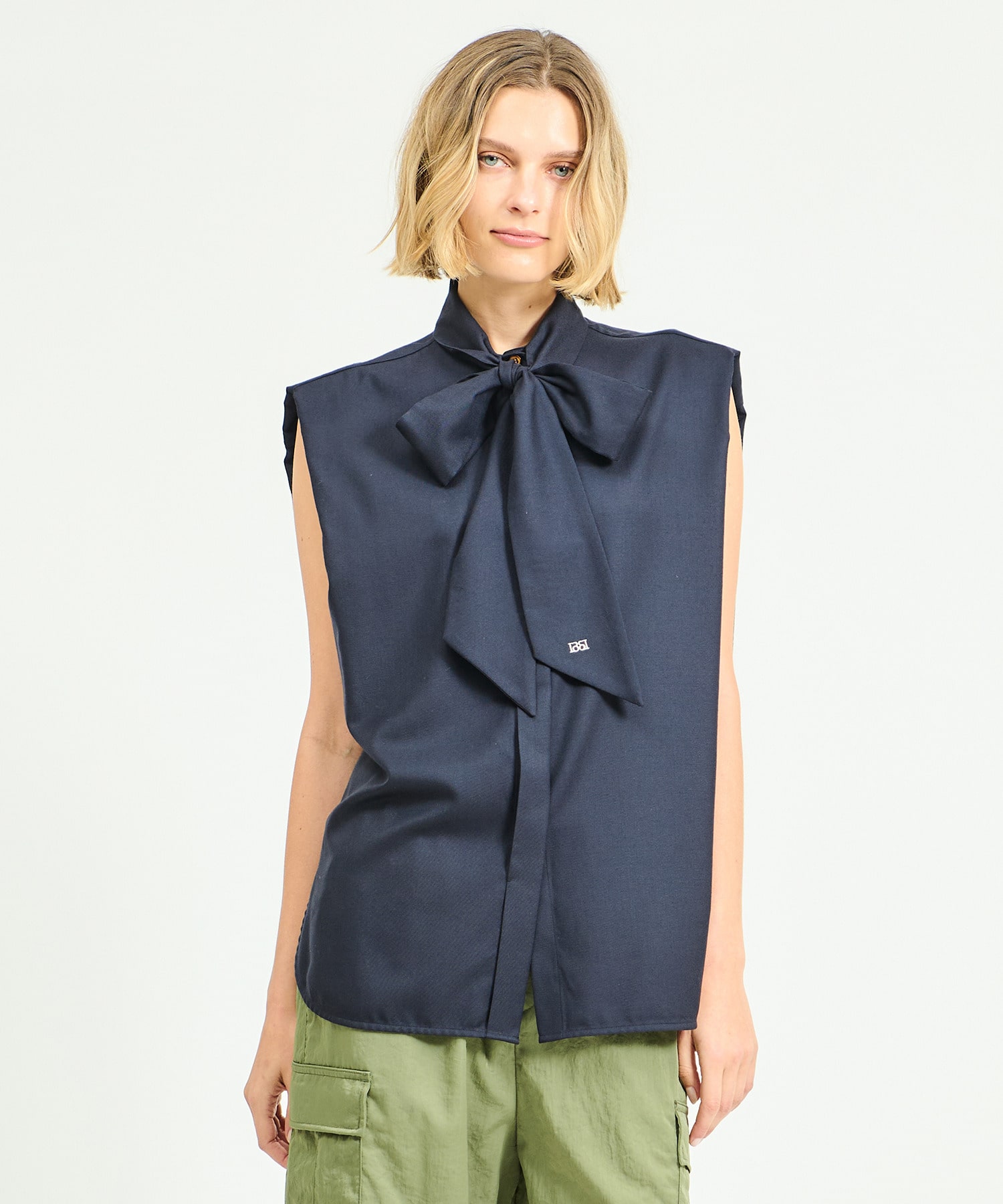 ご好評のボウタイデザインを素材別注したボウタイブラウス。