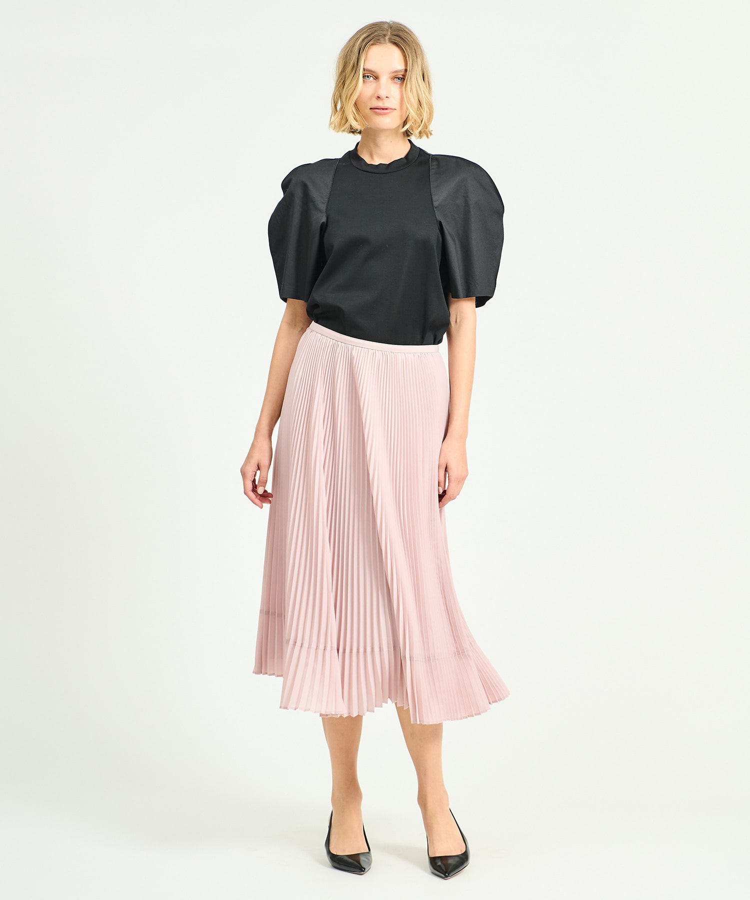 ボリューミーなパフスリーブが華やぎをプラスし、袖を内側から切り替えているので肩幅が広く見えすぎないのもポイント。