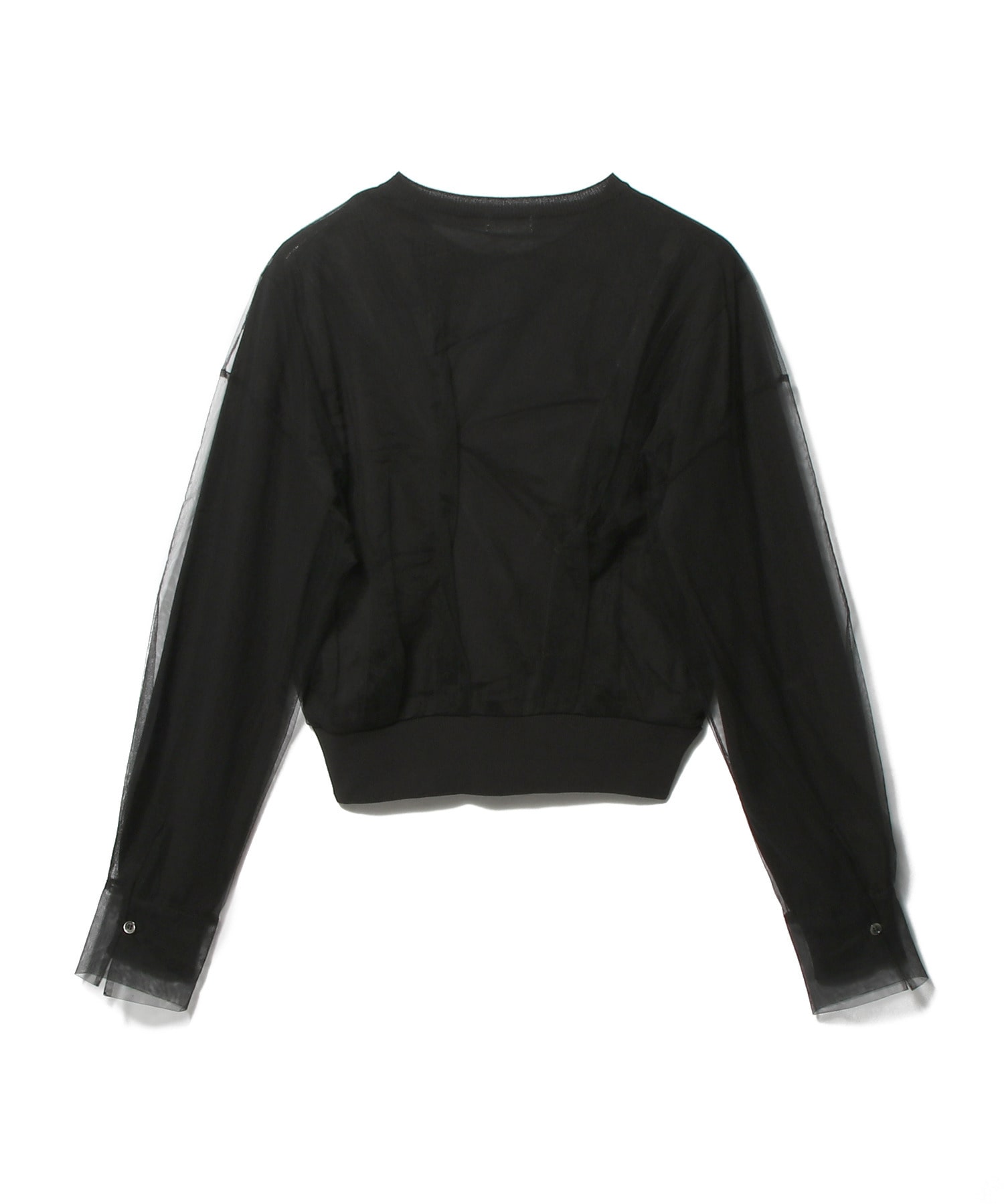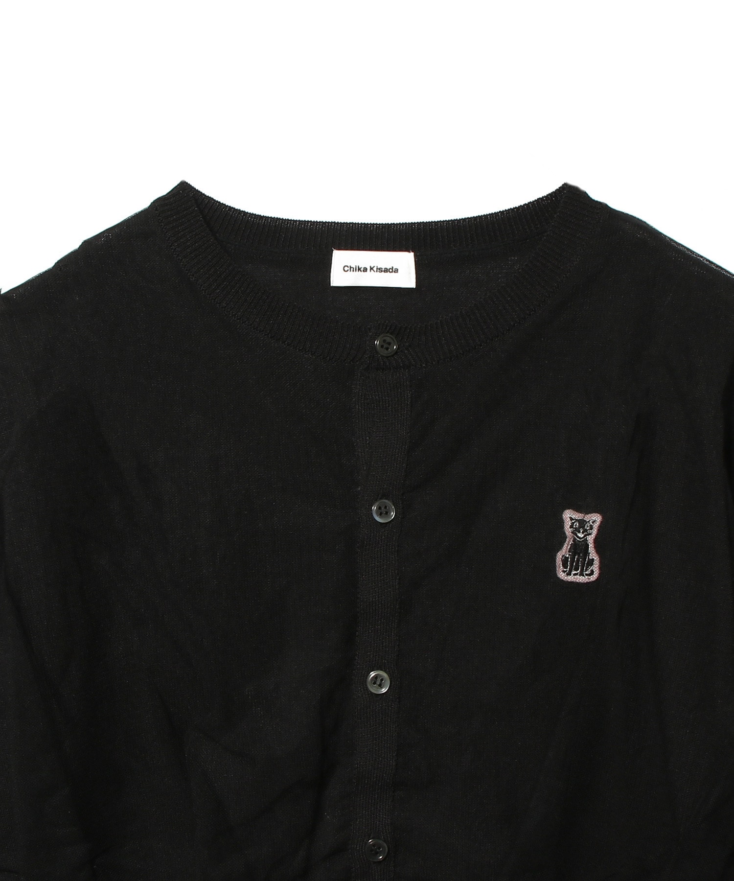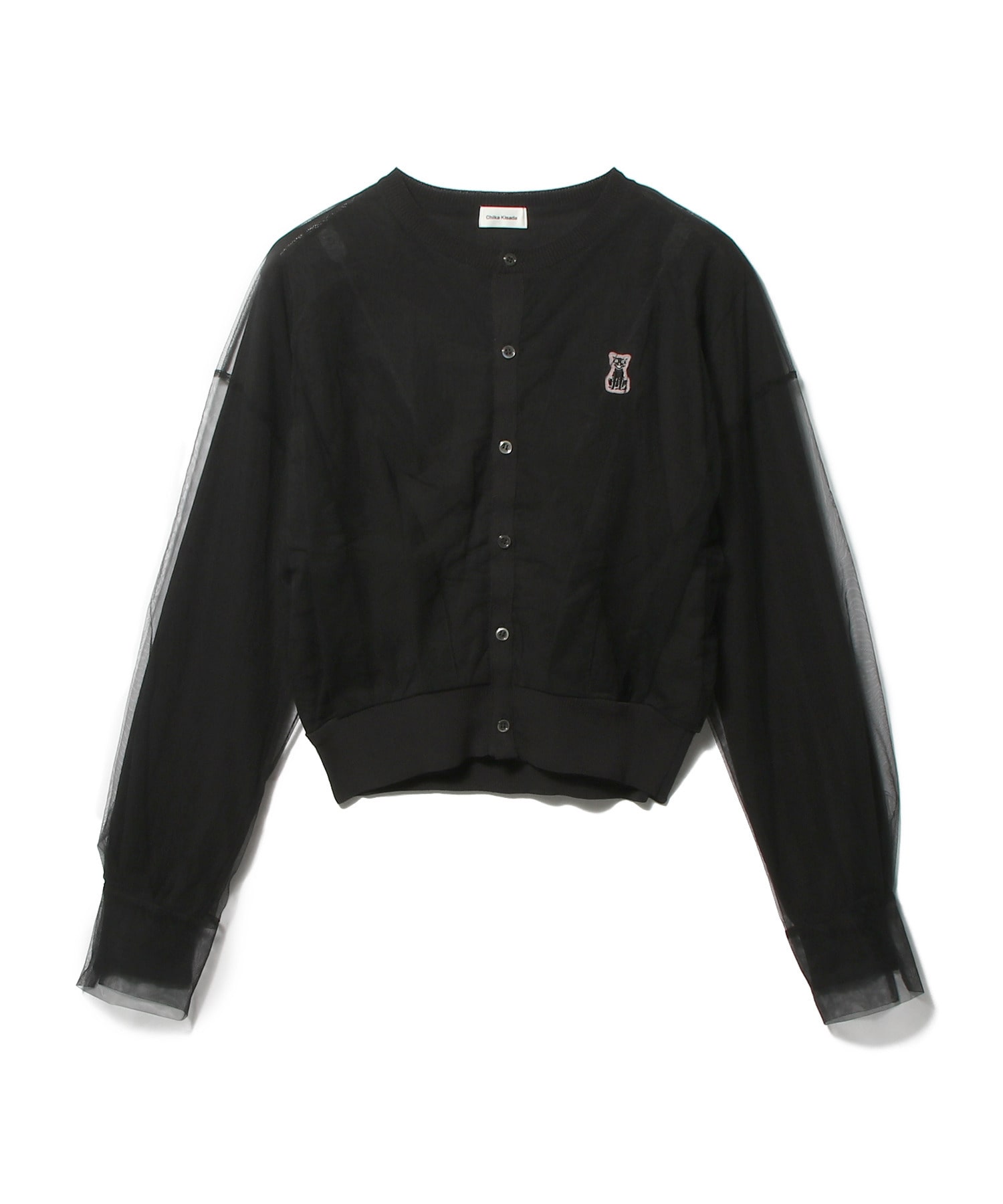 チュールの透け感から覗く黒猫のパッチがポイントのカーディガン。