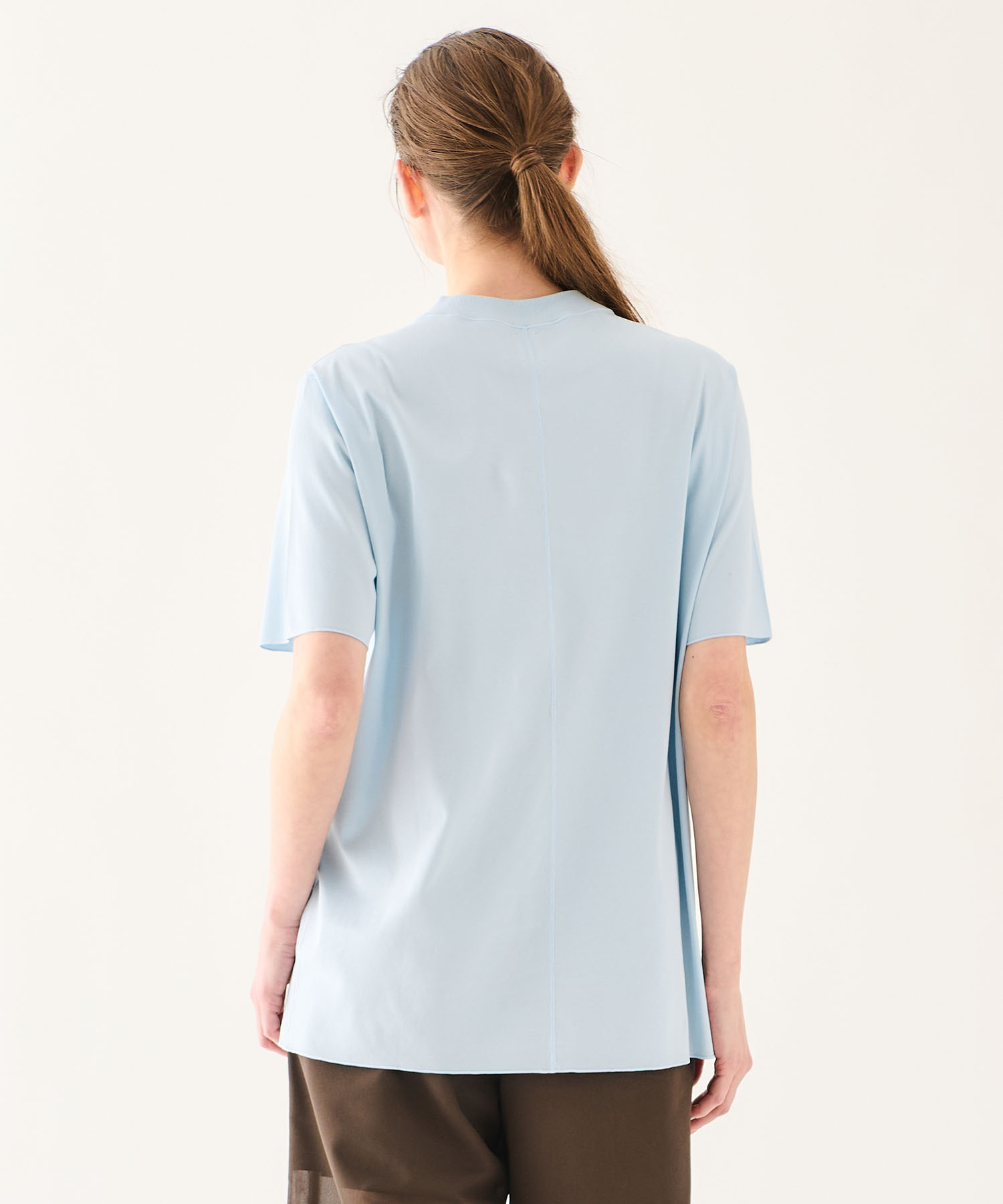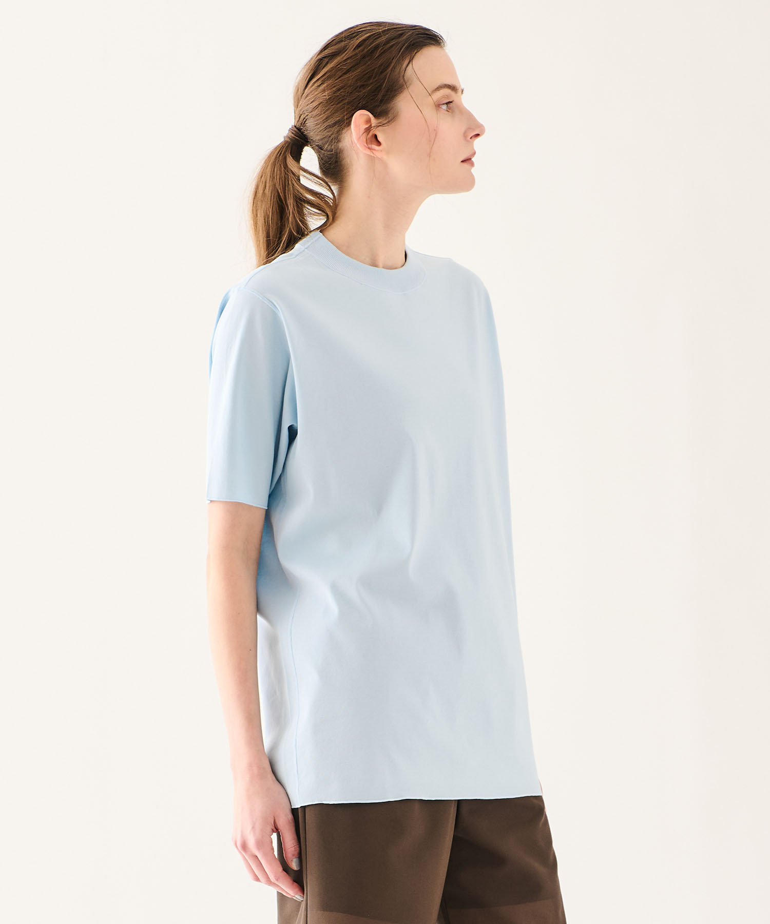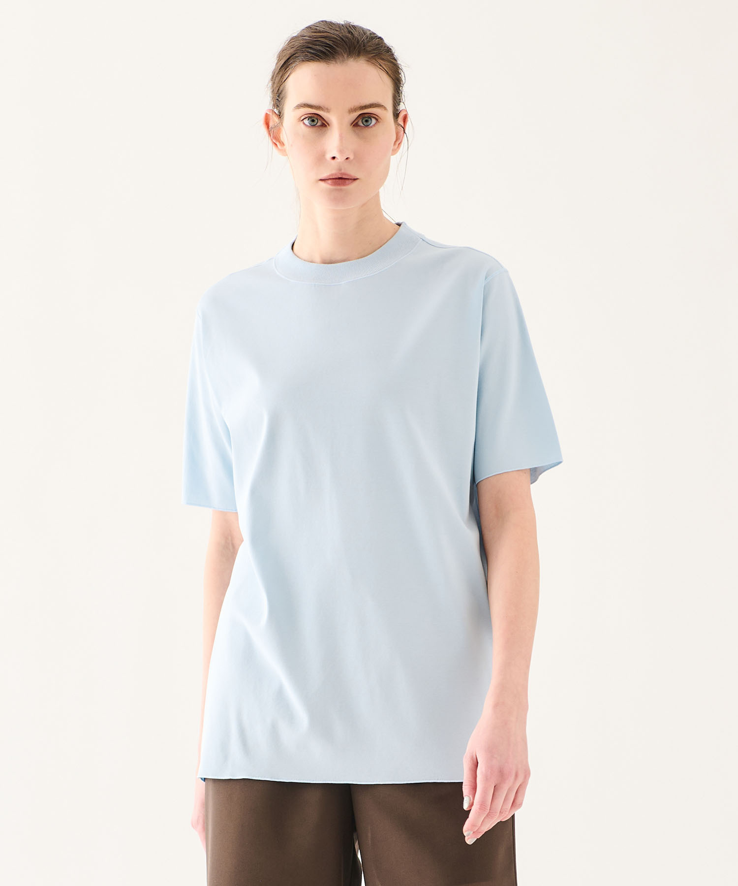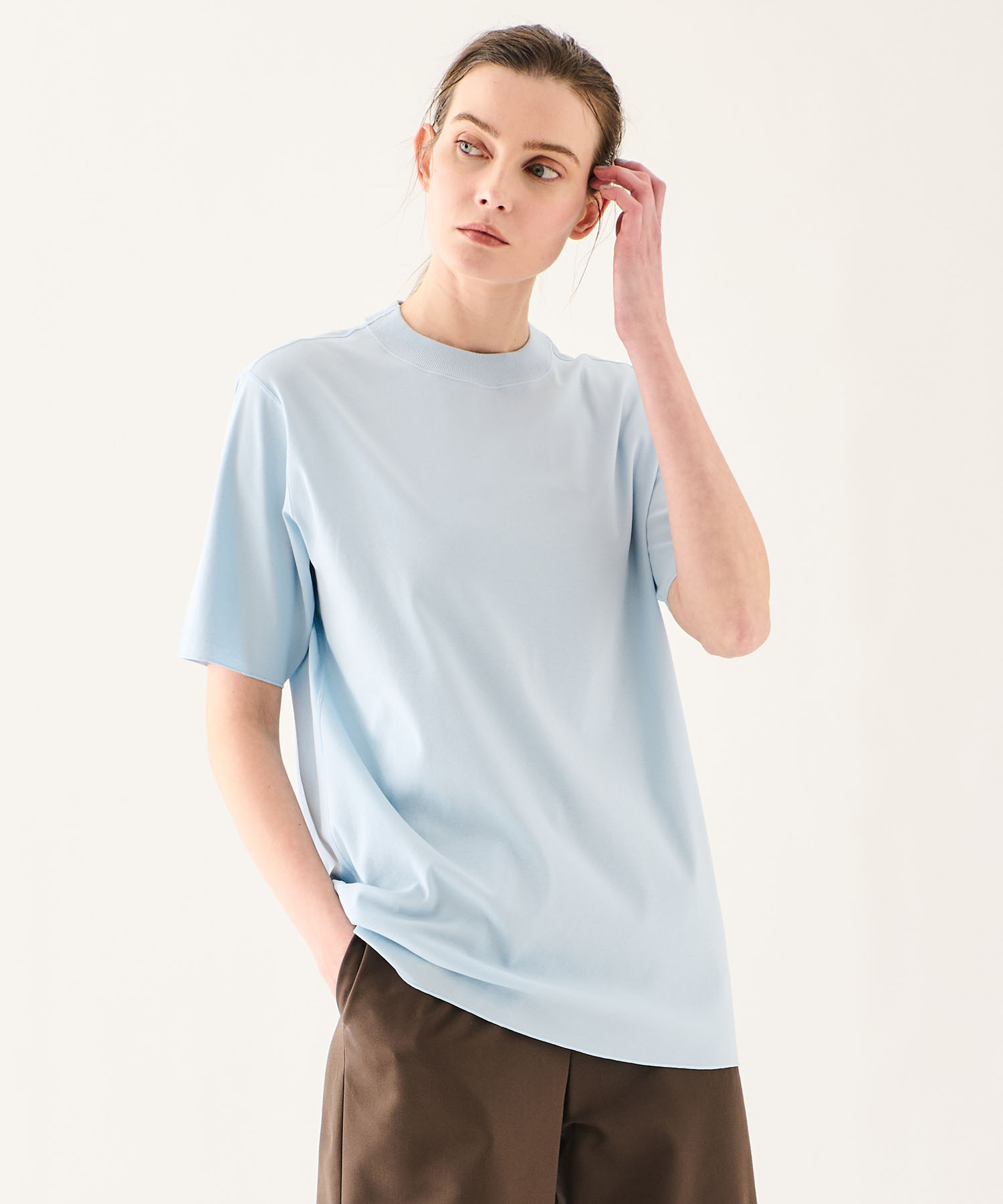 和歌山県の名門ニッターによる、国内でも数台しかないハイゲージ編み機で編み立てた高密度素材を使用。しなやかで伸びやかさがあり、ストレスフリーな着心地を実現しています。表面はサラリとしたタッチで肌離れが良く、暑い時期でも快適に着用いただけるのが魅力です。