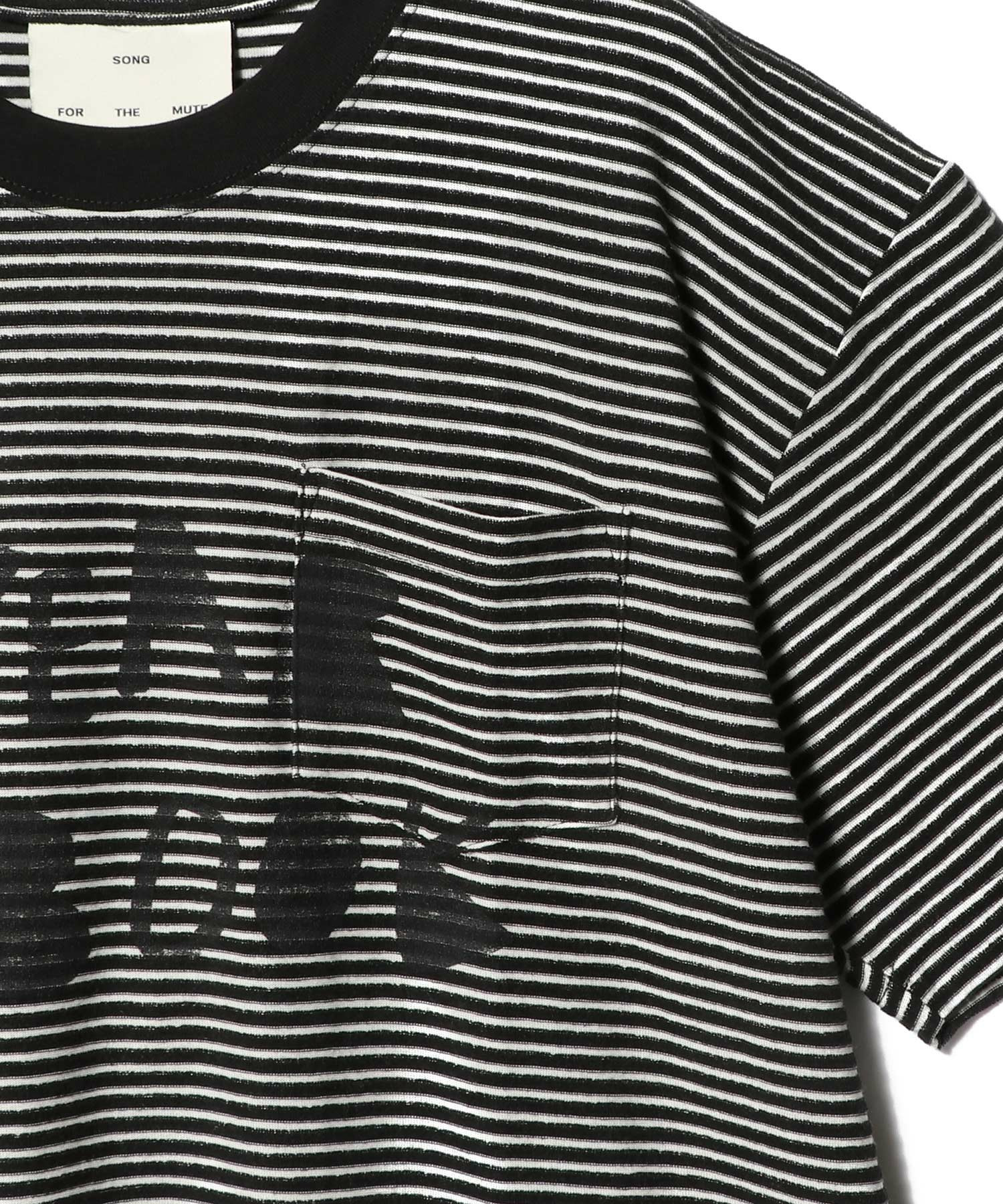 ゆったりとしたシルエットと胸ポケット、フロック加工の胸元プリントが特徴。