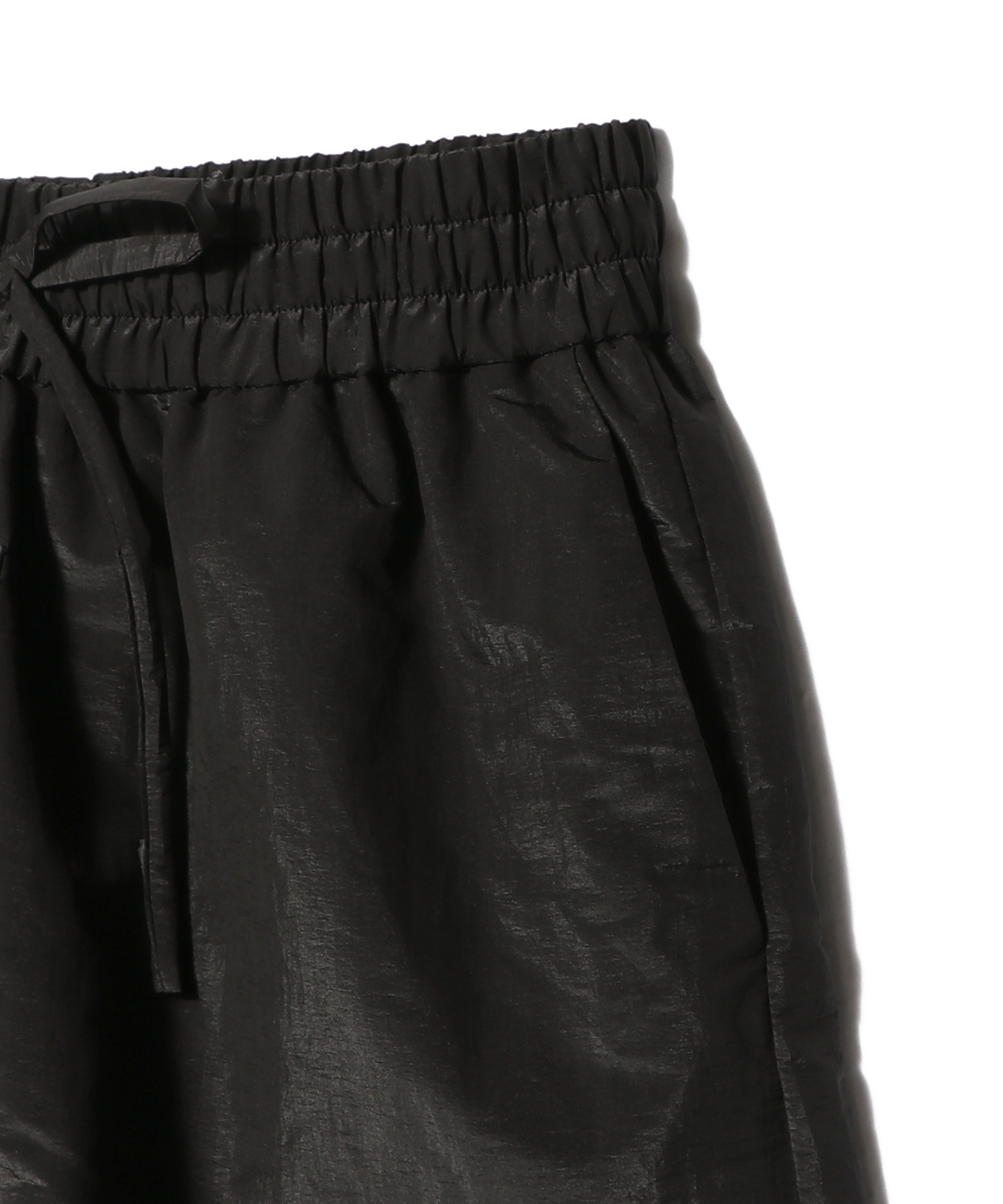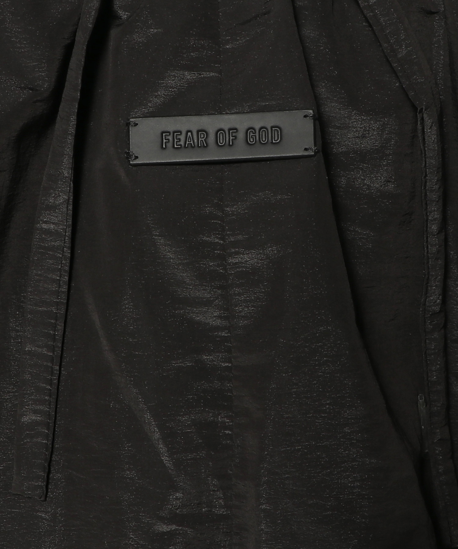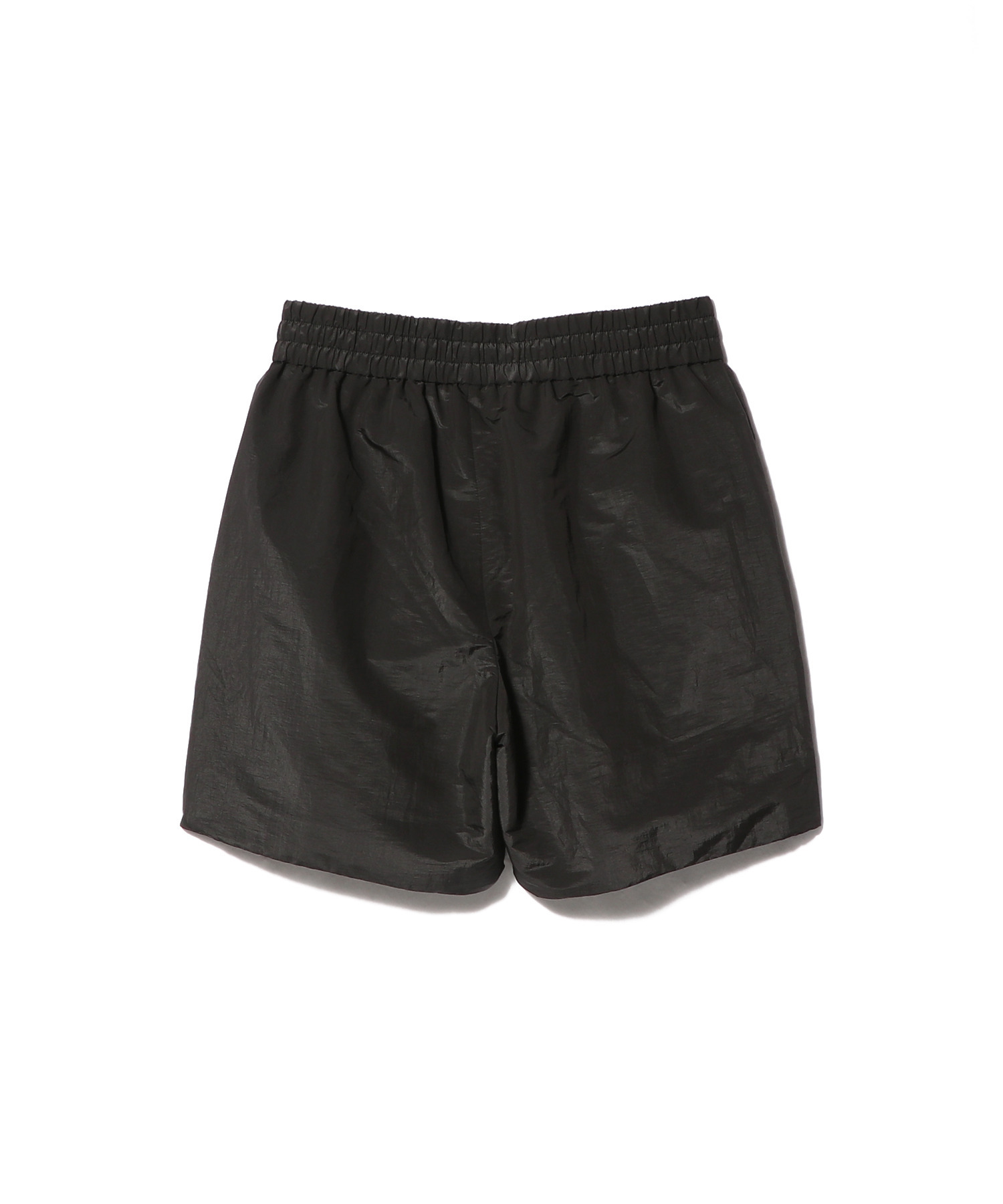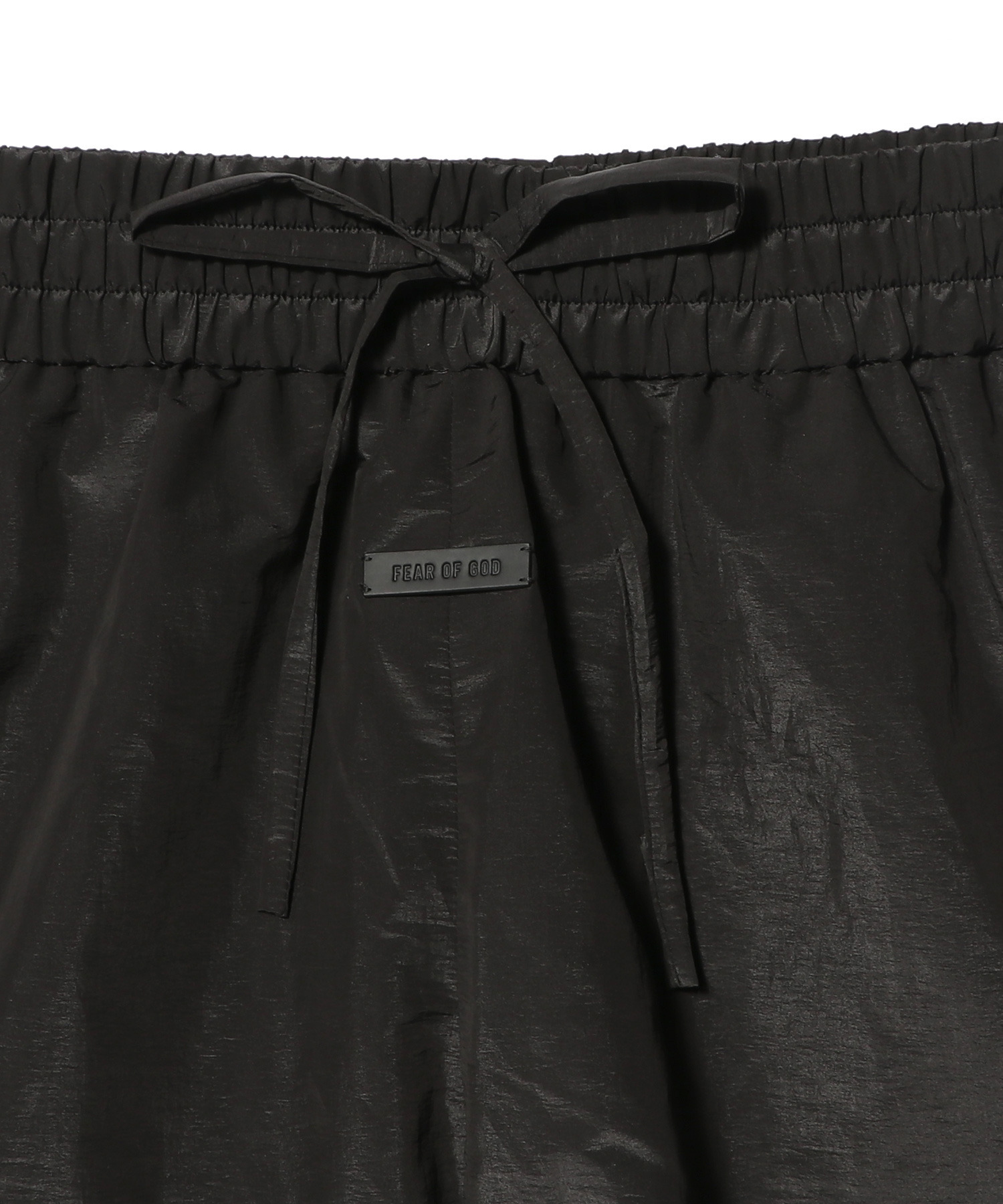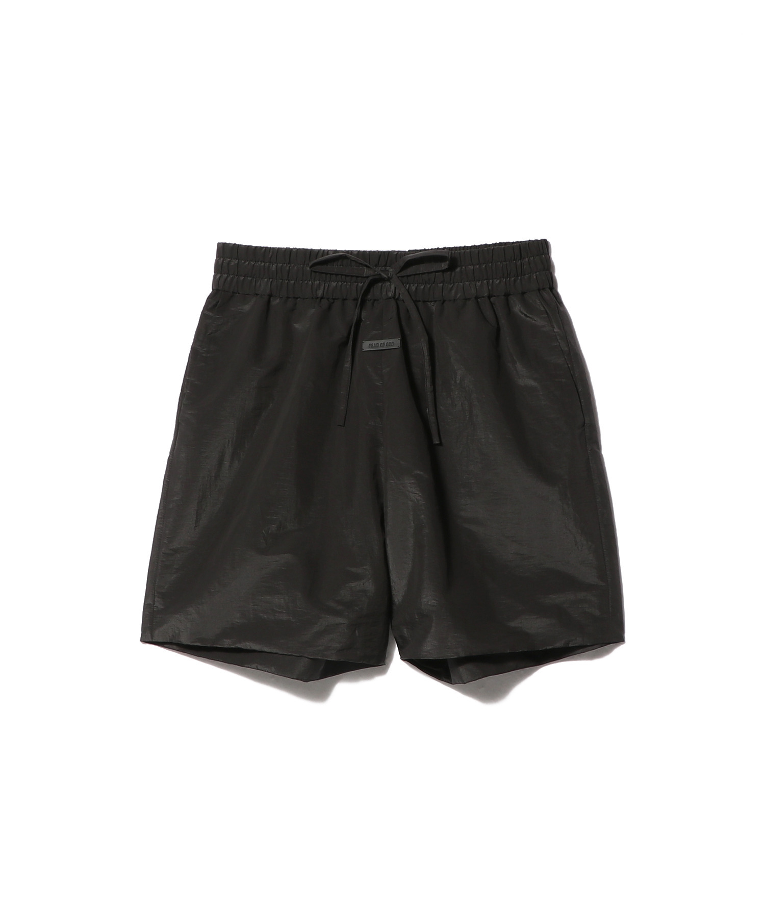 イタリア製で、軽量なナイロンタフタ素材を使用し、しわ加工と光沢感のある仕上がりを実現しています。軽くパッドが入ったこのショーツは、伸縮性のあるウエストバンドと、フロントに斜めに配置されたサイドポケットが特徴です。中央前面には、Fear of Godの象徴的な4ステッチラベルがあしらわれています。