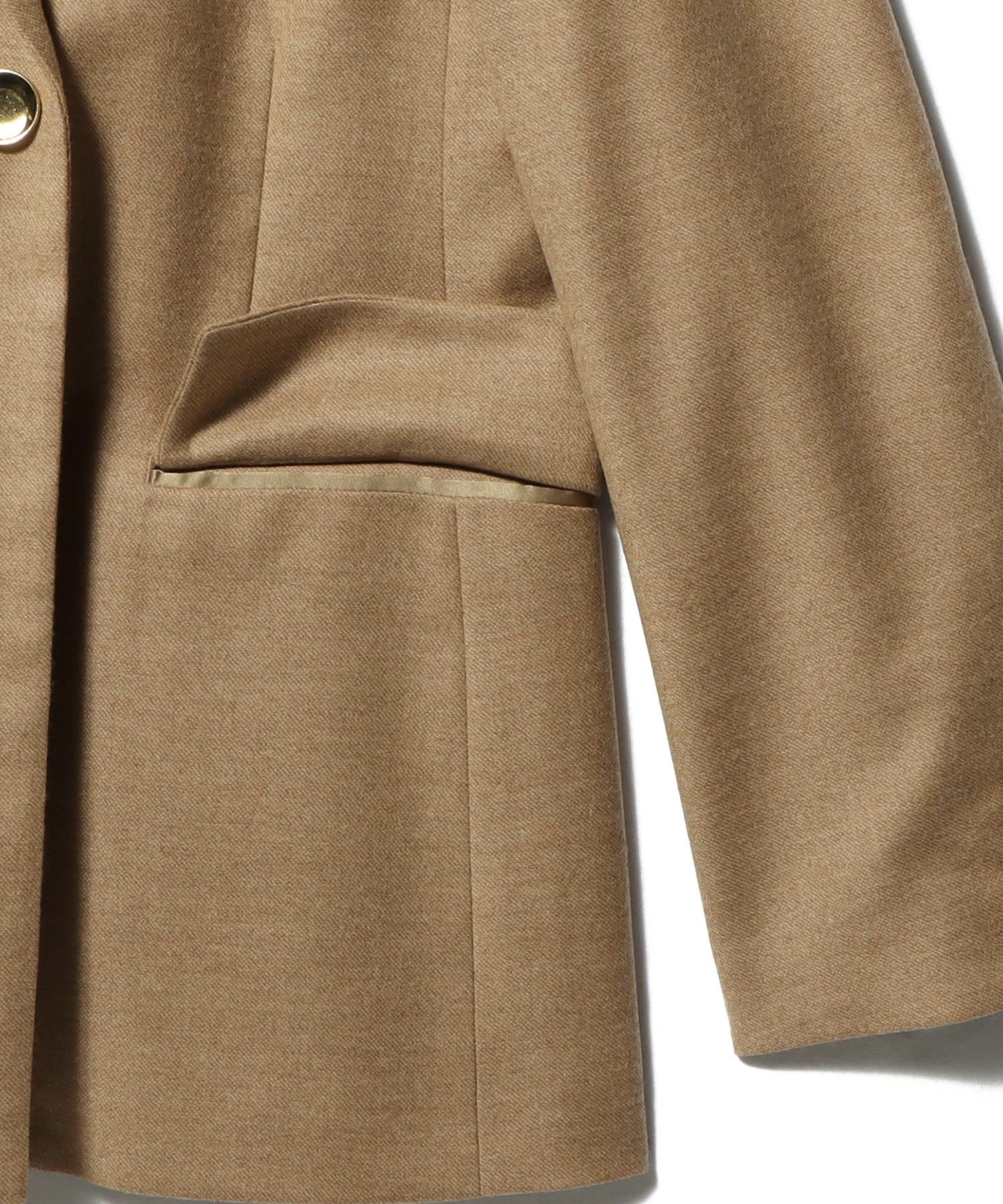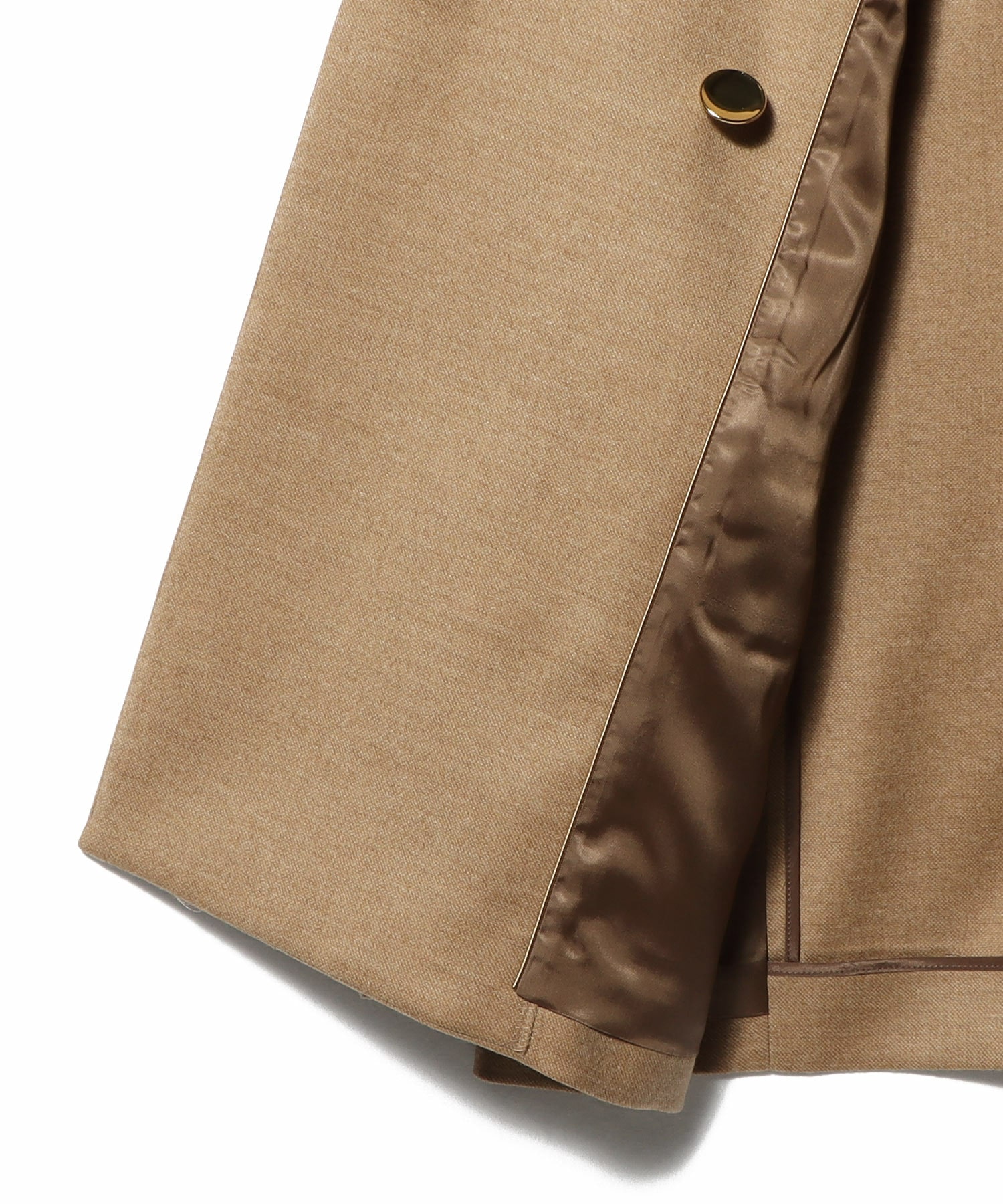 上襟にはサテンをあしらい、上品な光沢が顔まわりを華やかに演出。キャメル寄りのベージュに金ボタンが映え、女性らしい柔らかさを引き立てます。毛羽立ちが出ても、こまめなブラッシングですぐ整うのも高級素材ならではの魅力です。