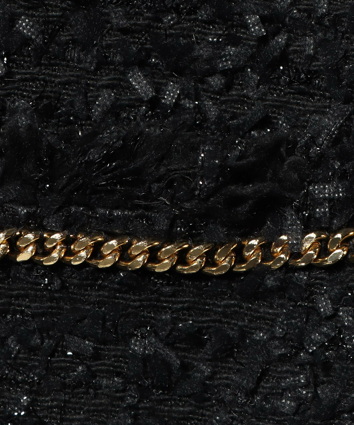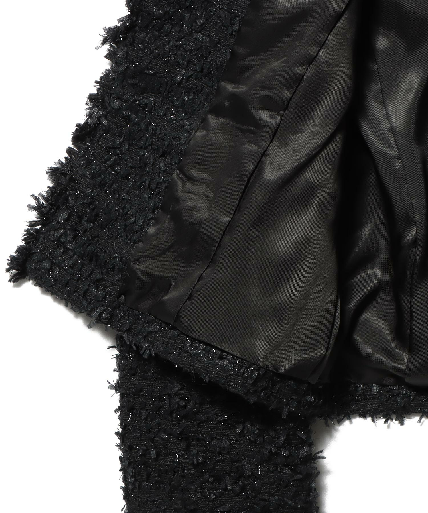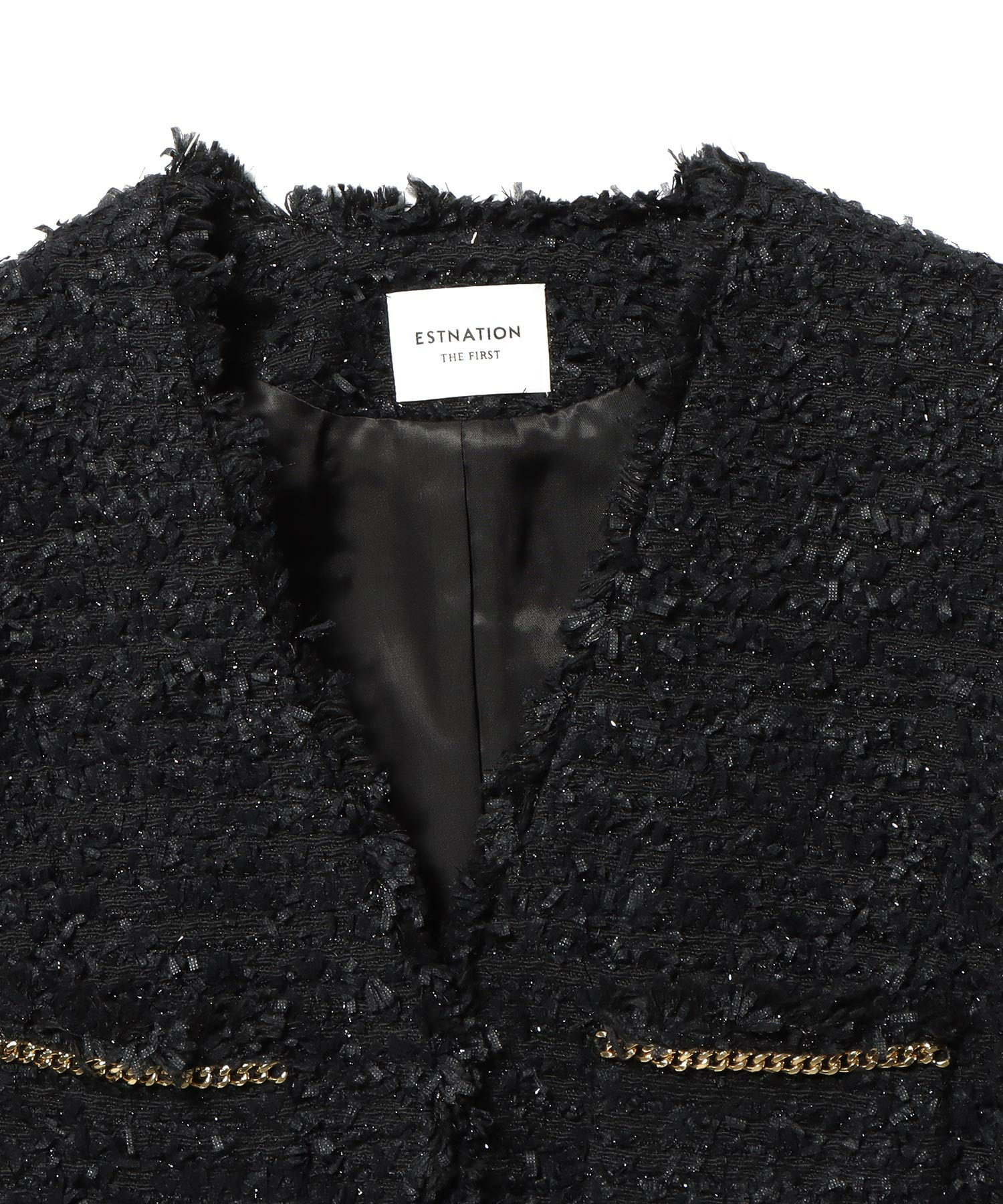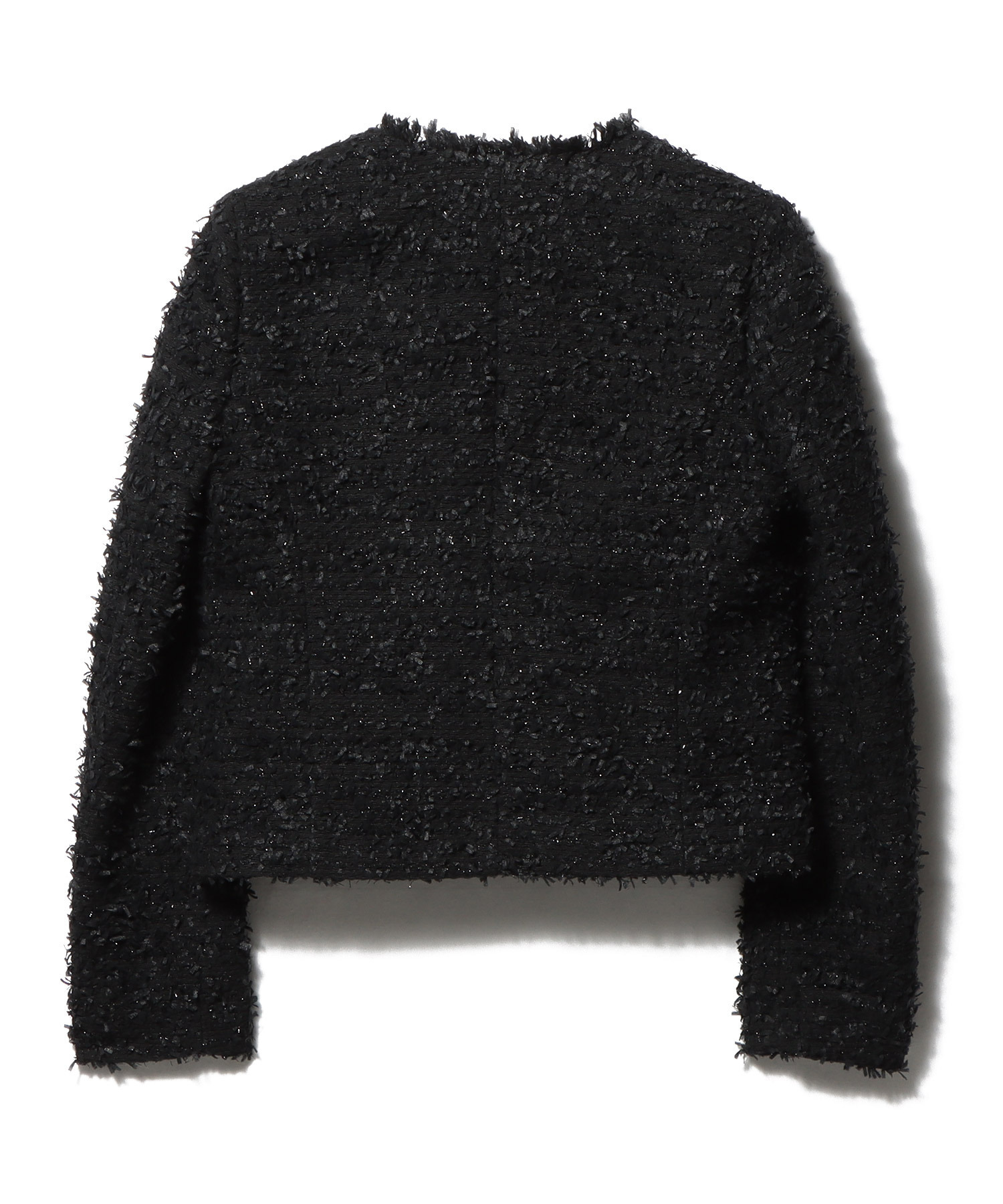 Vネックの開き具合やシャープなシルエットが顔まわりをすっきりと見せてくれるので、ツイード特有の重さを感じさせず洗練された印象に仕上がります。