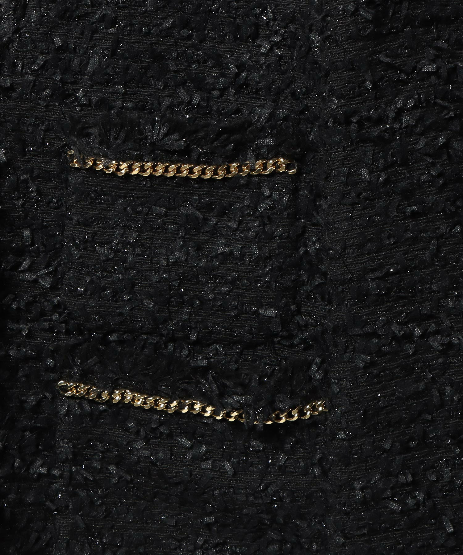 上品な素材感の中に、胸元のポケットに使用した太めのチェーンがアクセントに。