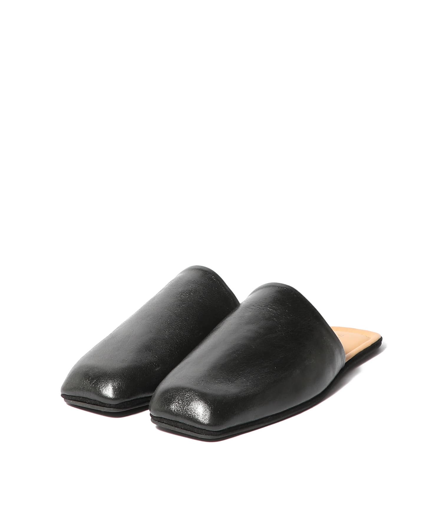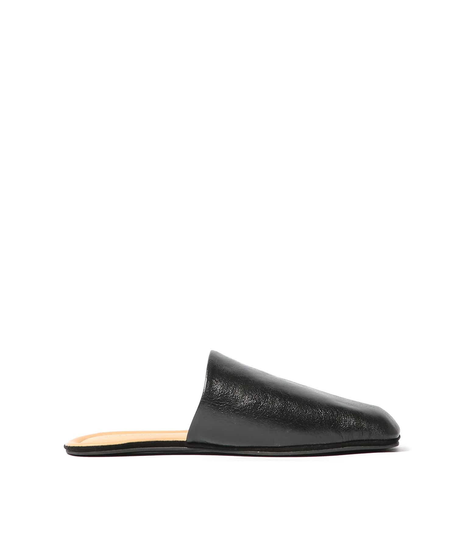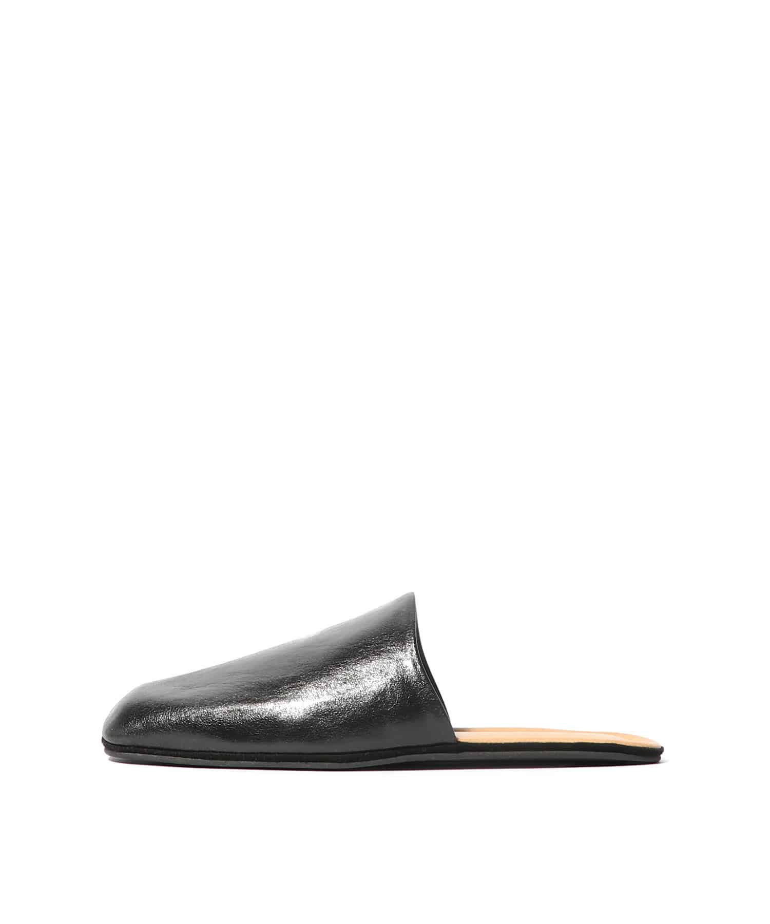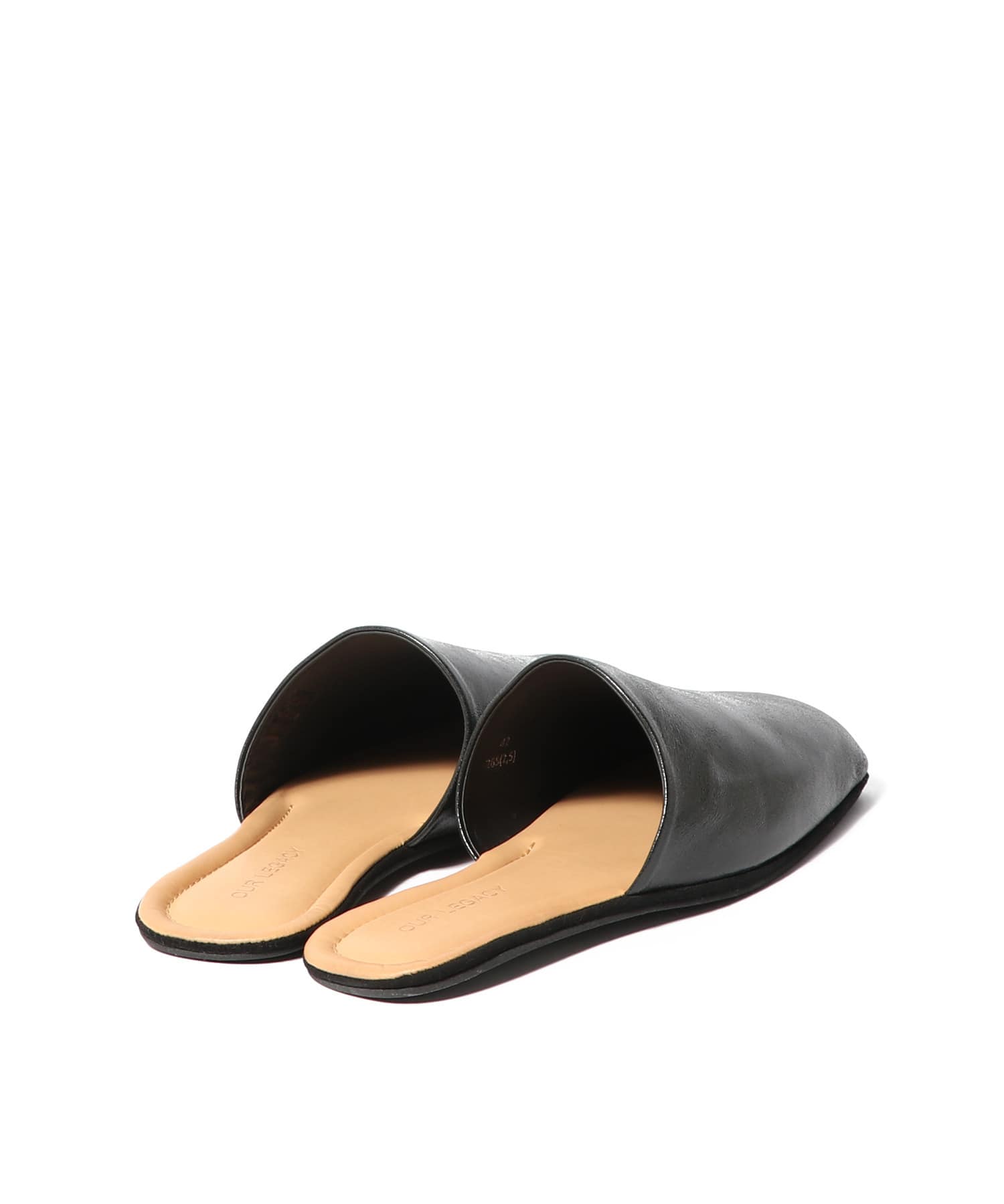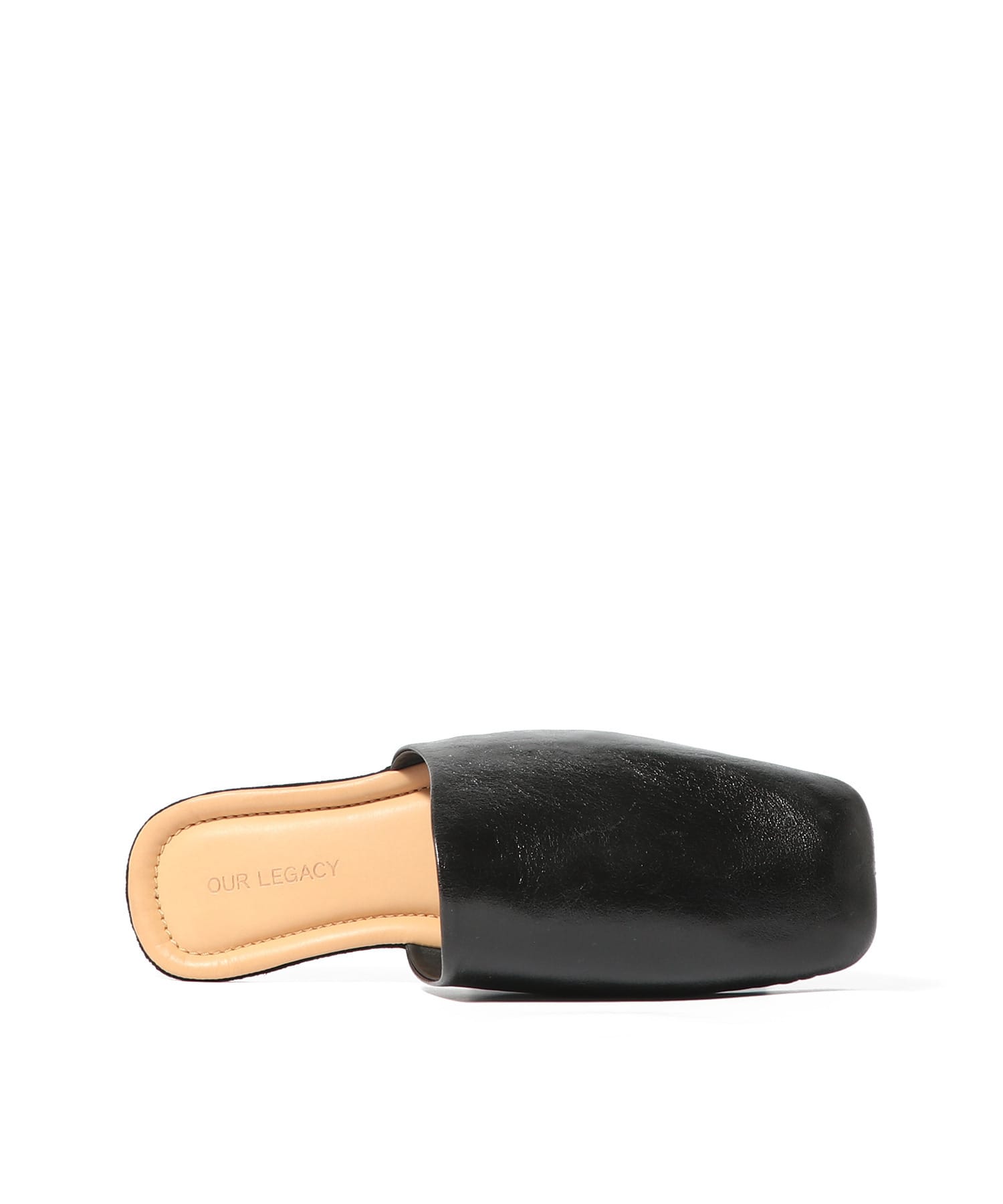 シガールスリッパ、ソムブレサテン牛革仕様。柔らかなイタリアンレザーを使用したフルライニングのスリップオンタイプ。フラットなラバーアウトソール、レザーミッドソール、デボス加工のOur Legacyヒールロゴが特徴です。