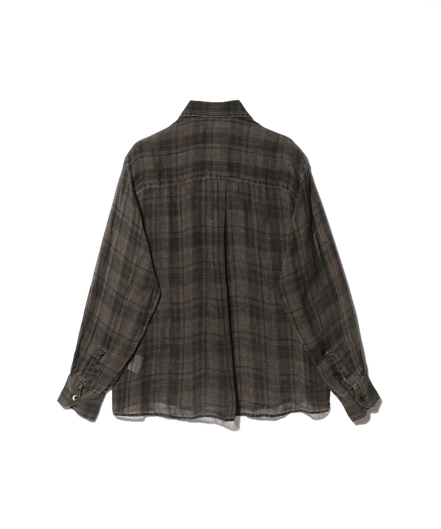当社のアバブシャツ、ペナムブラチェック・シアーコートリネン。イタリア製リネンにペナムブラチェックを施した生地を使用。顔料コーティング後、洗い加工を施すことで、色味が柔らかく、独特の風合いを持つ、使い込まれたような外観を実現。この加工により、一点一点に独自の色合いと個性が生まれます。メンズアバブシャツは、ややオーバーサイズフィット。シングルチェストポケット、真珠貝ボタン、OL刺繍、カーブドヘム、マイタードカフスを特徴としています。