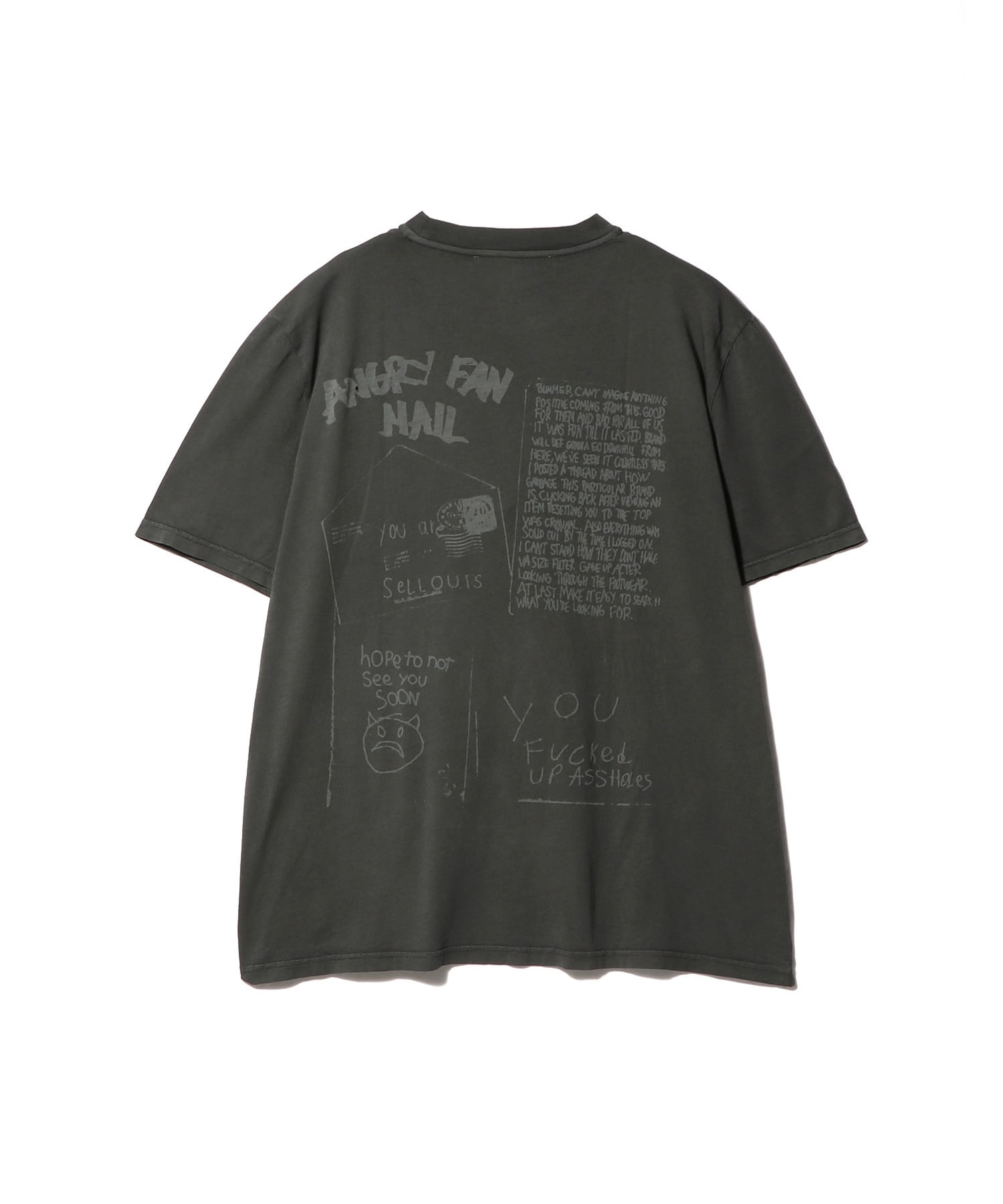ポルトガル産コットンジャージーを使用したボックスTシャツ。ポルトガル産コットンジャージーで製造されたボックスTシャツは、顔料染めを施した後、レーザープリントで色を焼き抜くことで、ソーシャルメディア上のコメントを風刺した「Angry Fan Mail」グラフィックを浮かび上がらせています。ワイドでボックス型のシルエットに、細リブの襟とストレートヘムが特徴です。