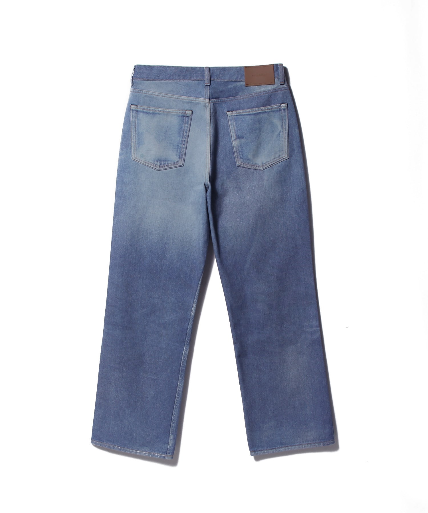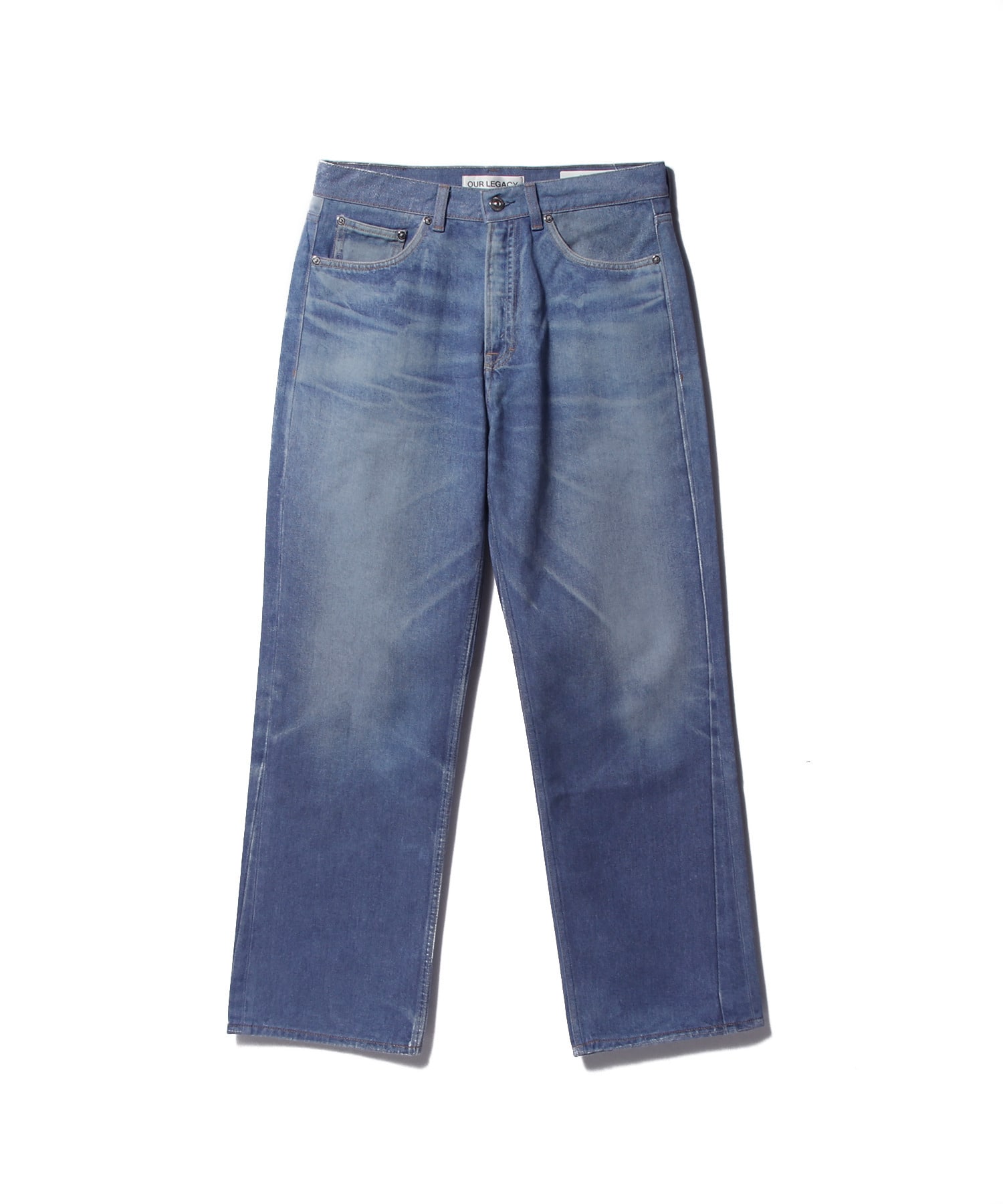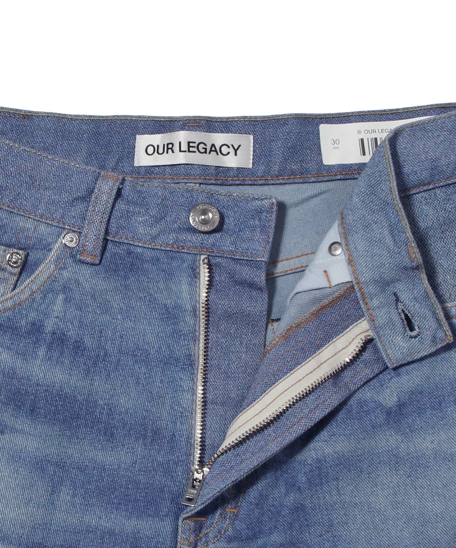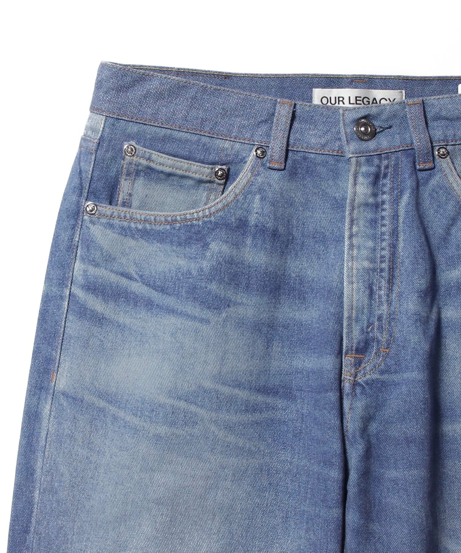 デジタルブルーオーロラプリントのサードカット。イタリア製デニムにトロンプルイユのヴィンテージデニムプリントを施したメンズサードカットは、ゆったりとしたフィット感とワイドストレートレッグが特徴。YKKジップフライ、メタルリベット、補強されたバックポケットを含む5ポケット、そしてOur Legacyラバーパッチを備えています。