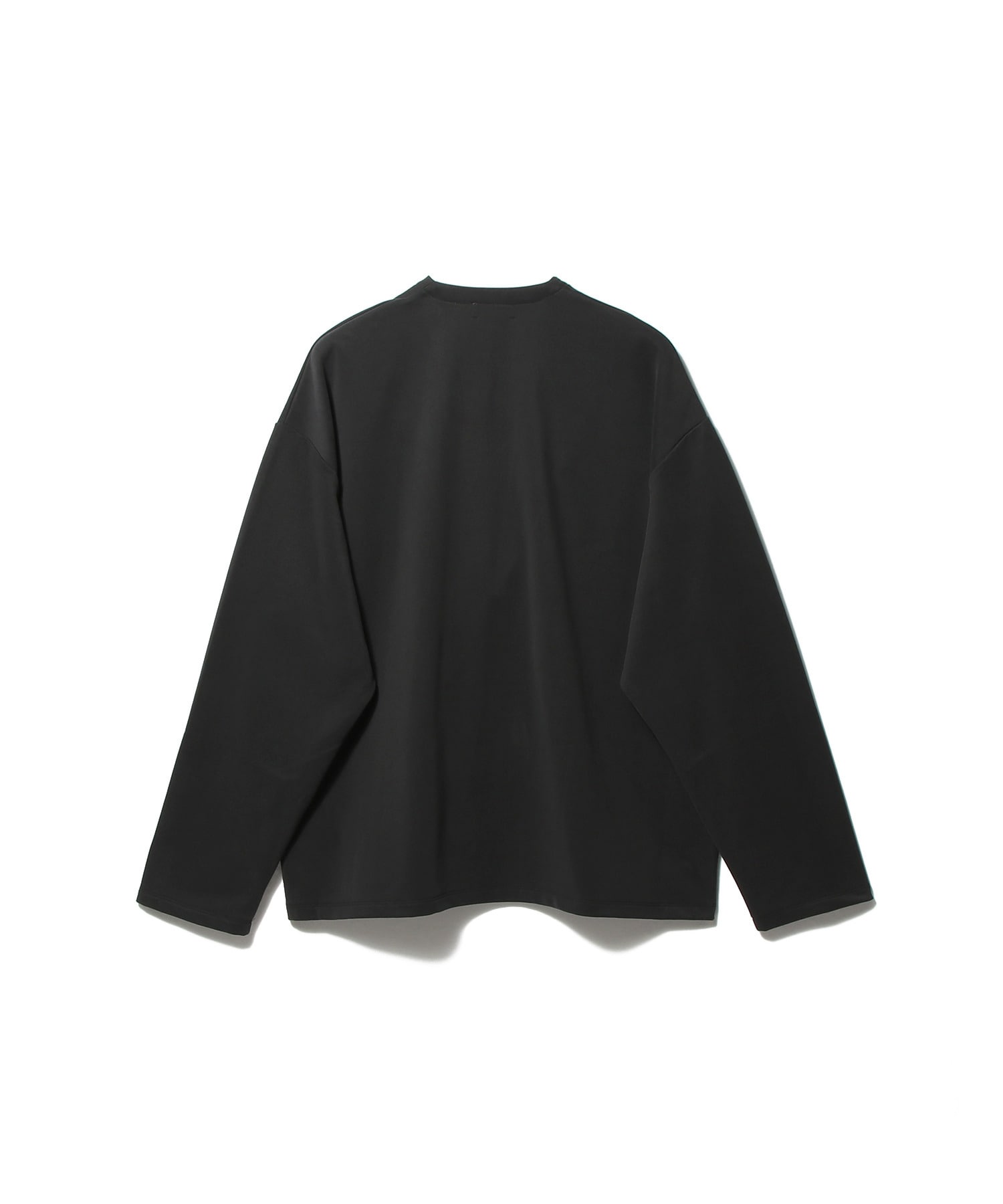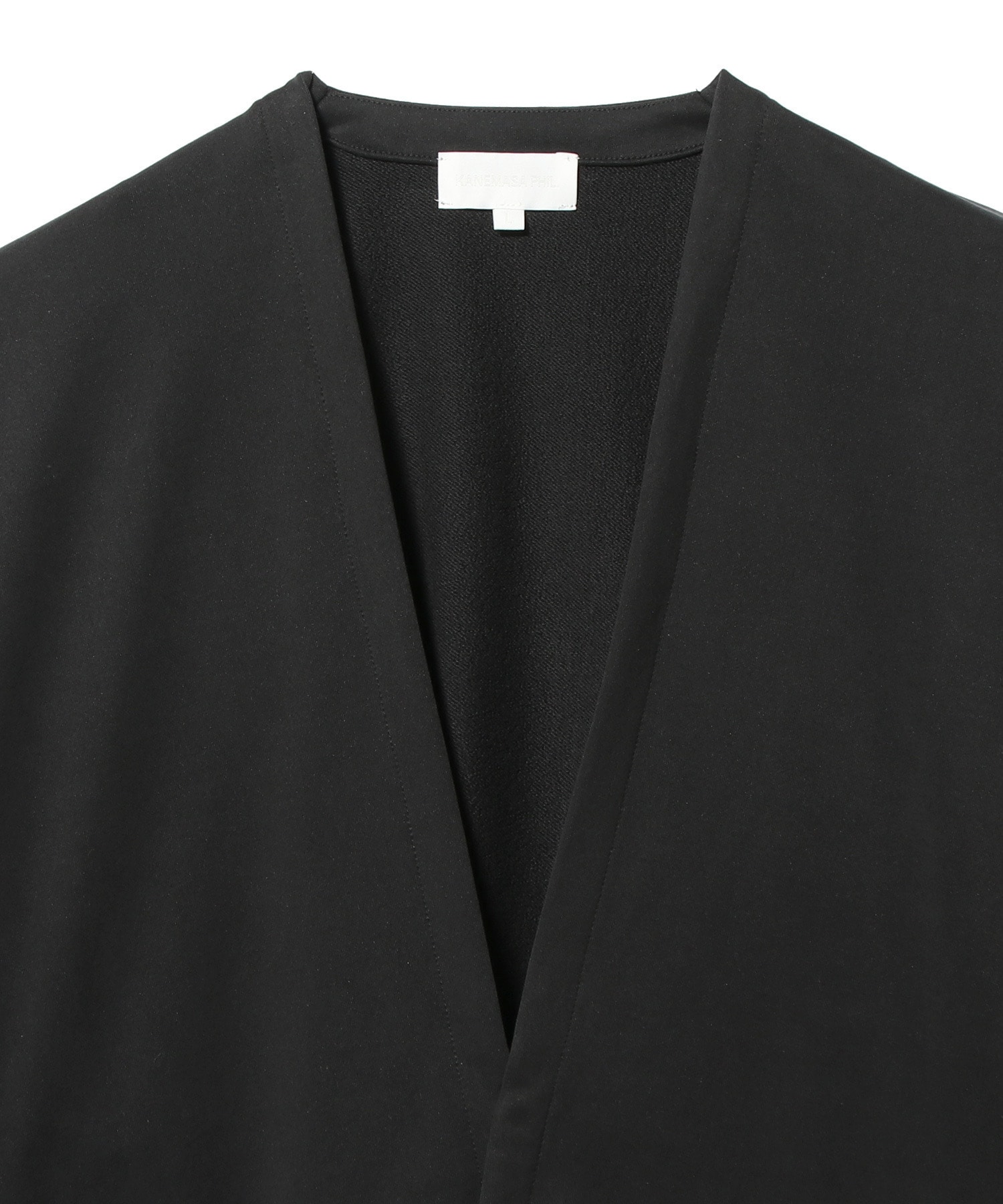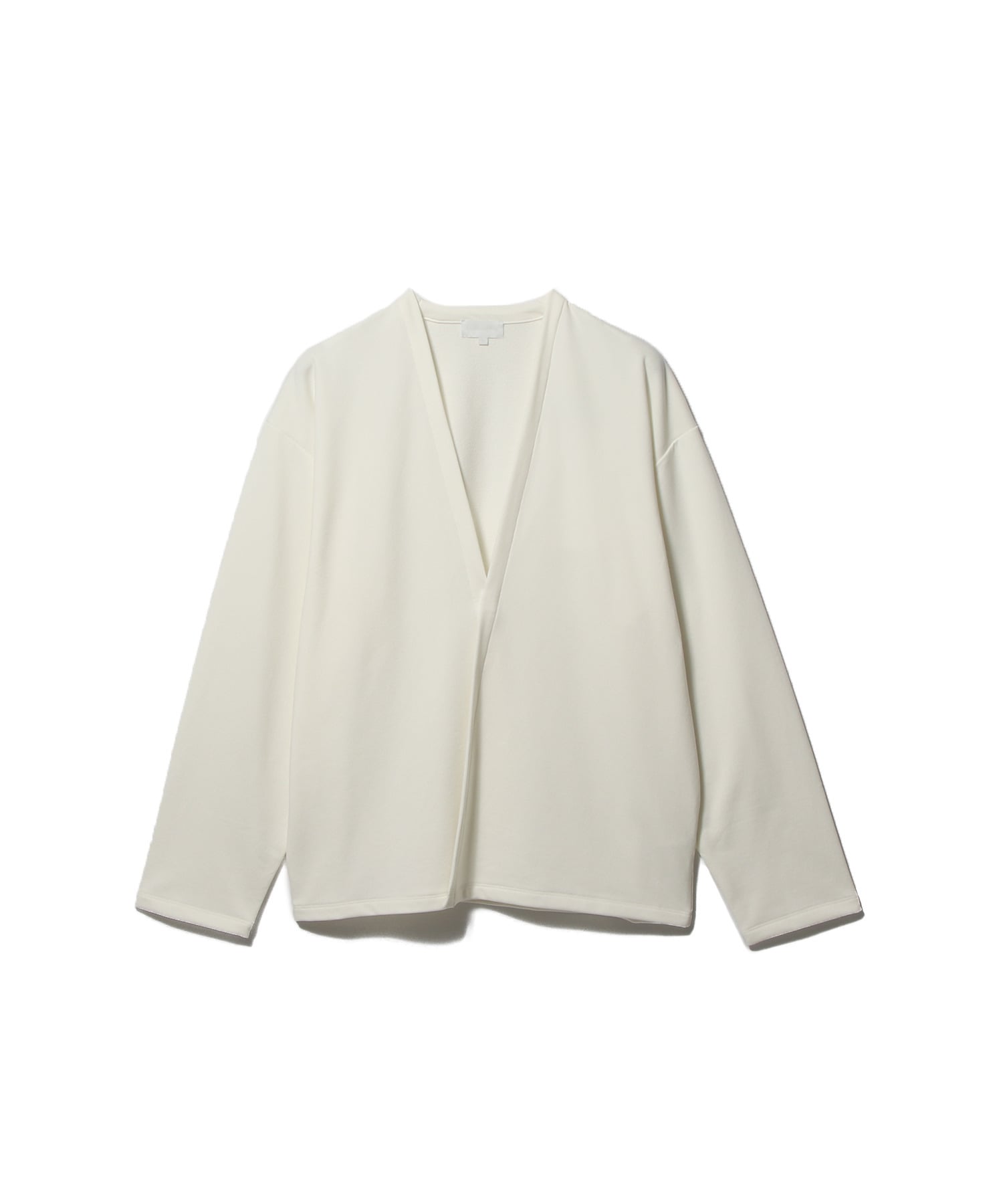 表糸には105Dの高収縮キュプラ糸を採用。仕上げにフィブリル加工(繊維内部の微細な繊維を摩擦によって毛羽立たせる加工)を施すことで、他にはない独特な光沢感と、しっとりとしたヌメリのある風合いを生み出しています。裏面にはスビンコットンの双糸を使用し、さらりとした着心地を実現。スウェットと天竺の中間にあたる絶妙な肉感で、オールシーズン着用可能です。デザインは新型のボタンレスカーディガン。さっと羽織りやすいシルエットで、素材の良さが最大限に引き立つよう、ミニマルに整えた一着です。