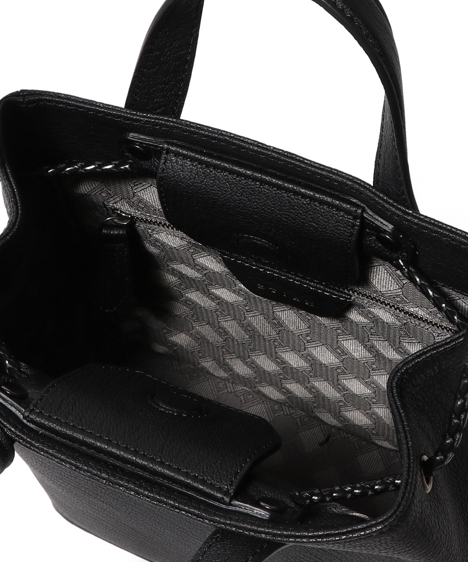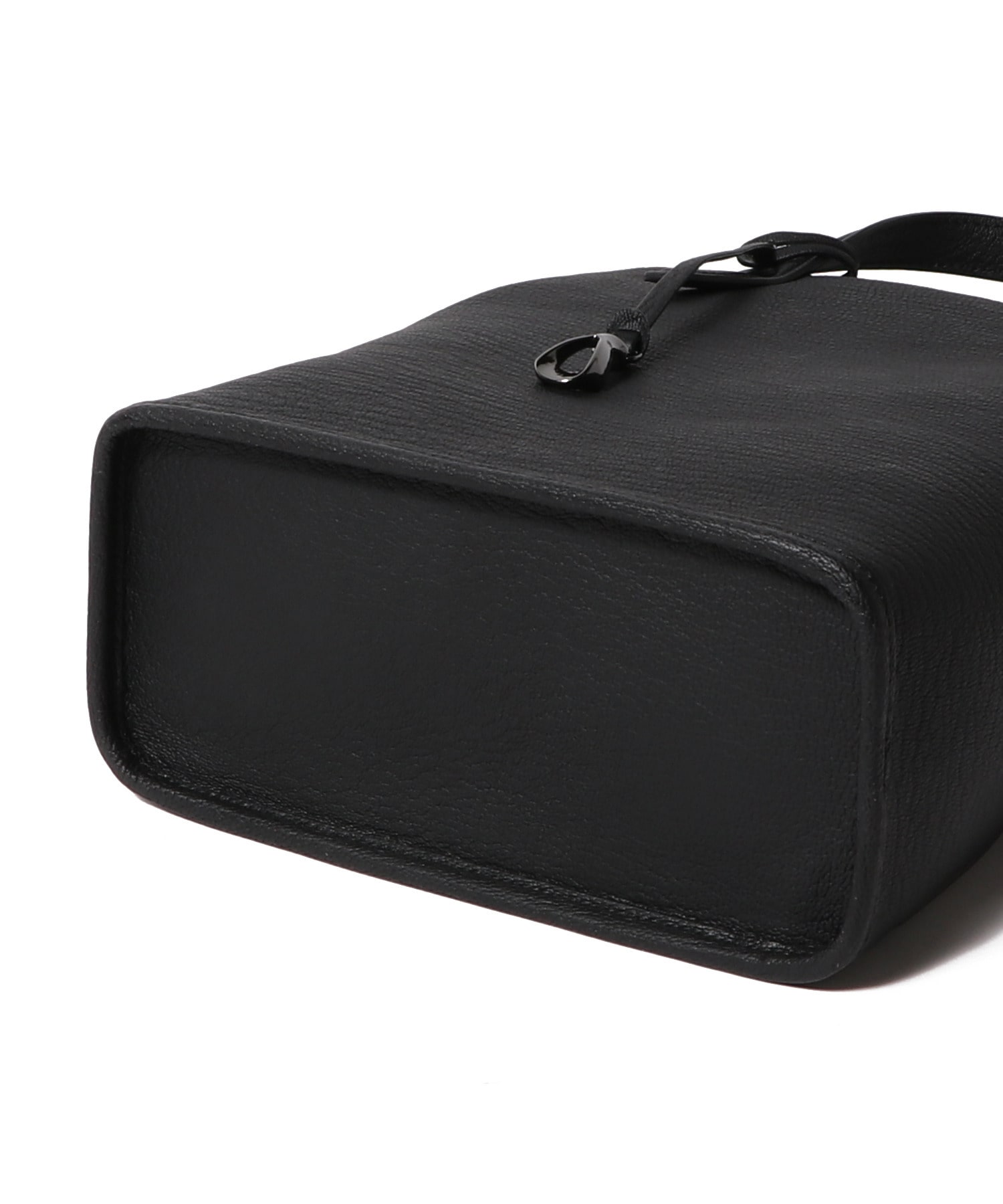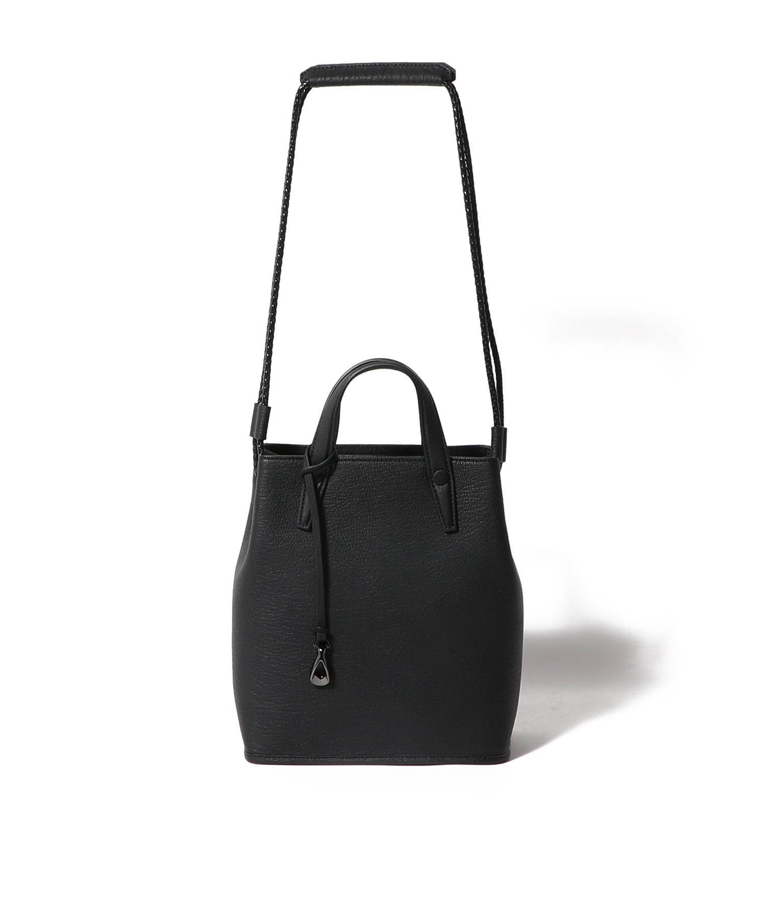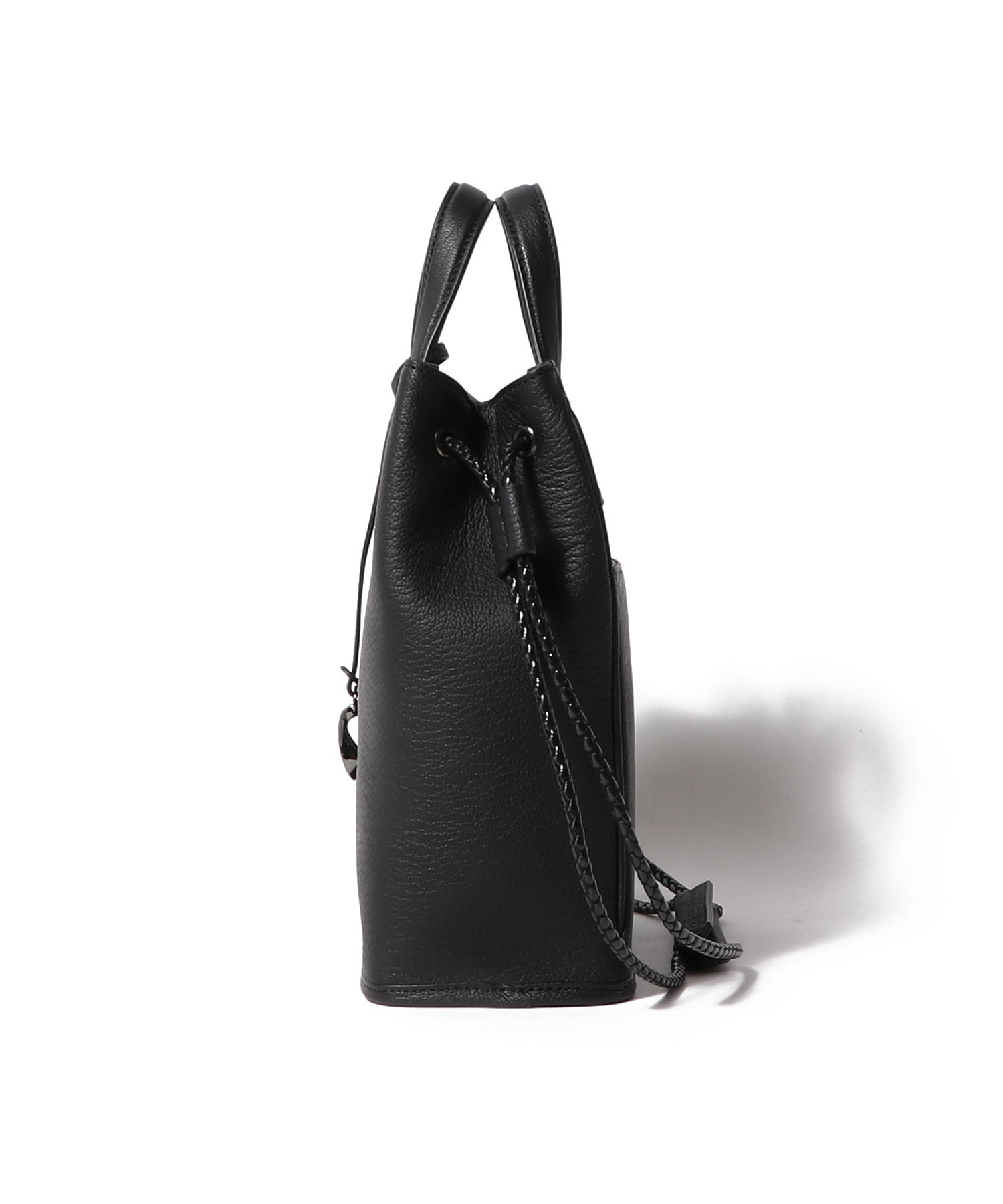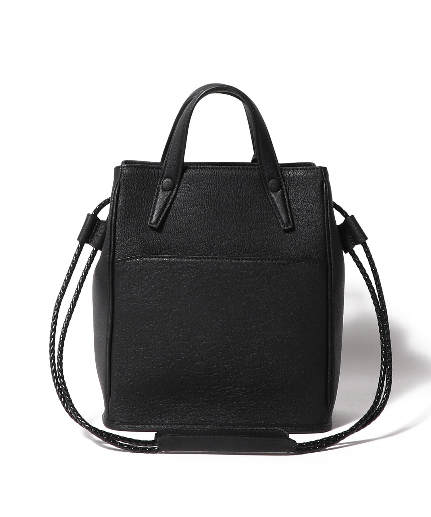 巾着型のドローストリング仕様で、紐の動きが美しく絞られたマチに遊び心を添えながら、前面・背面は内装に通すことで、洗練されたスタイリュシュな佇まいへ。持ち手部分のストラップをベルトテープから、強度に優れたレザーを編み込んだような上質なポリエステルに変更することでよりモダンで上品な印象に仕上げました。適度なサイズ感で、デイリーに使いやすいアイテムです。
