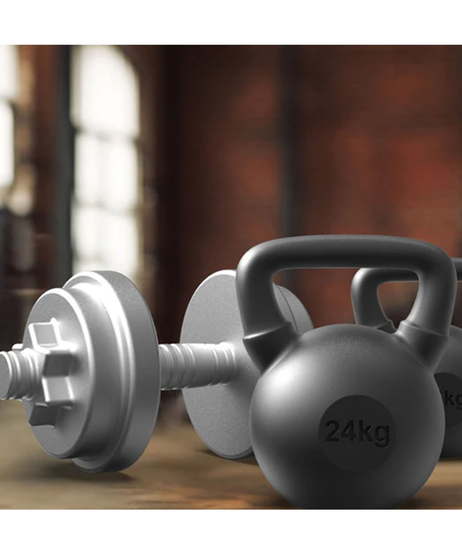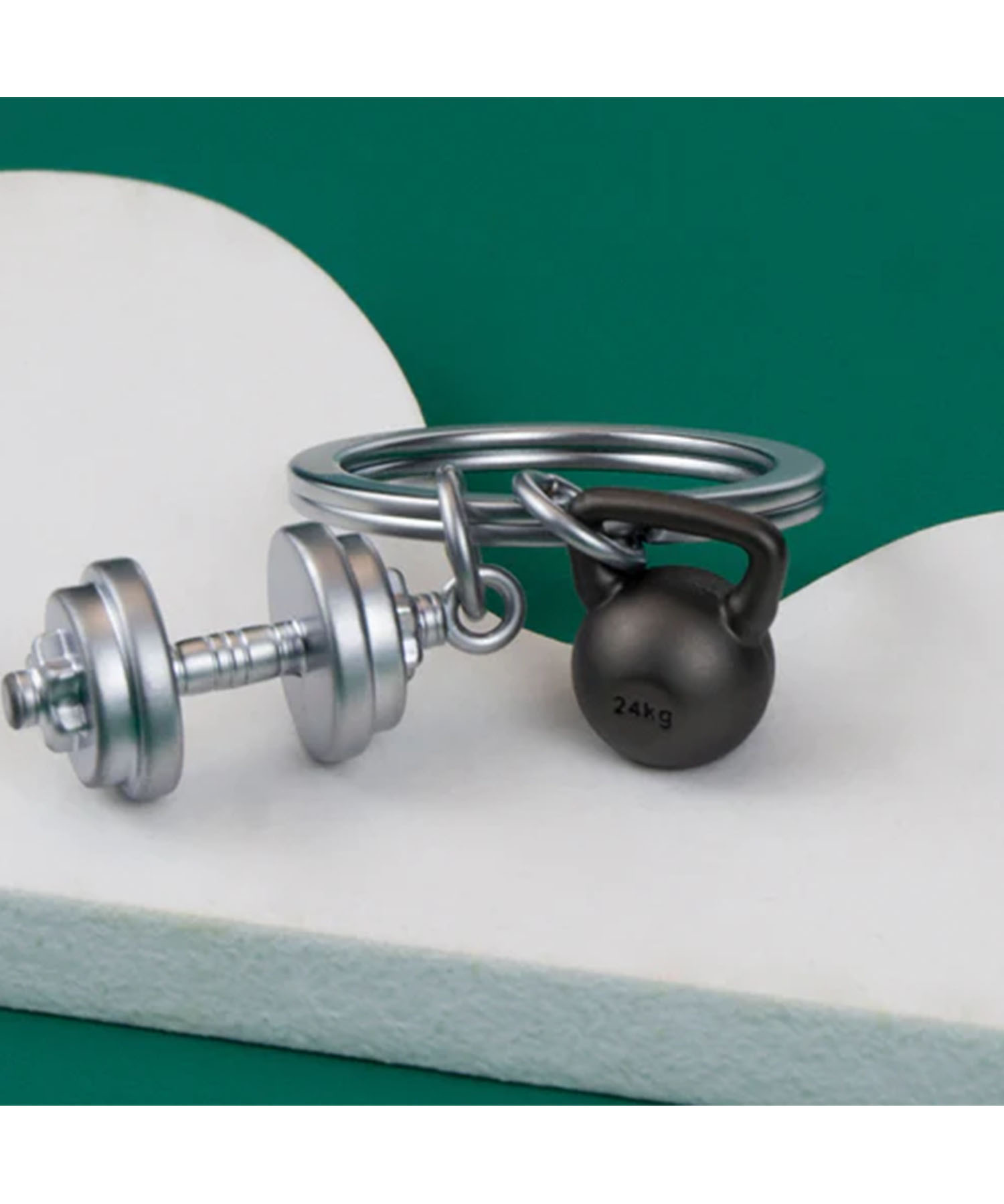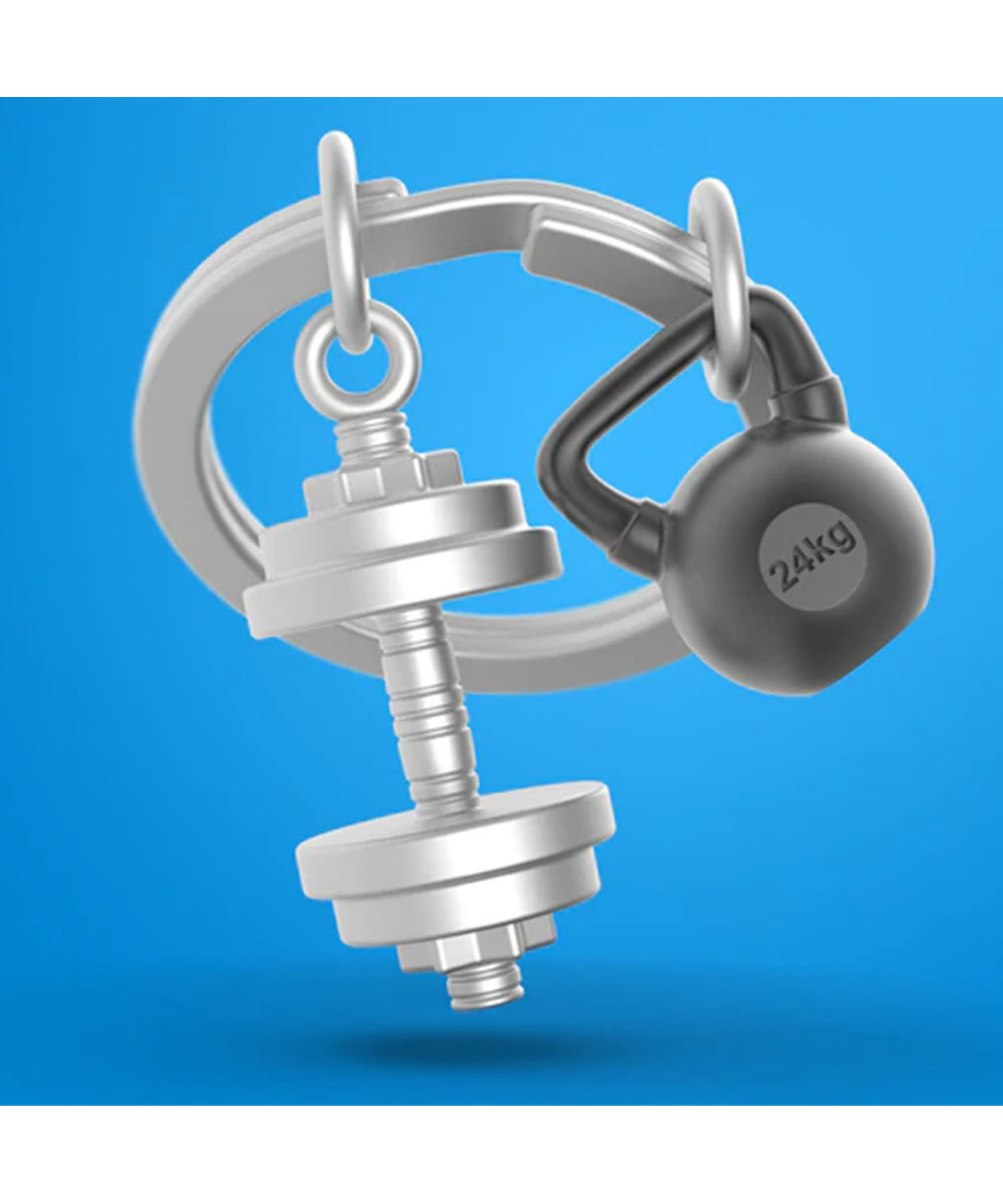 シルバーのダンベルと、24kgケトルベルをモチーフにしたキーホルダー。