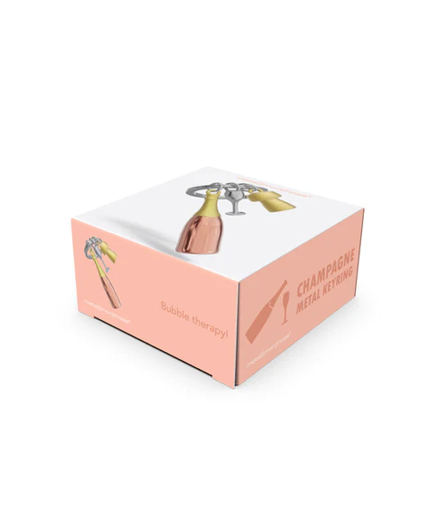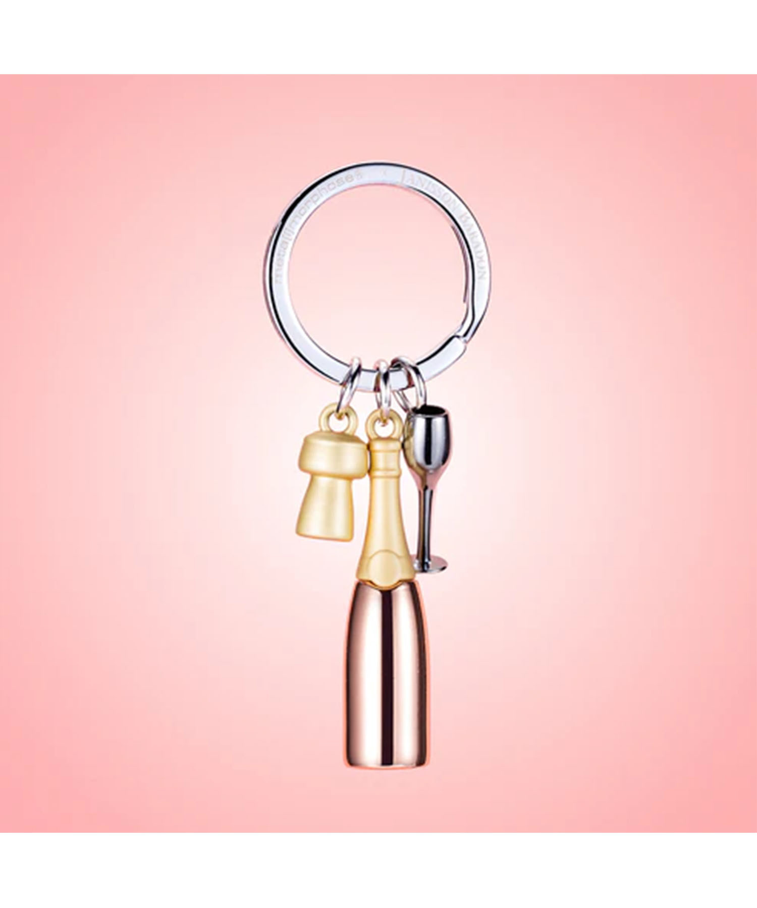 シャンパンボトル、コルク、グラスがセットになったキーホルダー。