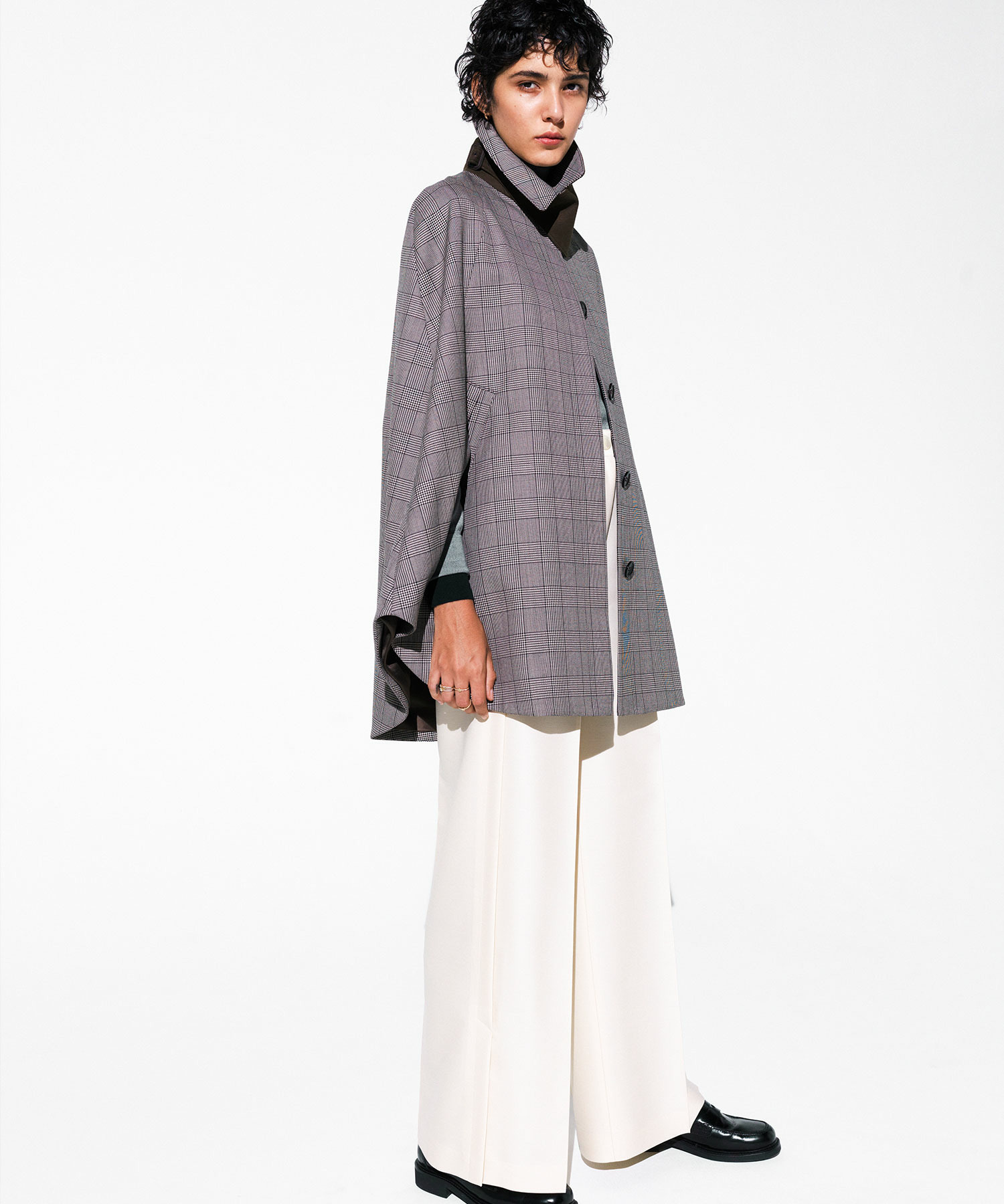 トレンド感のあるシックなチェック柄が印象的なケープコート。
