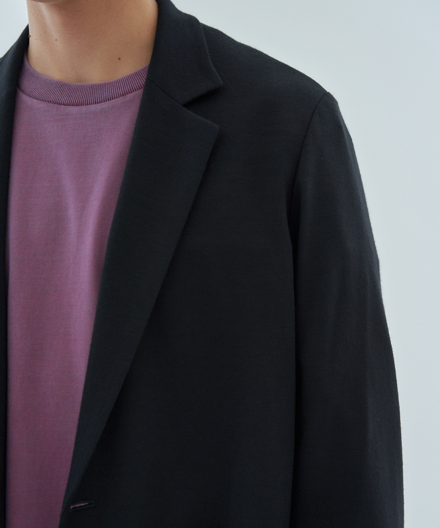 毛足の長い統毛によって、より滑らかで上品な光沢を持つ生地は、特注の36ゲージ丸編み機を使い、限界まで細い1/60の糸で高密度に編み立てることで、タイプライターのようなハリ感と構築的な表情を実現。さらに、最終工程で縮加工を施すことで、軽く毛羽立たせ、ハイゲージメルトンのような質感を持たせています。さらりとした肌触りと、程よくゆとりのあるシルエットで快適な着用感です