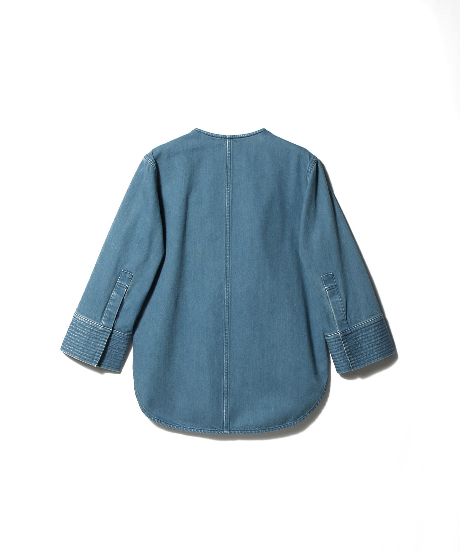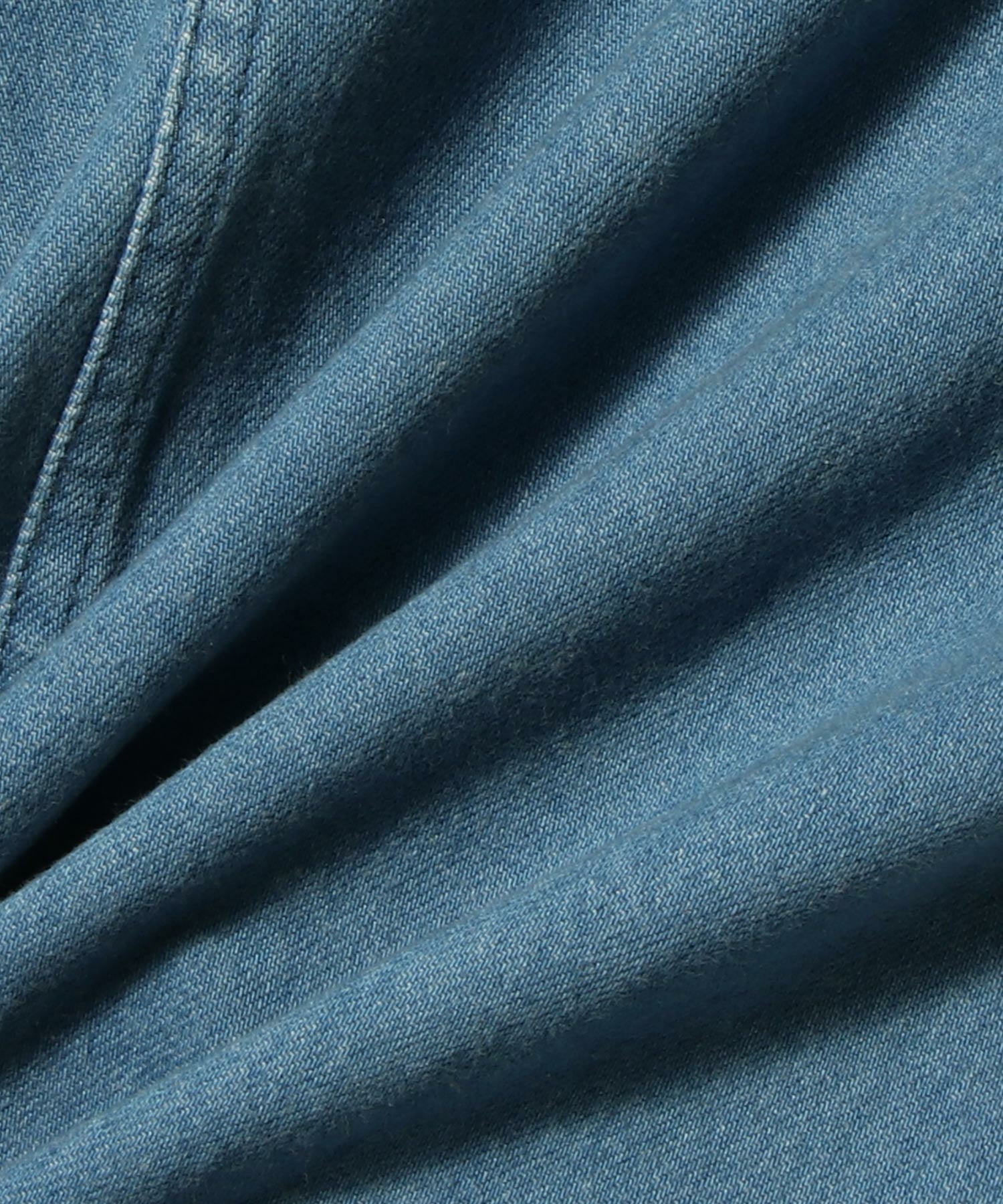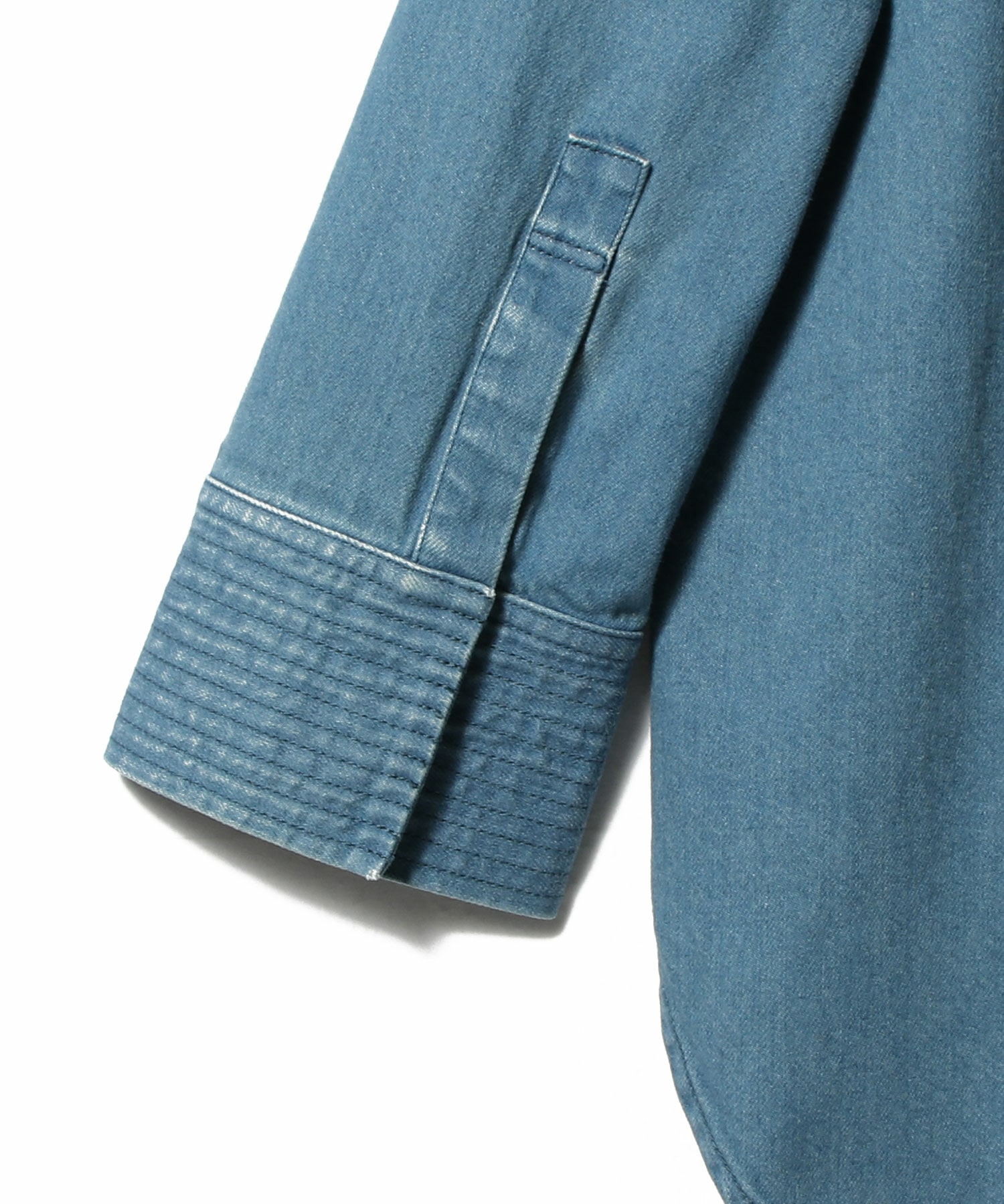 太めの前立てと袖カフスに連続して入ったステッチが特徴のデニムシャツ。