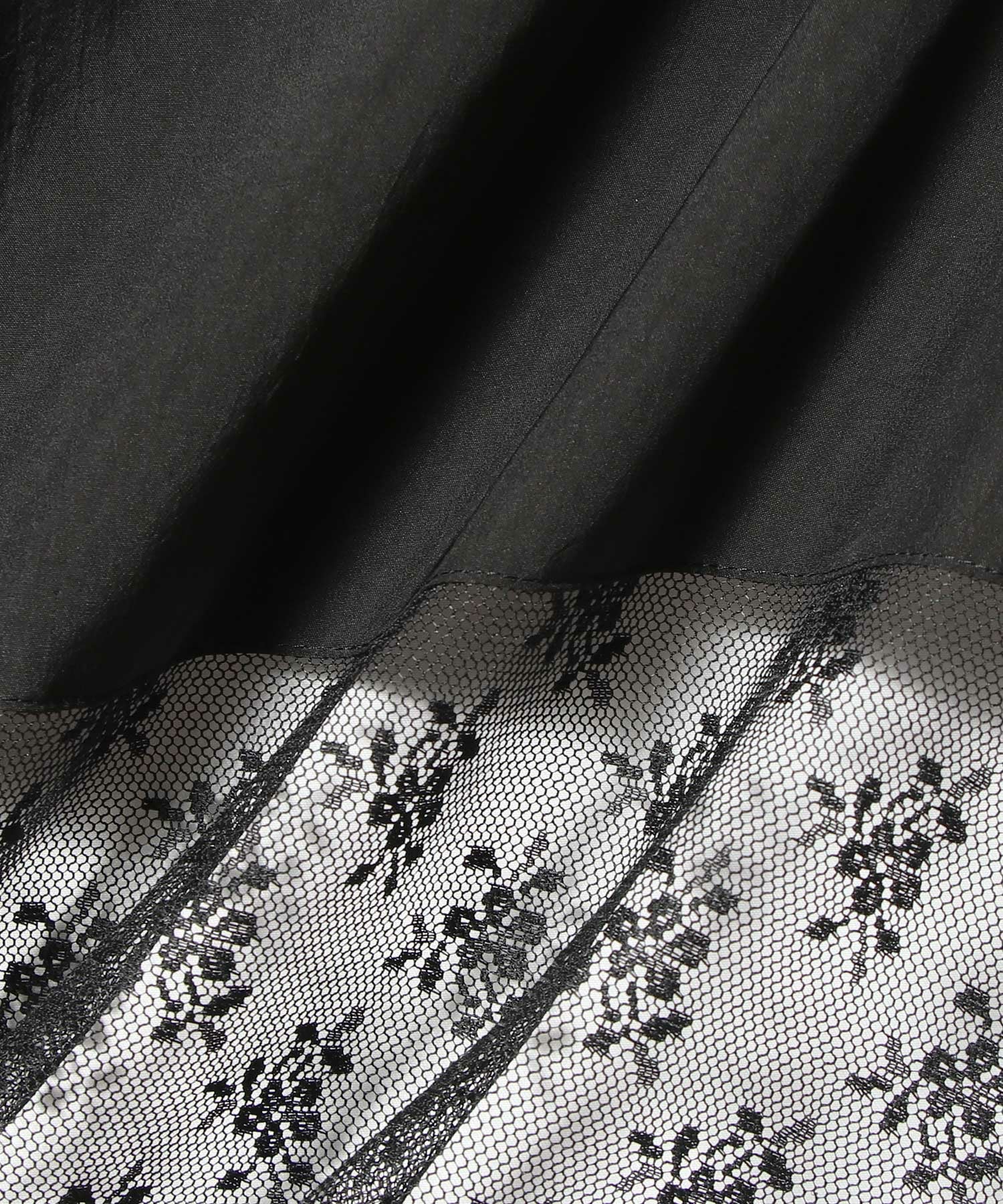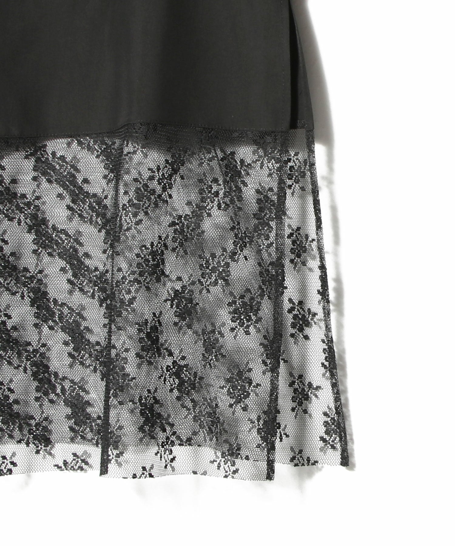 ポリエステルの羽二重をベースに、小花柄のラッセルレースを重ねた上品な素材感に仕上げました。華奢なレースディテールと、サイドの深めのスリットが抜け感をプラス。