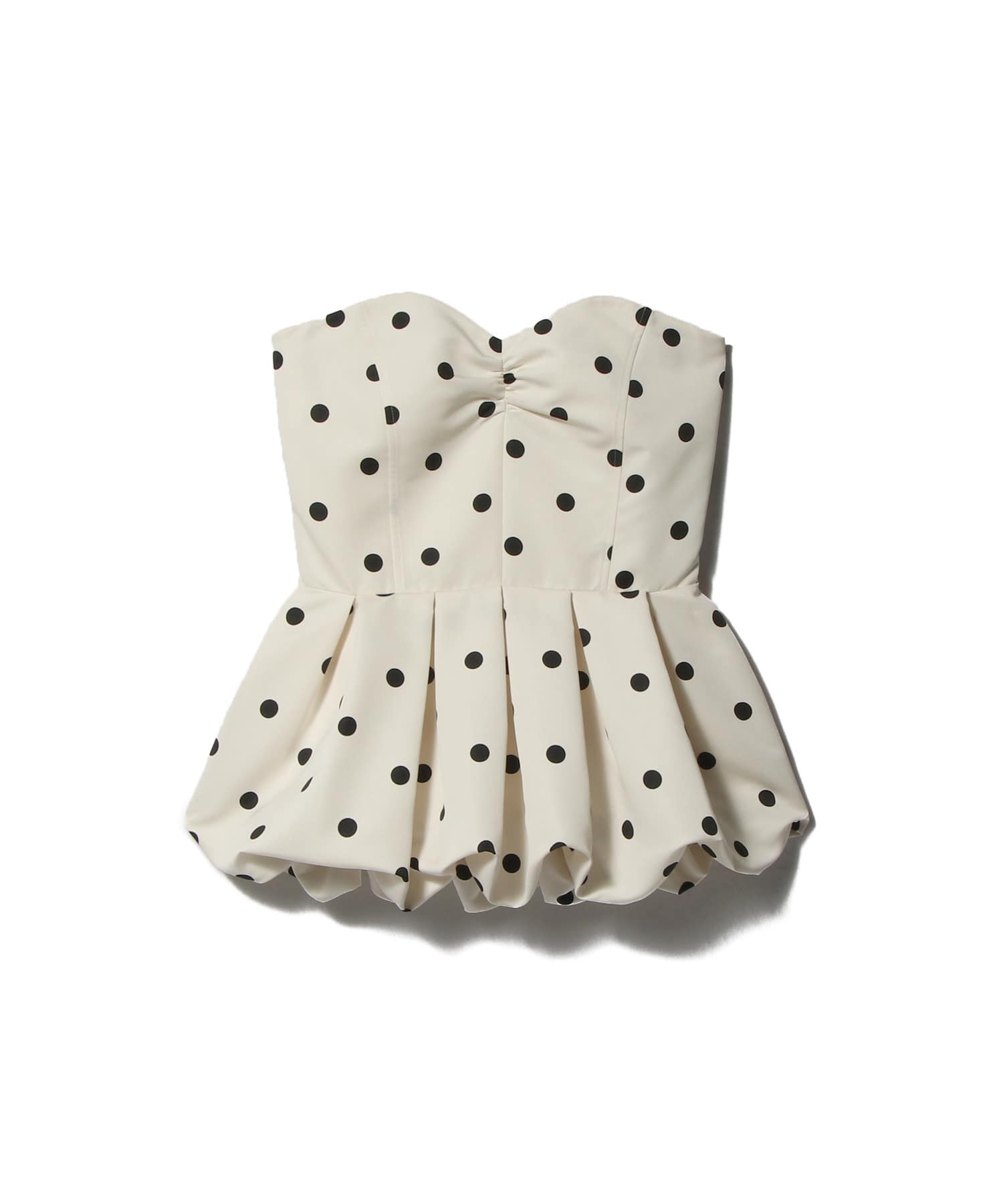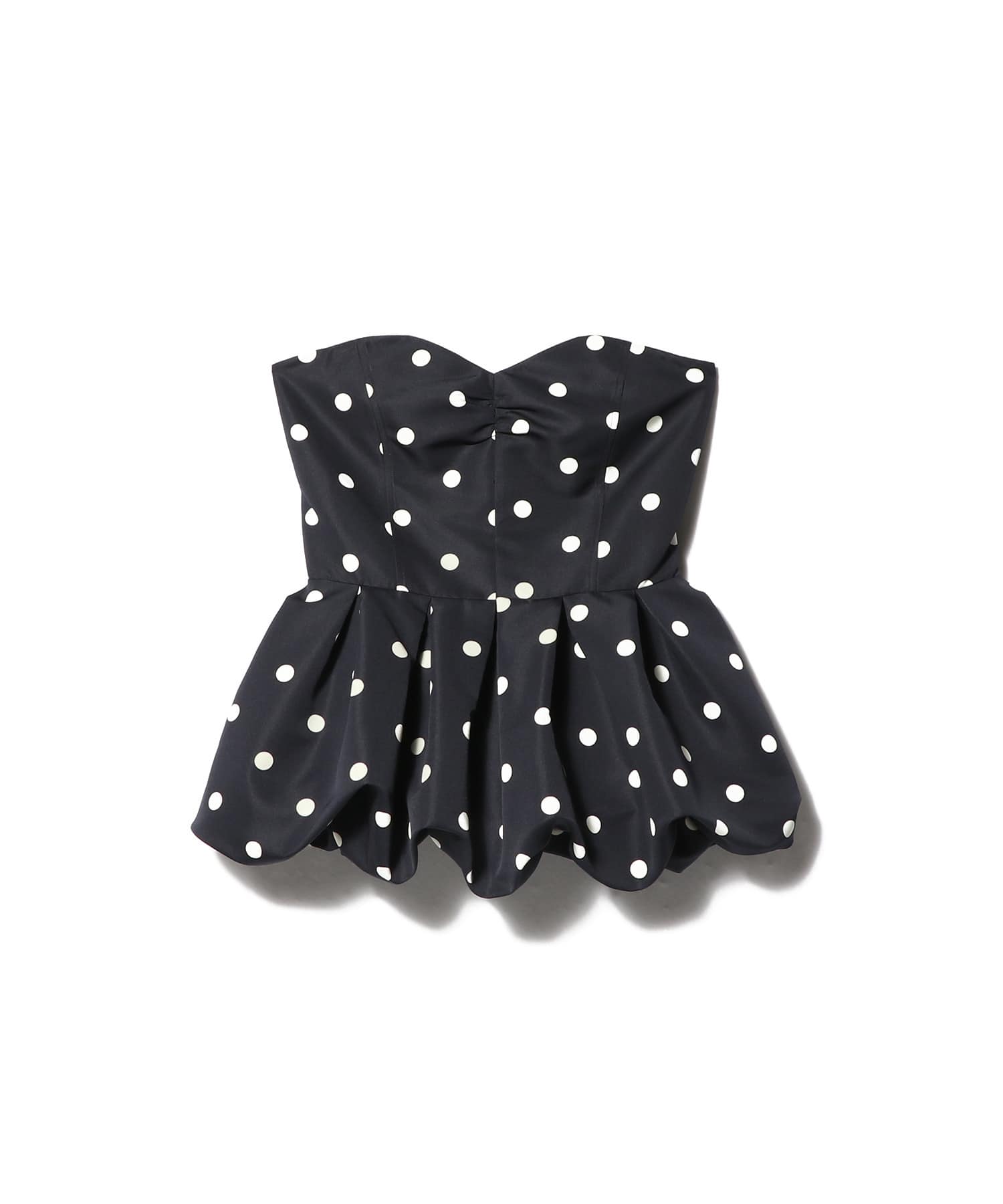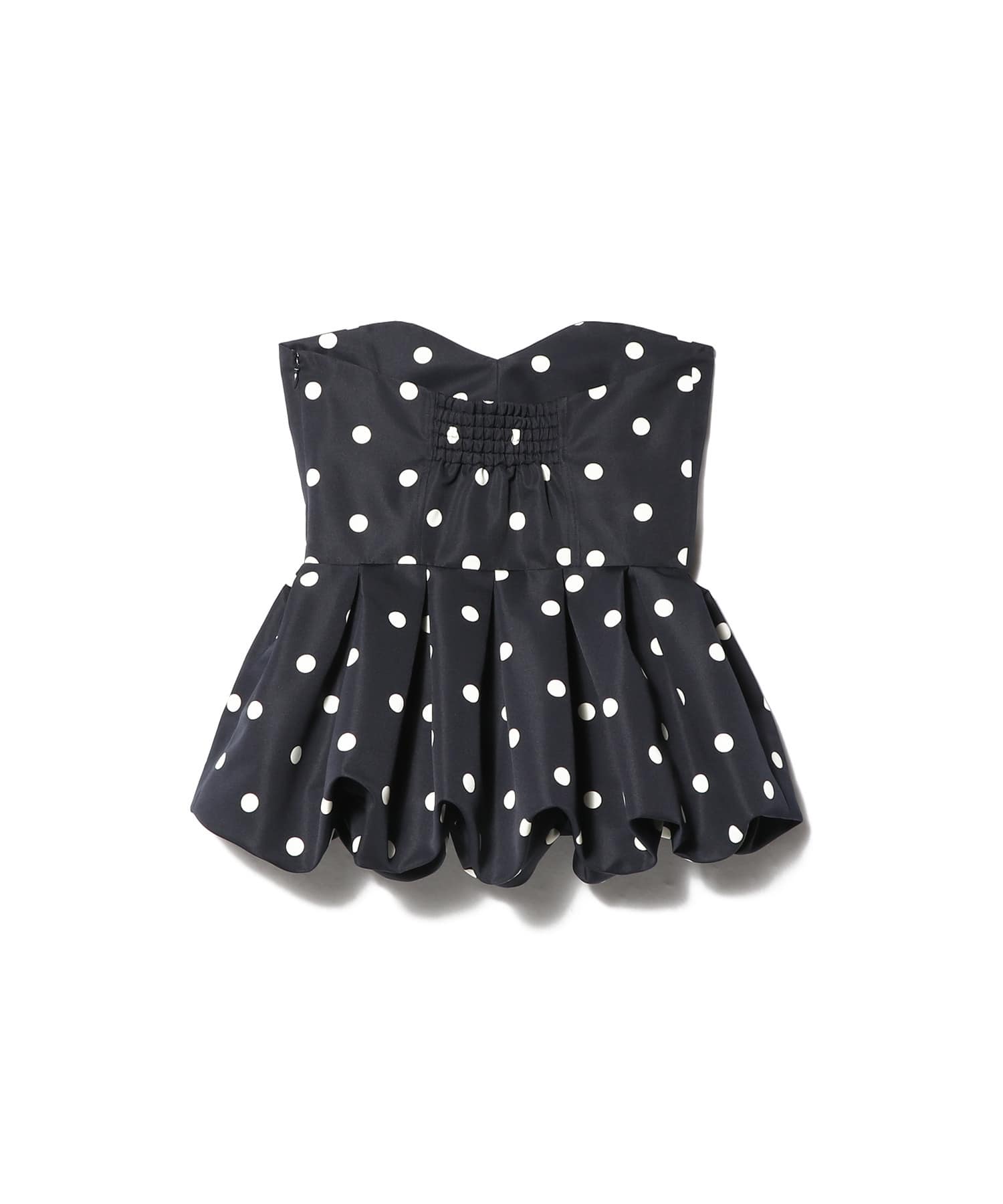 タイトなチューブトップにバルーンペプラムを組み合わせ、メリハリのあるシルエットに。
